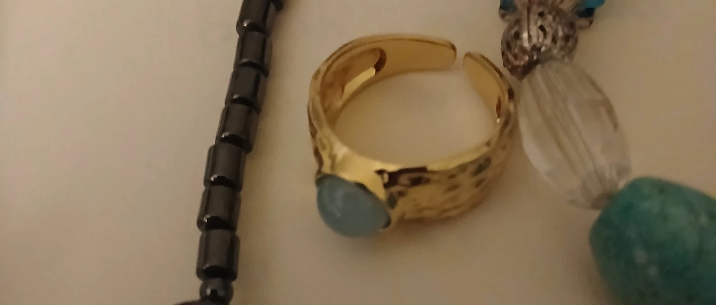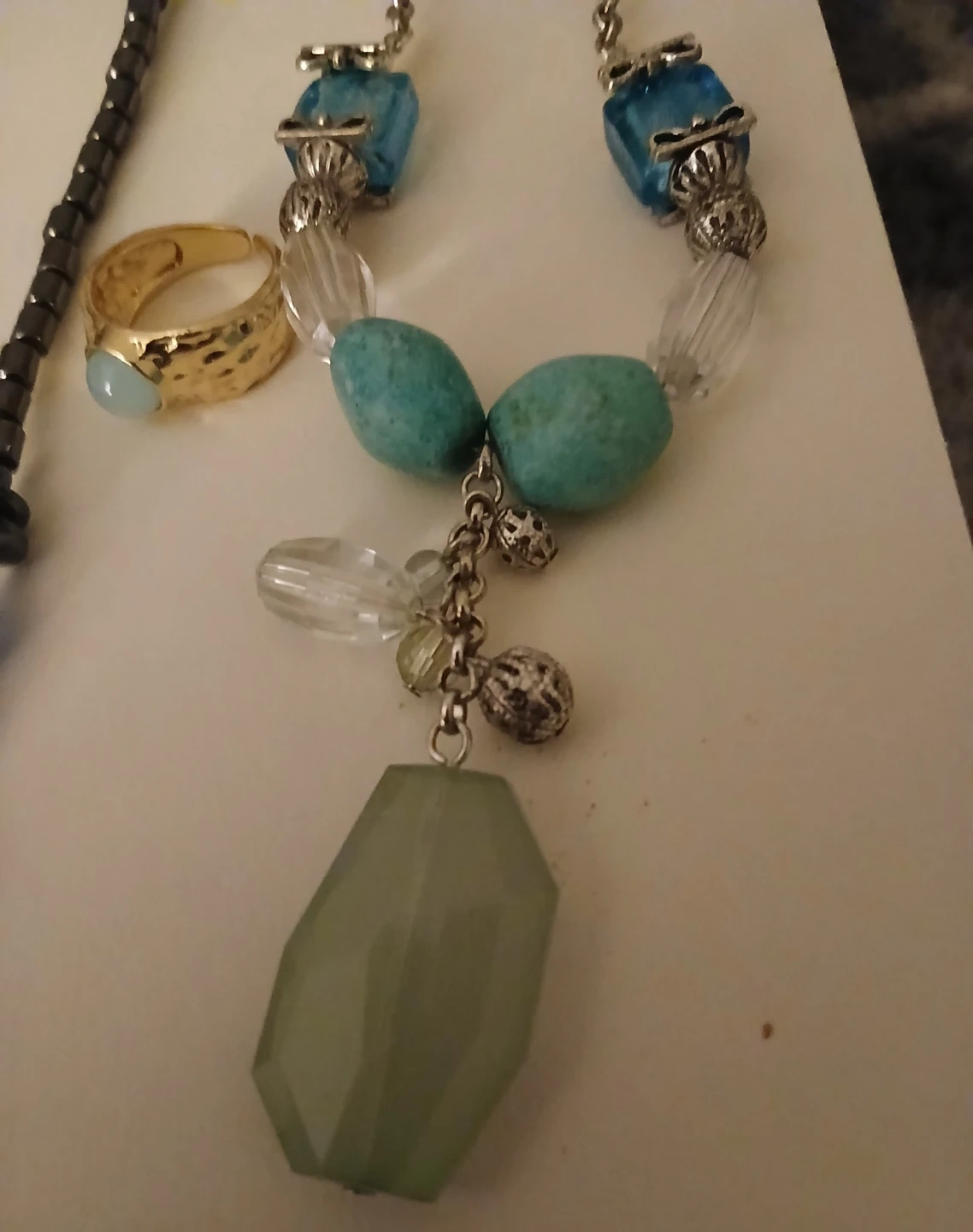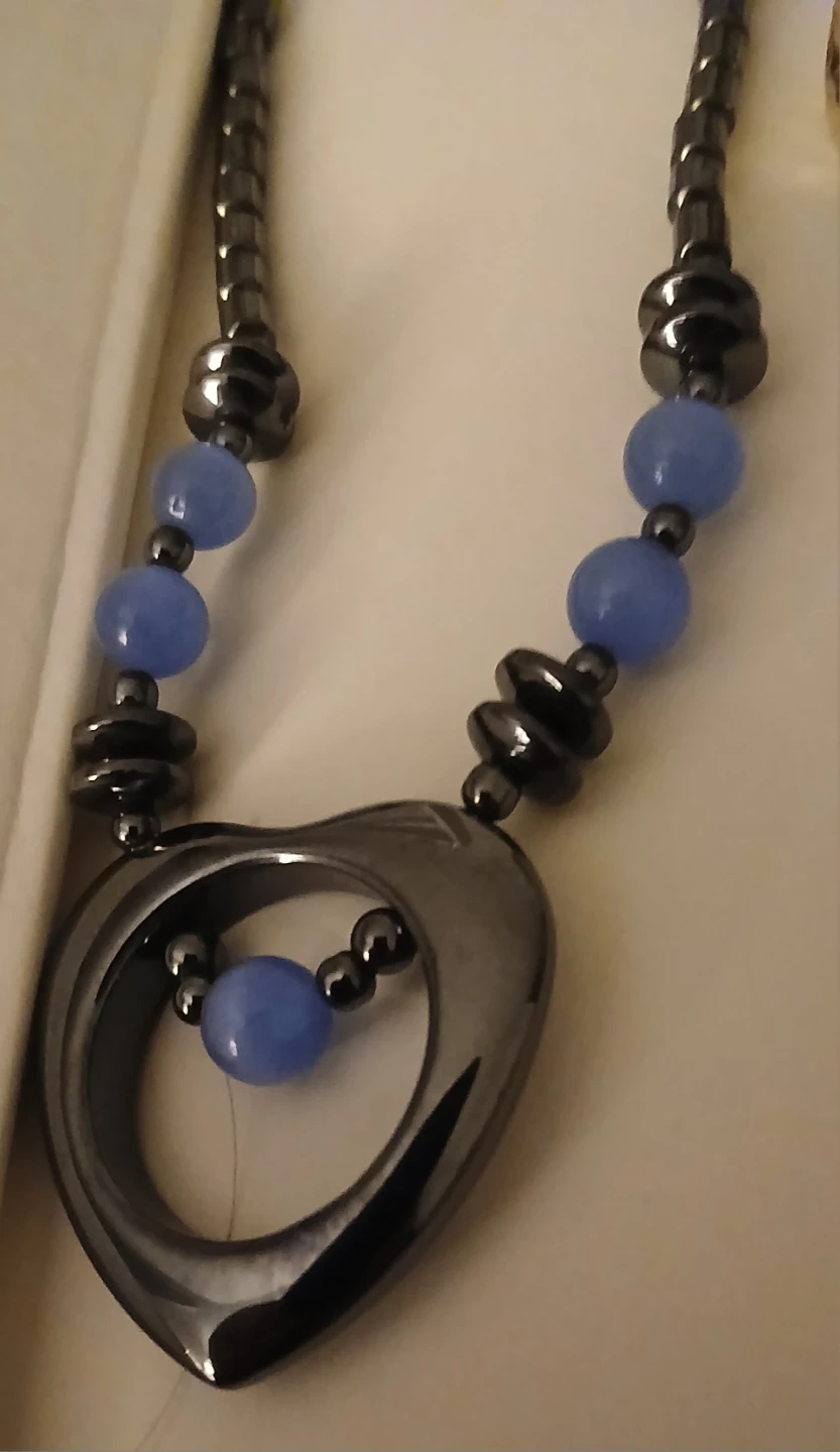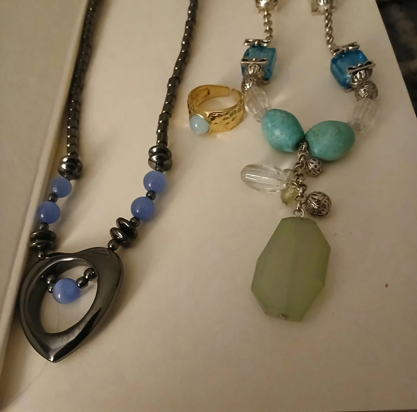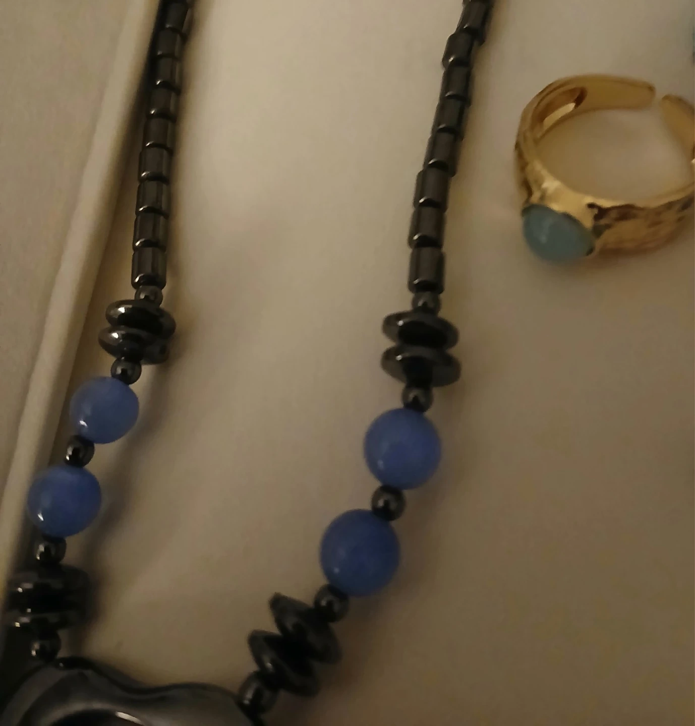 This necklace features a dark grey heart-shaped pendant with blue and black beads. It's paired with a matching beaded chain. A gold-toned ring with a light blue stone is also included.