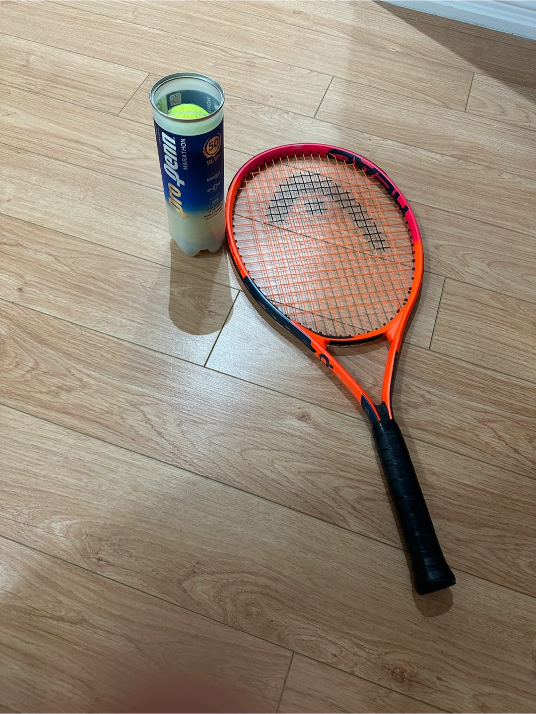 Head Instinct tennis racquet in orange and black. Comes with a tube of Pro Penn Marathon tennis balls. This set is ready for your next match!