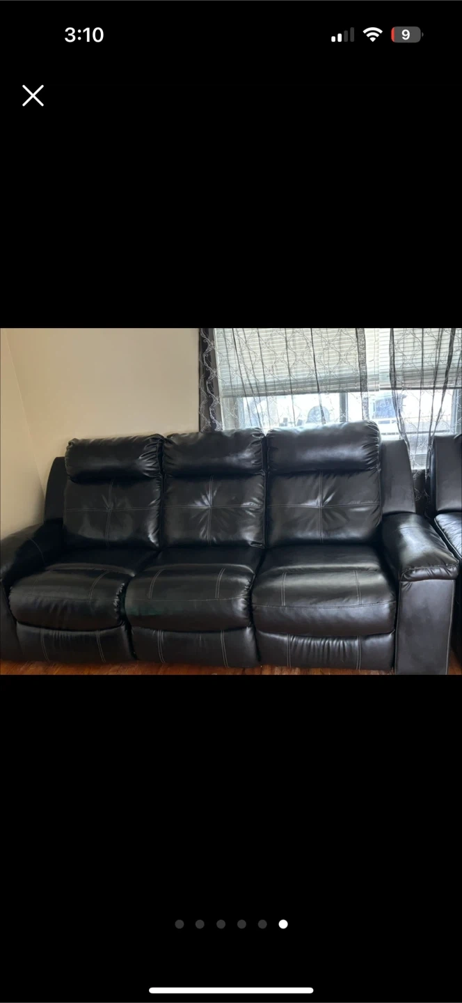 This is a black leather three-seater recliner sofa. It features plush cushions and reclining seats for ultimate comfort. The sofa is made of durable faux leather and has white stitching details.