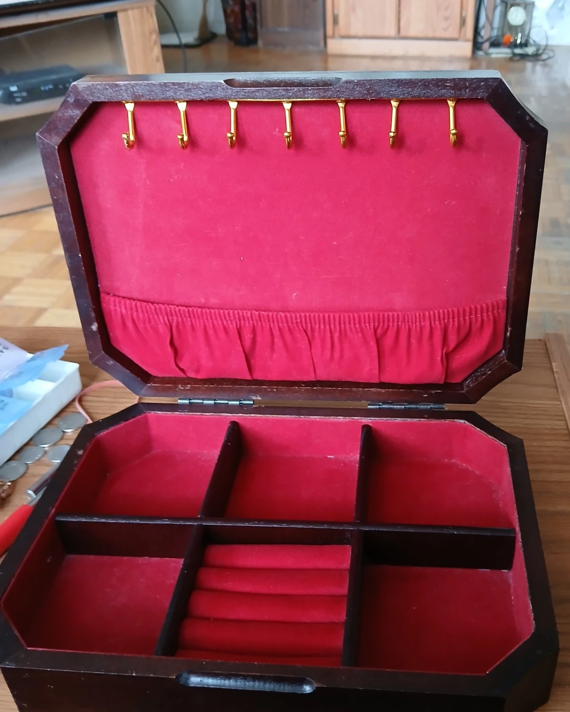 This is a lovely wooden jewellery box. It has a dark wood finish with a red velvet lining. Plenty of compartments for organizing rings, necklaces, and other accessories. The lid also has hooks for hanging necklaces or bracelets!