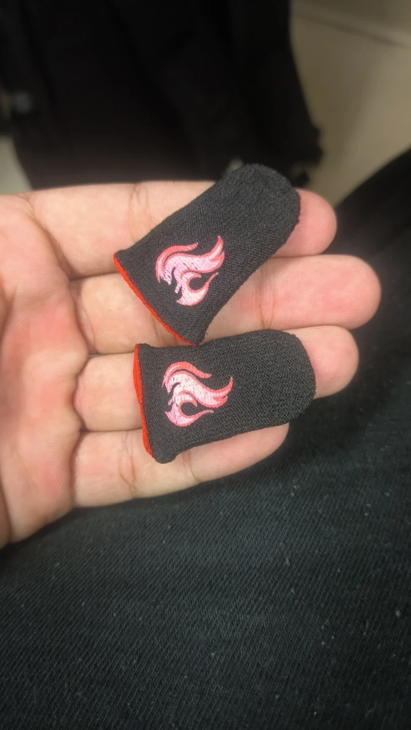 These are black gaming finger sleeves with a pink flame logo. They're made of breathable fabric for comfort during long gaming sessions. The red trim adds a nice contrast. They're designed to improve touch screen accuracy and prevent finger sweat.