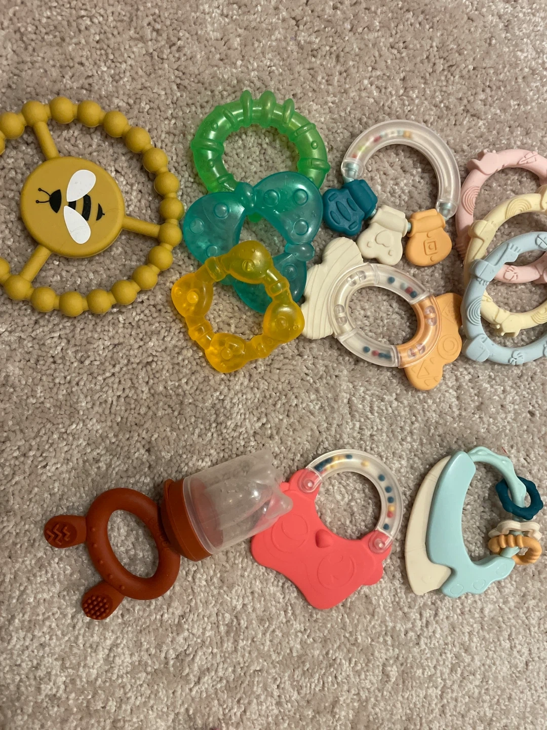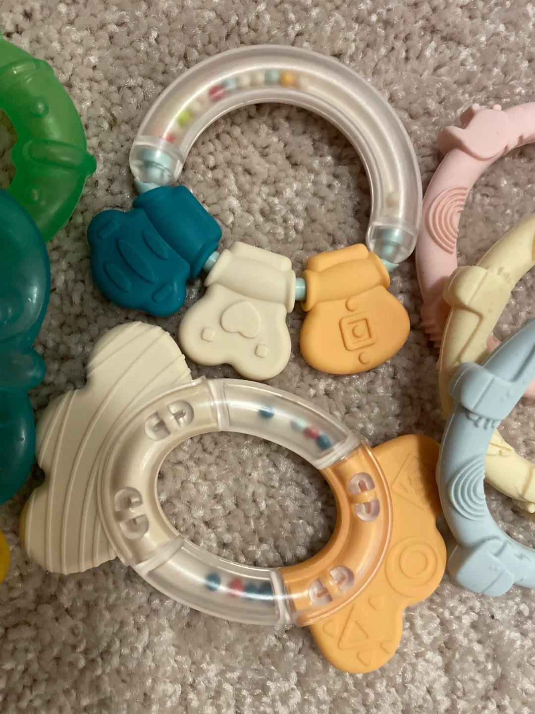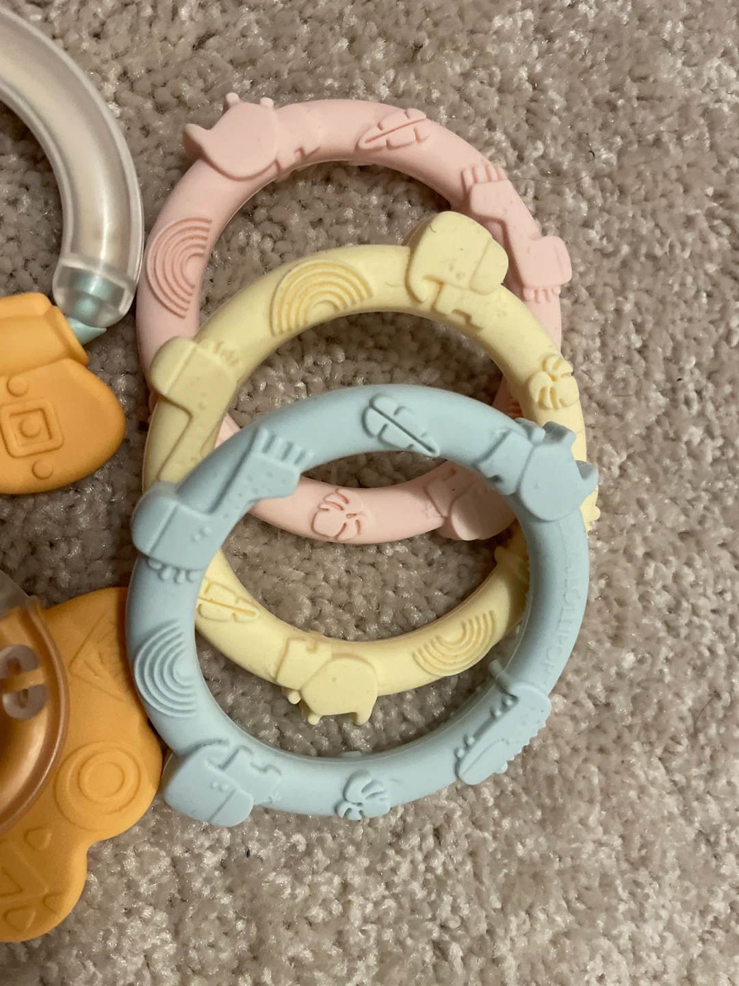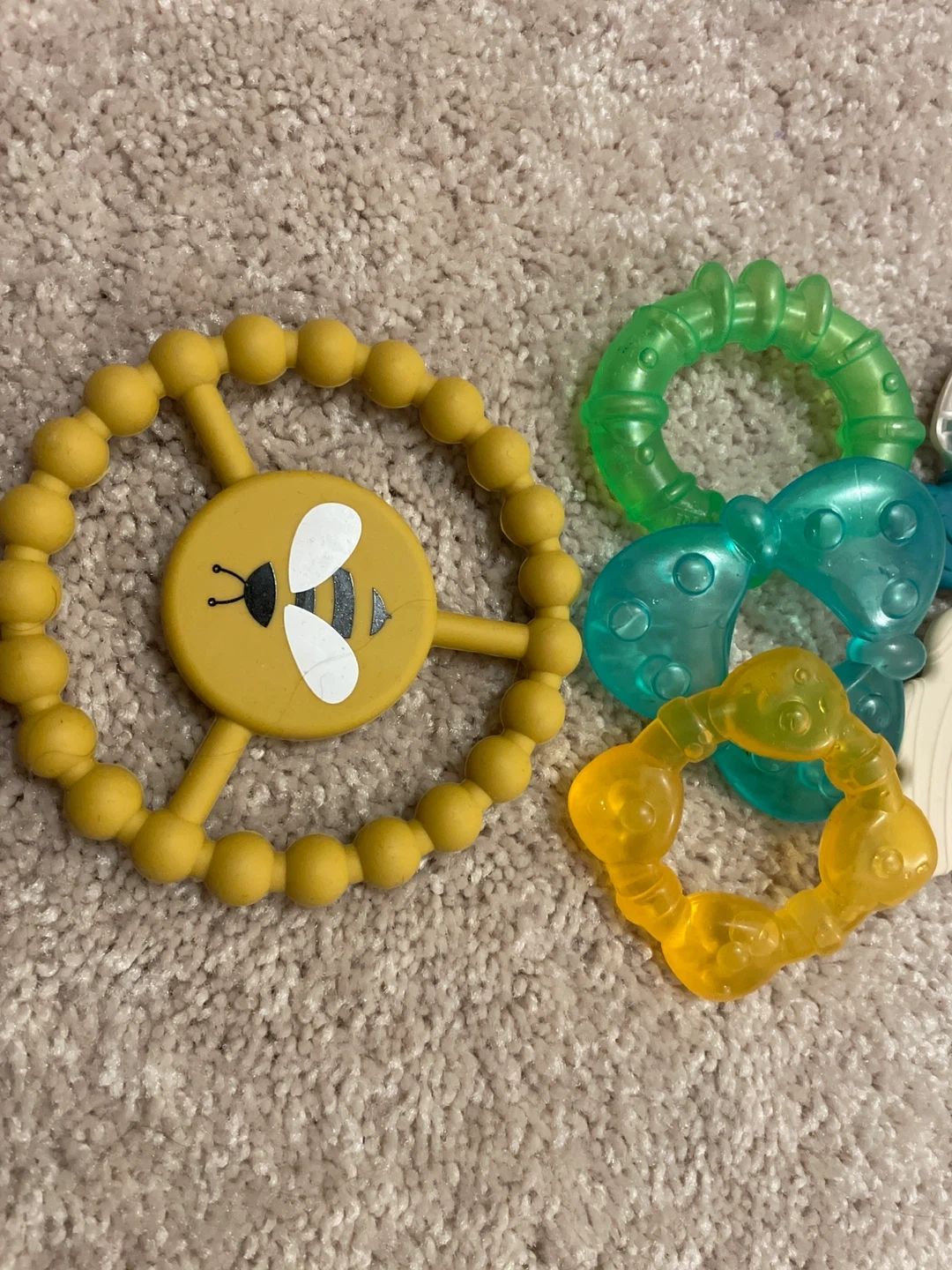 A collection of baby teethers in various shapes and colours. Includes a yellow bee-shaped teether, clear teethers with beads, and pastel-coloured ring teethers. Made from safe, chewable materials for little ones.