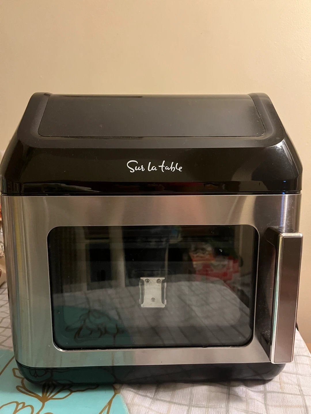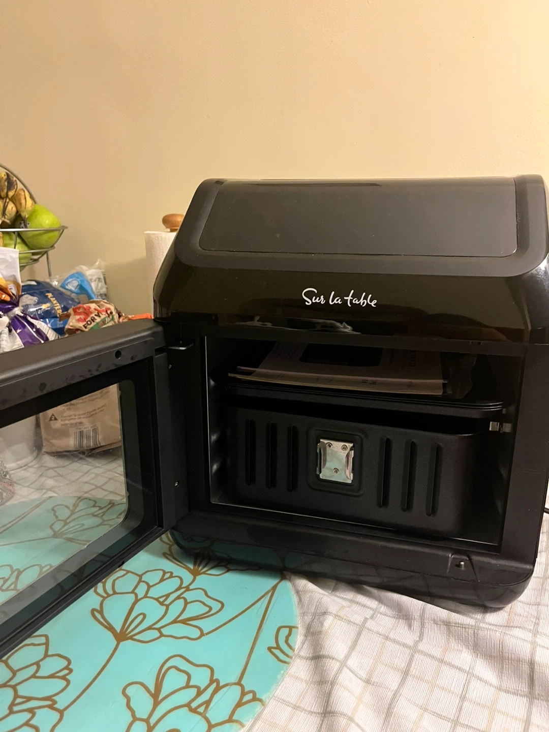 This Sur la table air fryer oven is 13 quarts. It's a multifunctional kitchen appliance. Includes owner's manual and recipe book.