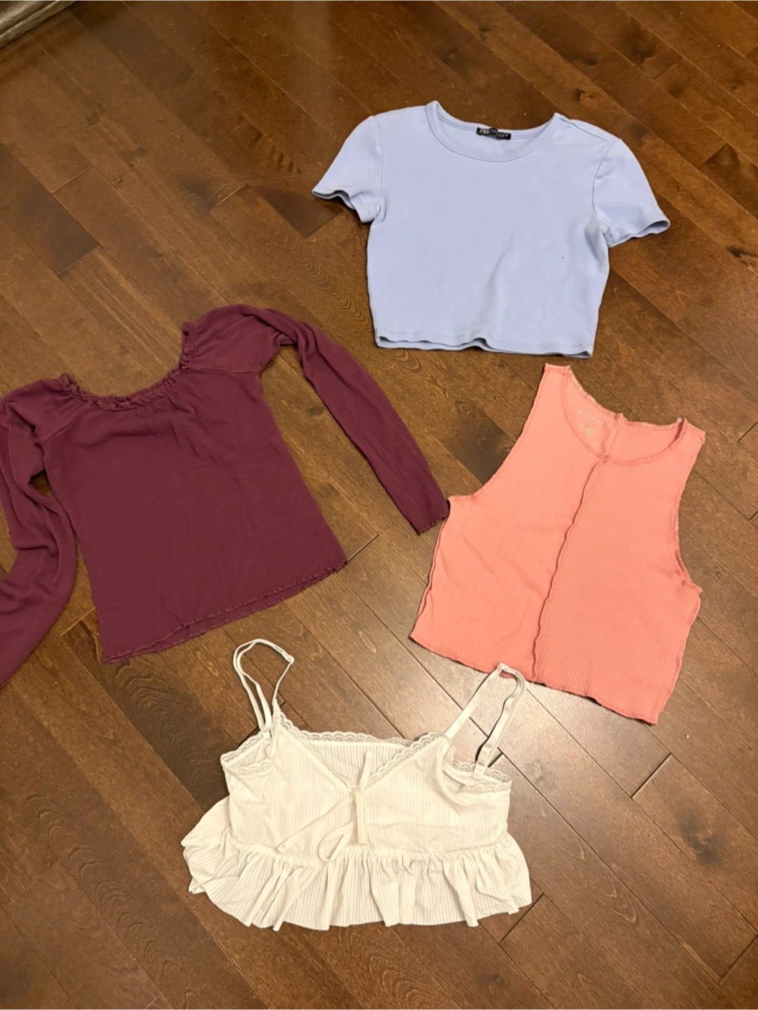 Includes a light blue crop top, a burgundy off-the-shoulder top, a pink ribbed tank, and a white lace cami. Different styles for layering or wearing on their own. Ribbed knit fabric on most.
