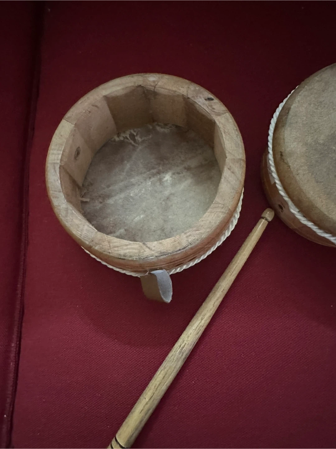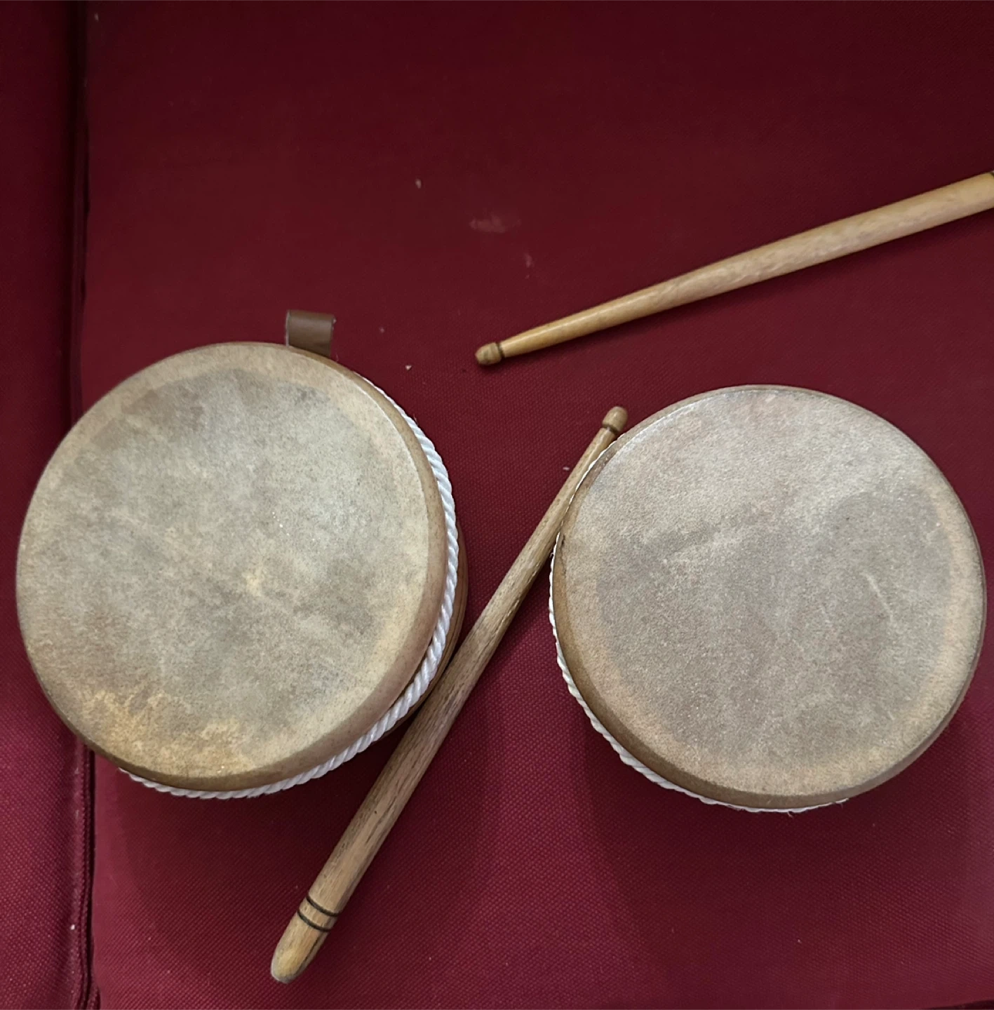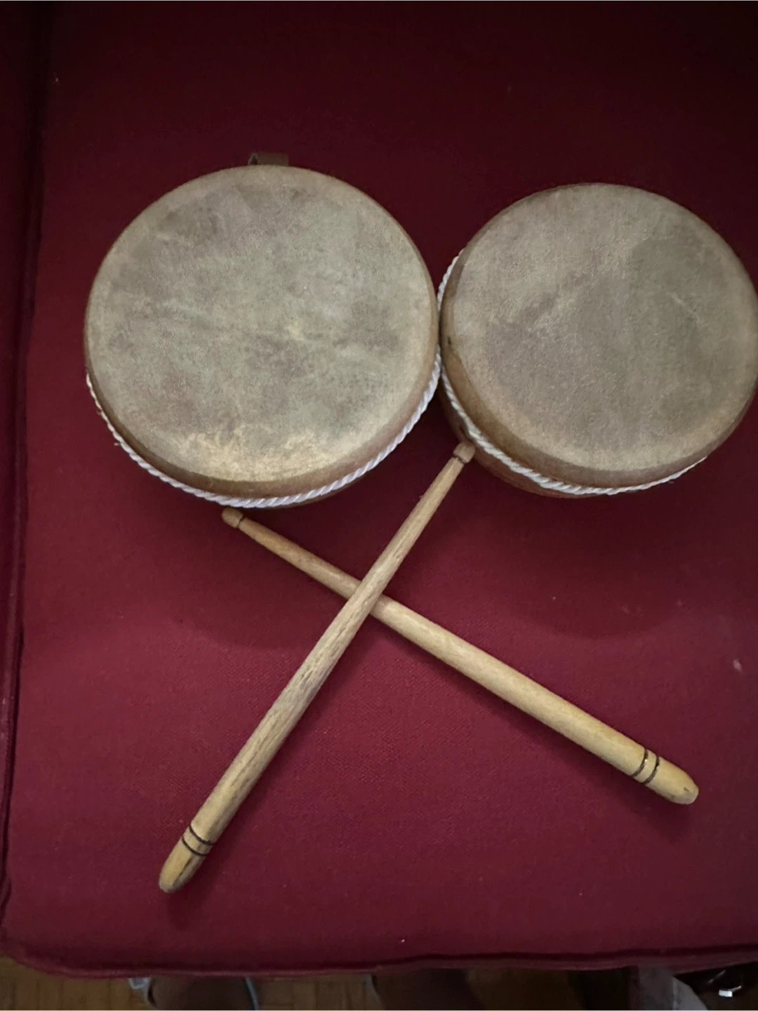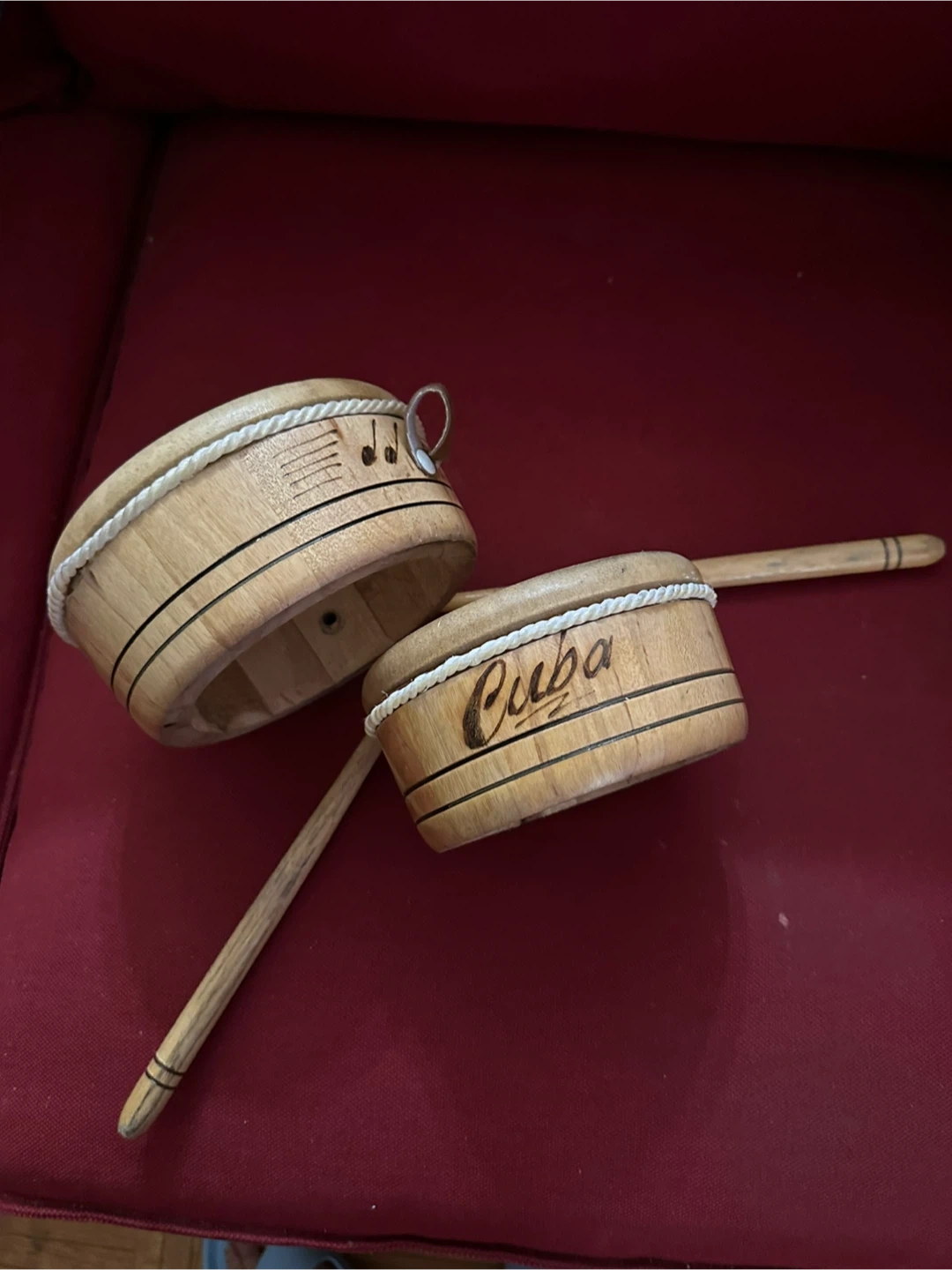Small wooden bongos with "Cuba" branding. Includes two wooden drumsticks. Made with natural wood and drum skin heads. These hand drums are perfect for a beginner musician or for decorative display!
