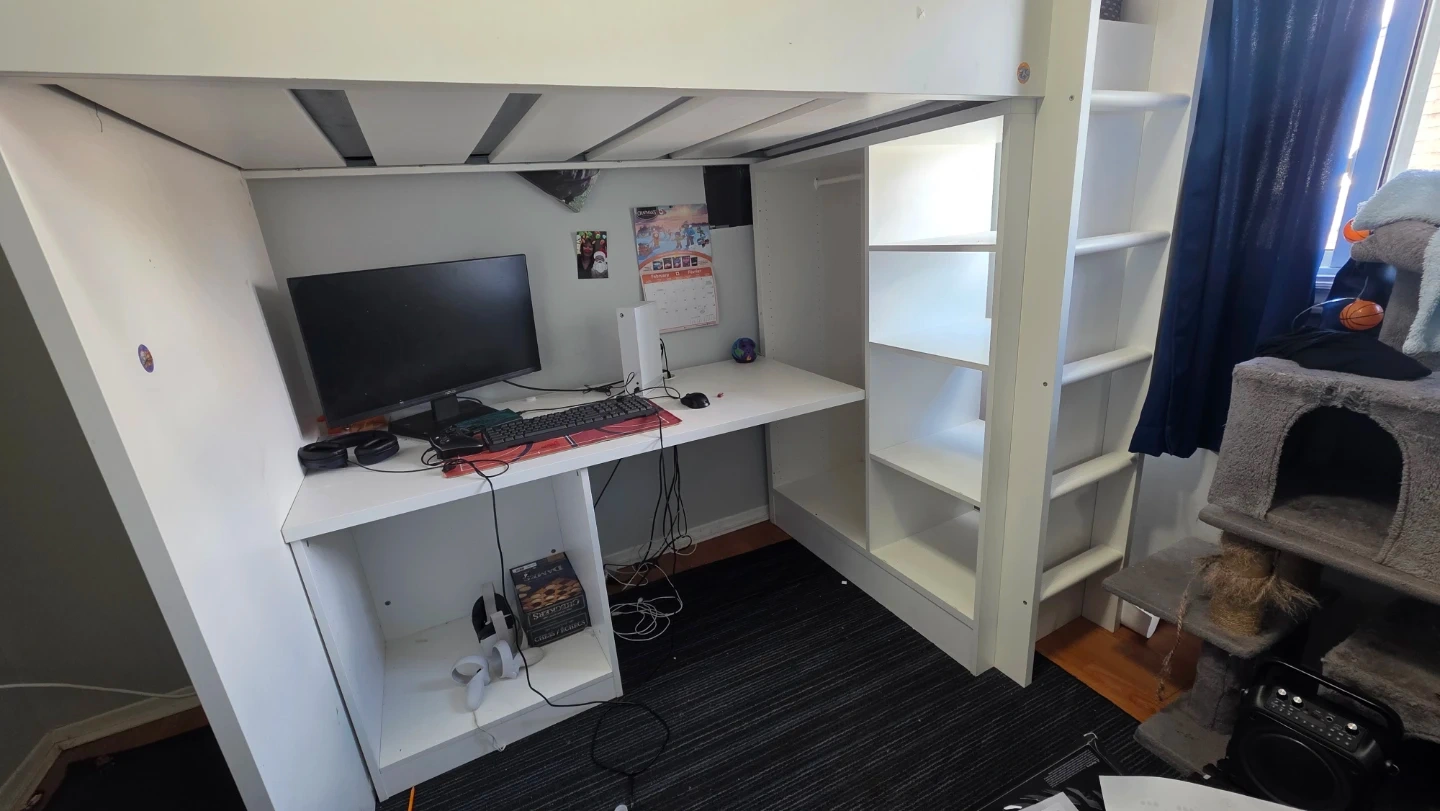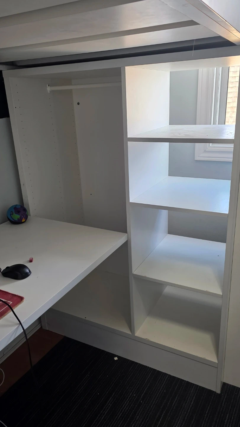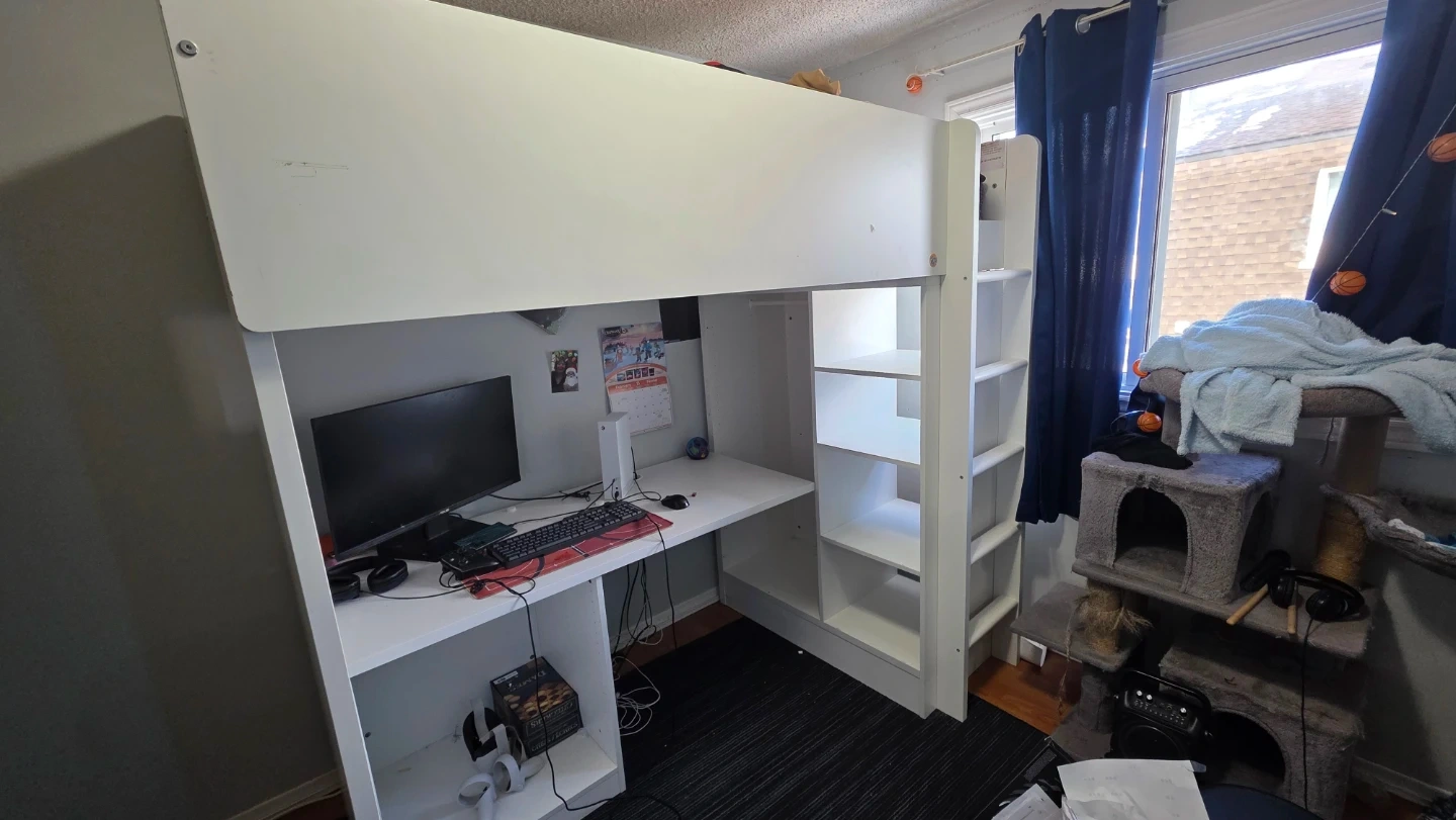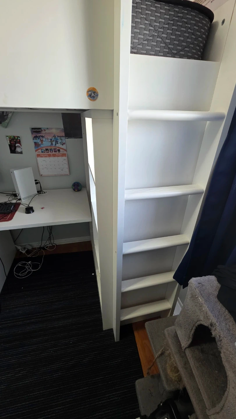 White loft bed with an integrated desk and shelving unit. It's great for maximizing space in smaller rooms. The unit features a sturdy ladder for access to the loft.