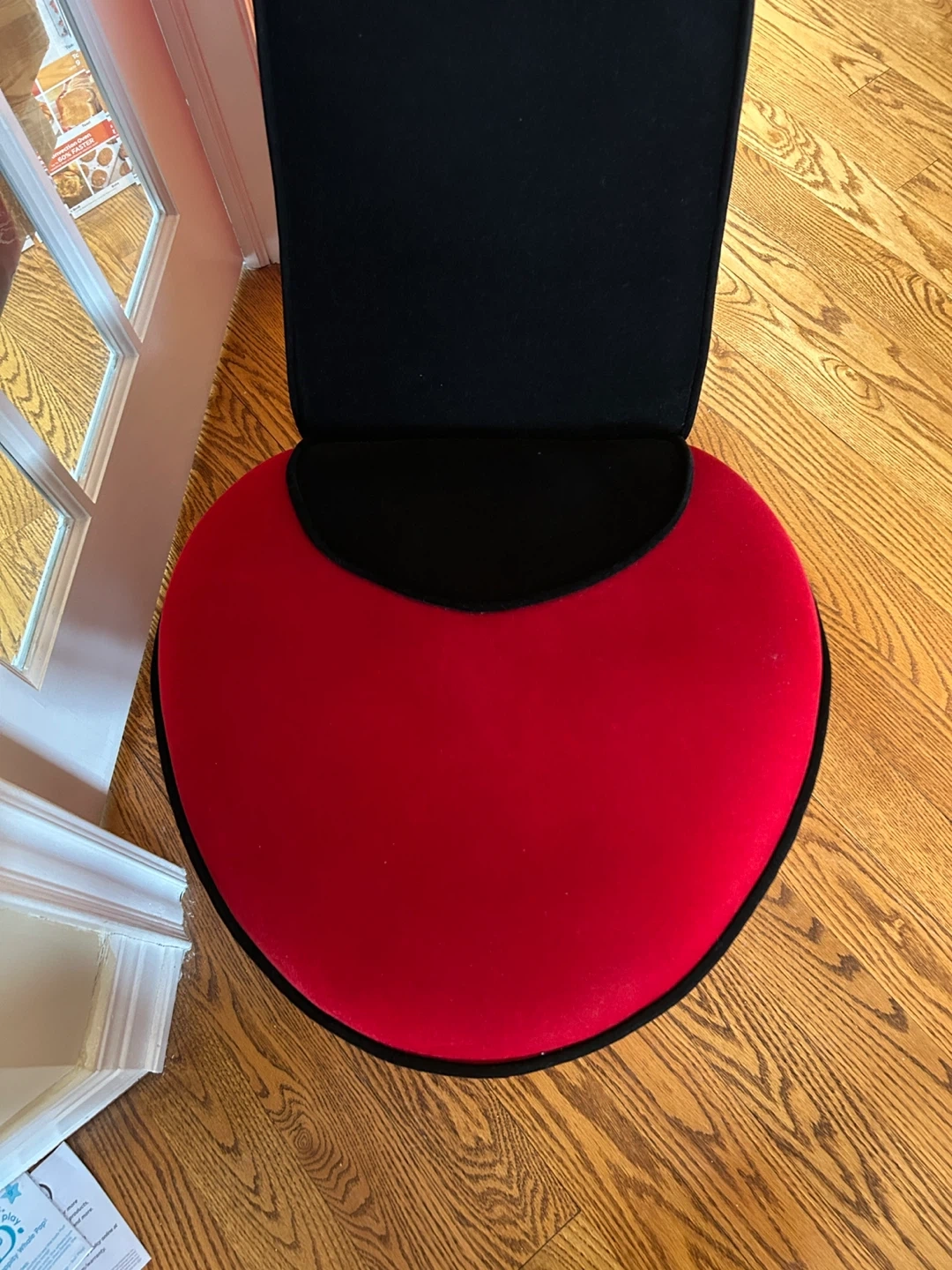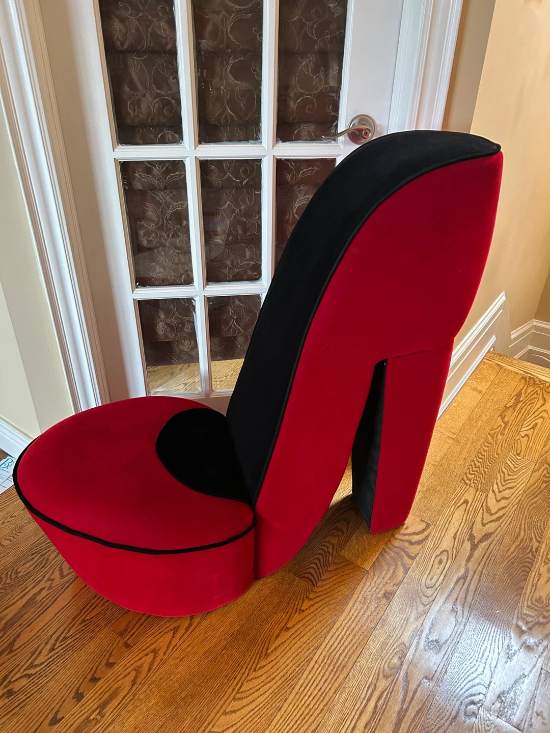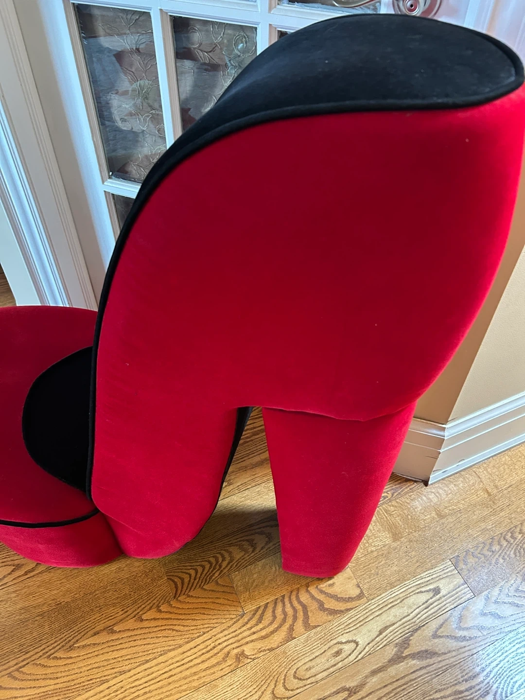 Unique novelty chair shaped like a high heel shoe. Red velvet exterior with a black accent. This statement piece is sure to be a conversation starter in any room. Great for a vanity area or as a fun accent chair!