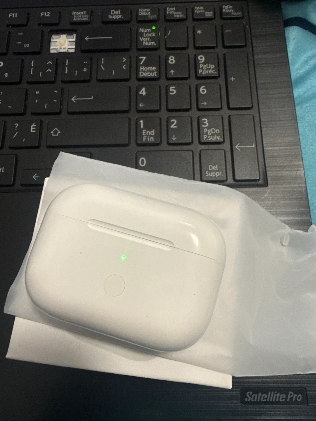 This is a replacement charging case for your AirPods Pro 1st or 2nd generation. It's white and includes the charging case itself. A green light indicates it's charging. This case is perfect for when your original charging case is lost or not working.