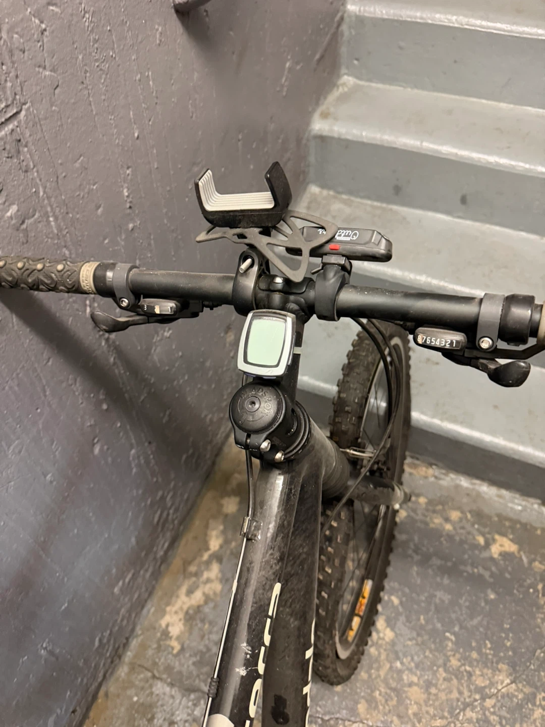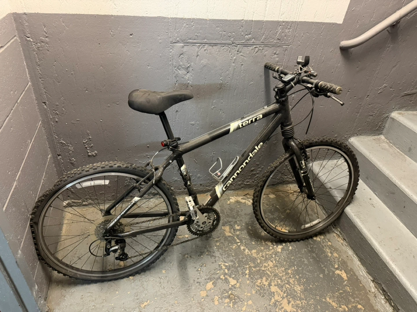 Black Cannondale Terra mountain bike with a water bottle cage. It's equipped with a bike computer and has multiple gears. This bike is ready for your next trail ride!