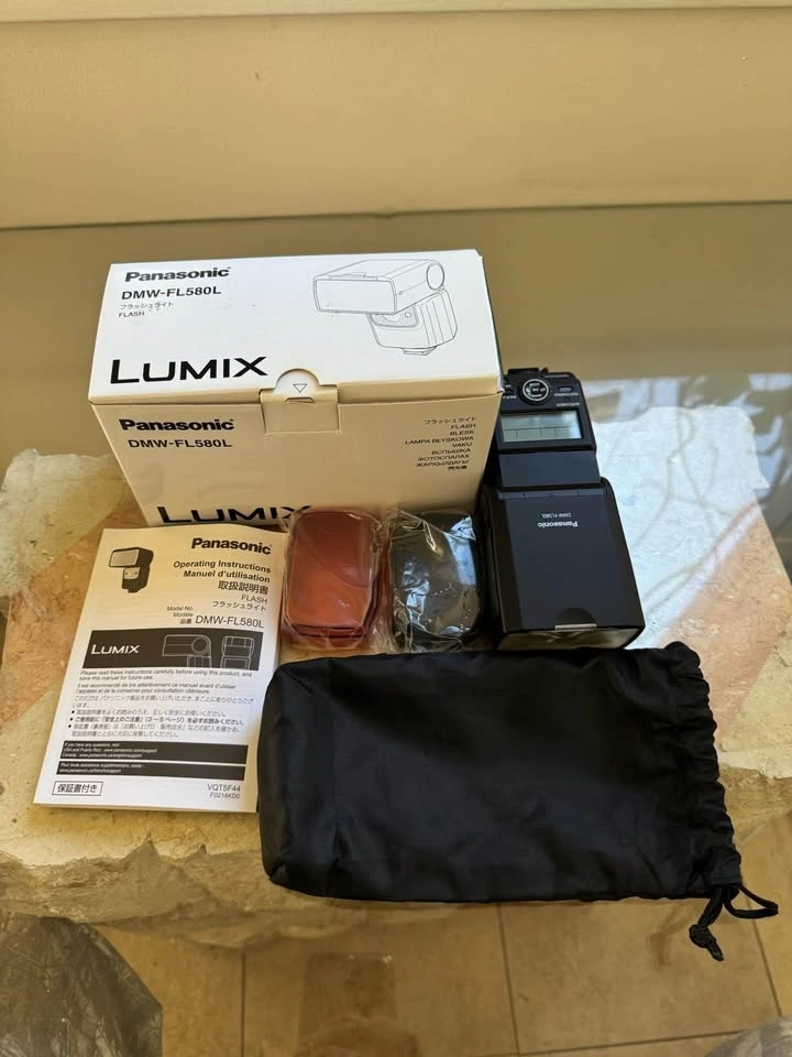 Panasonic LUMIX DMW-FL580L external flash in excellent condition. Fully functional, lightly used, and well cared for. Includes: Panasonic DMW-FL580L flash, original box, carry pouch, manuals & accessories (as shown). Powerful and reliable flash with bounce, swivel, TTL support, and fast recycle time. Great for portrait, event, and low-light photography. Compatible with Panasonic LUMIX cameras that support external flash. Clean condition. Ready to use. Pickup preferred. Cash or e-transfer.
