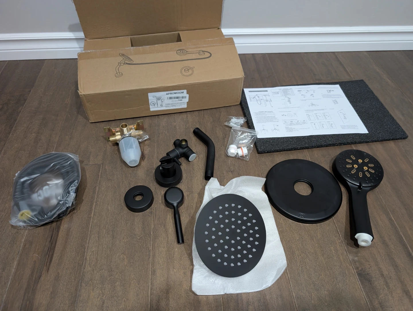 Brand new matte black round shower head faucet kit for sale. 6” inch rainfall showerhead, shower head arm, valve, handle trim kit, 6 spray setting hand shower wand, full kit with everything needed, $75 FIRM. Shower, Bathroom, Bath, Tub, Reno, Bathtub, Water, Tower, Massage, Rainfall, Waterfall, Jets, LED, Lights, Column, Valve, Wand, Spray, Renovation, Temperature, Pressure, Balanced, kit, system, trim
