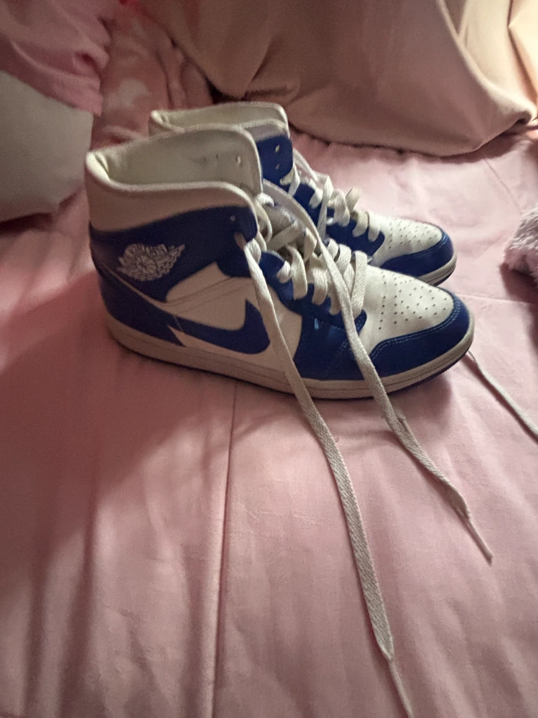 High-top Air Jordan 1 sneakers in royal blue and white. Leather and synthetic upper. Lace-up closure. Includes original laces.