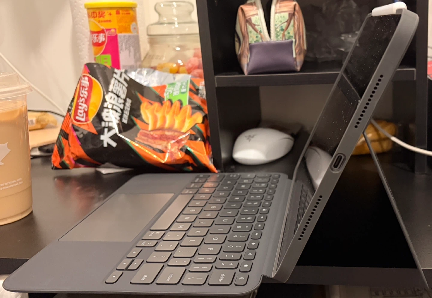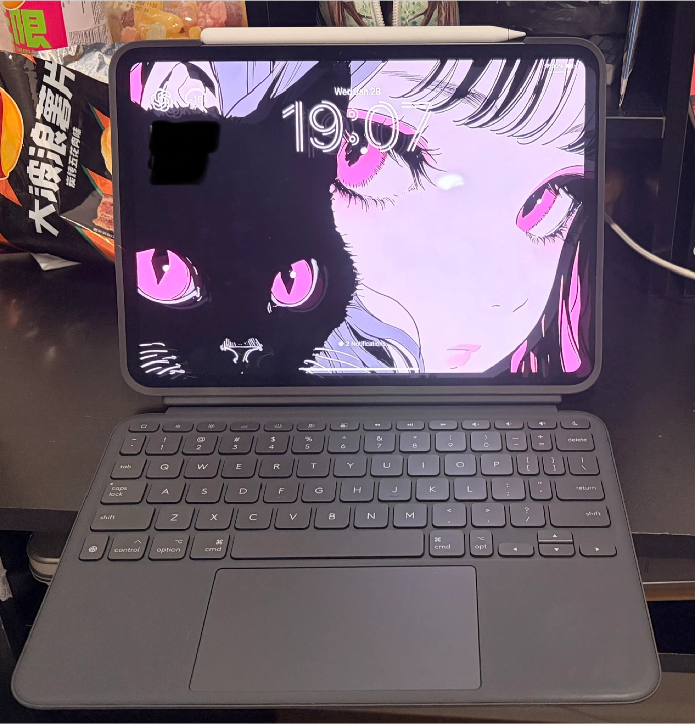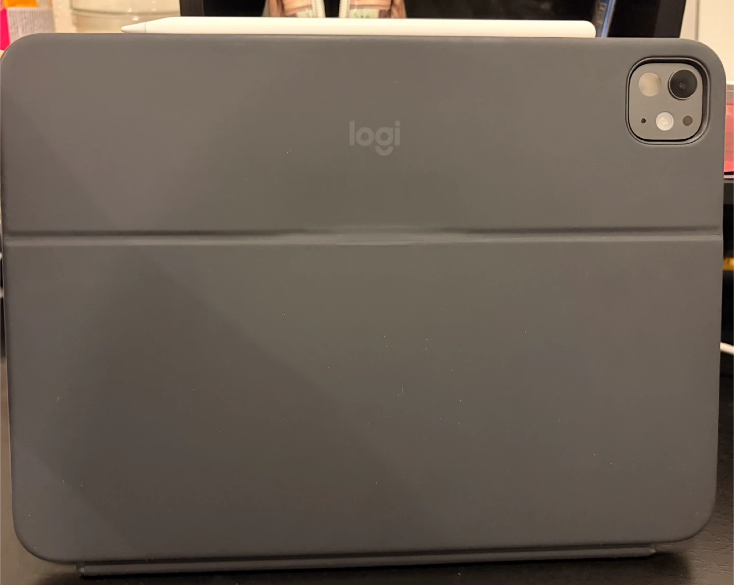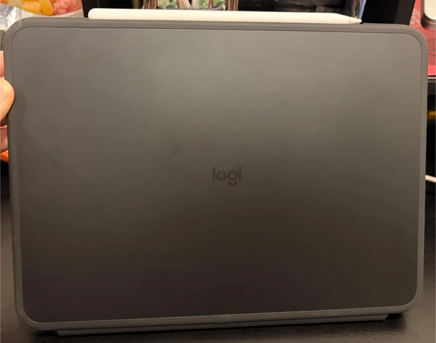 Logitech Combo Touch keyboard case for the iPad Pro 11-inch (M4). It's midnight black and offers comfortable typing with a kickstand. This case also includes a detachable backlit keyboard. There is a minor degumming at one edge but it doesn’t affect its smooth usage. (Shown in pictures)