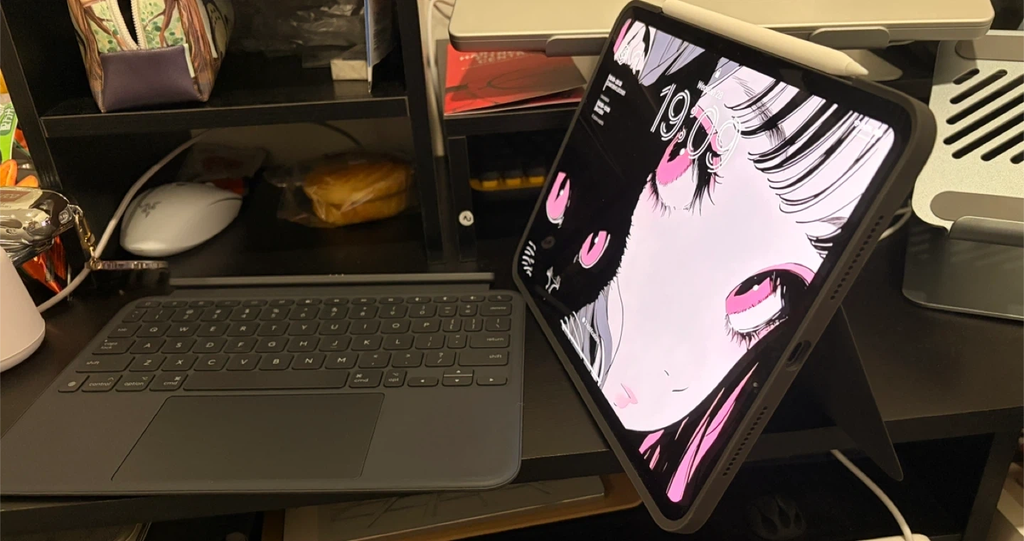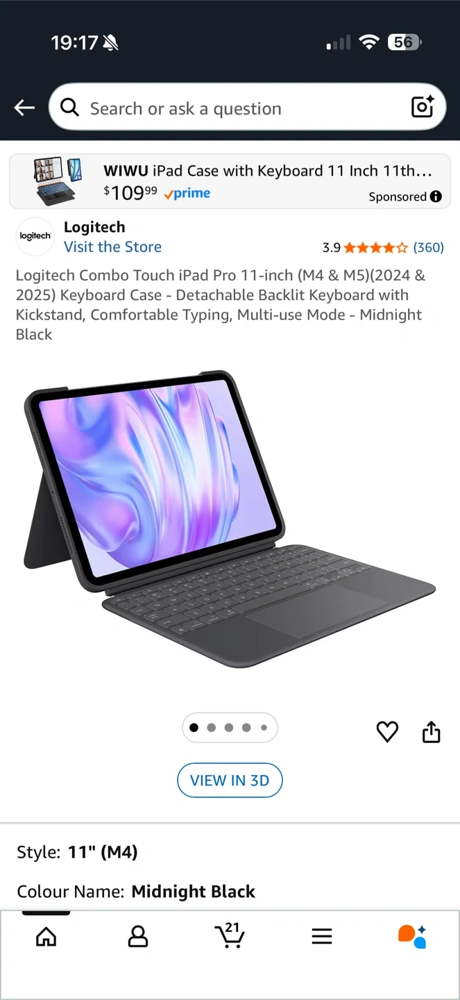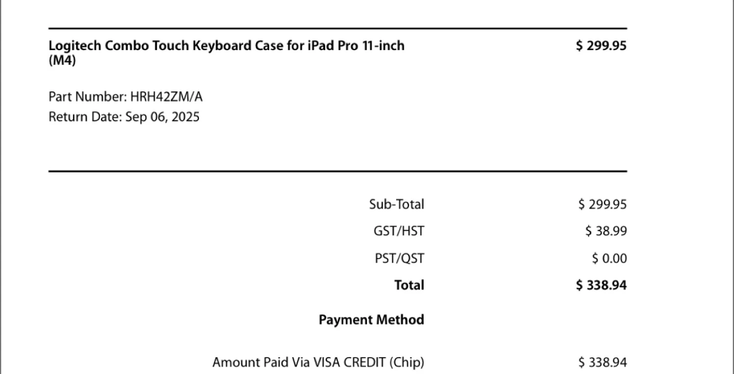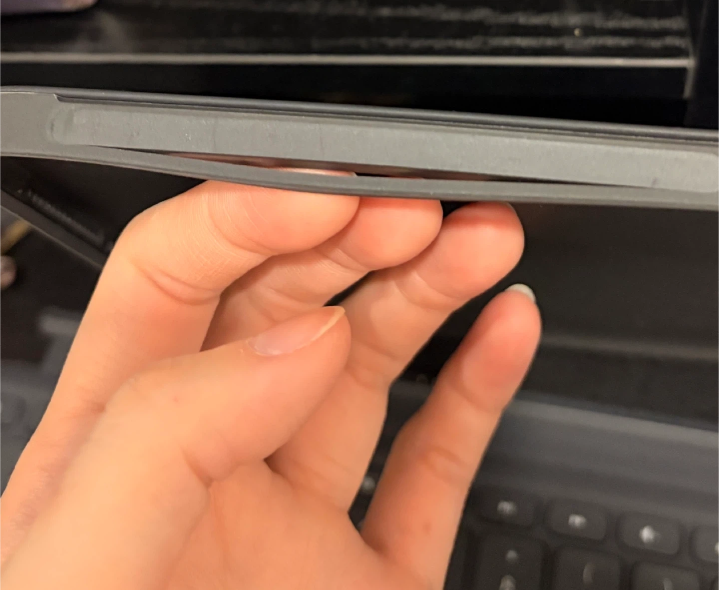 Logitech Combo Touch keyboard case for the iPad Pro 11-inch (M4). It's midnight black and offers comfortable typing with a kickstand. This case also includes a detachable backlit keyboard. There is a minor degumming at one edge but it doesn’t affect its smooth usage. (Shown in pictures)
