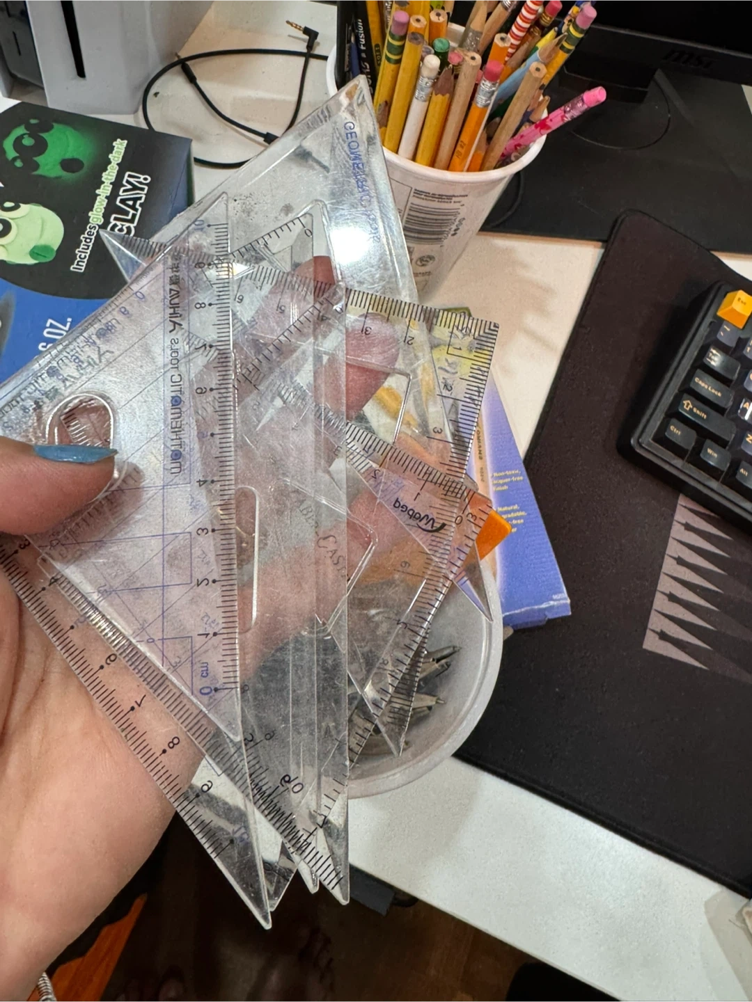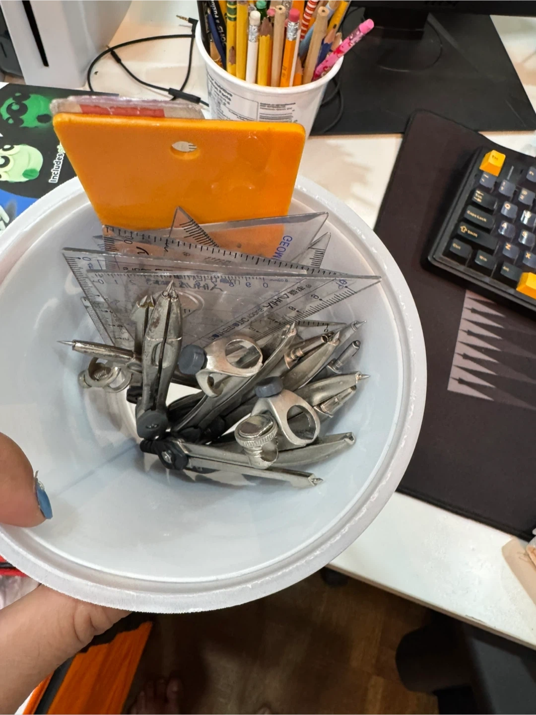 This set includes various rulers, triangles, and a compass for drafting and geometry work. It's suitable for technical drawing and math applications.