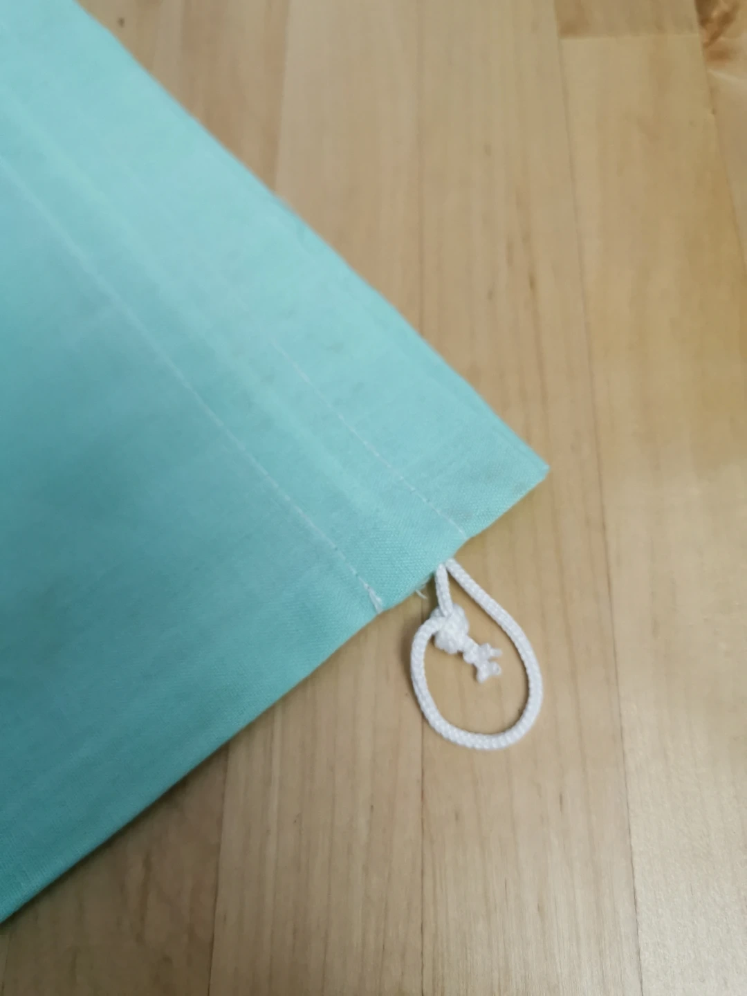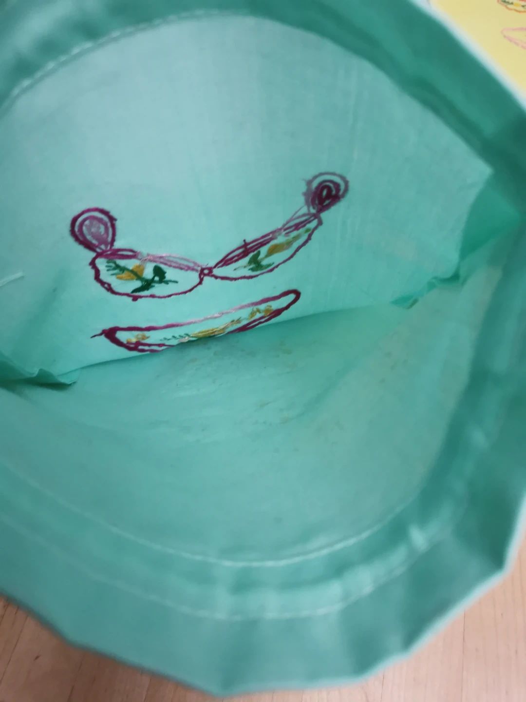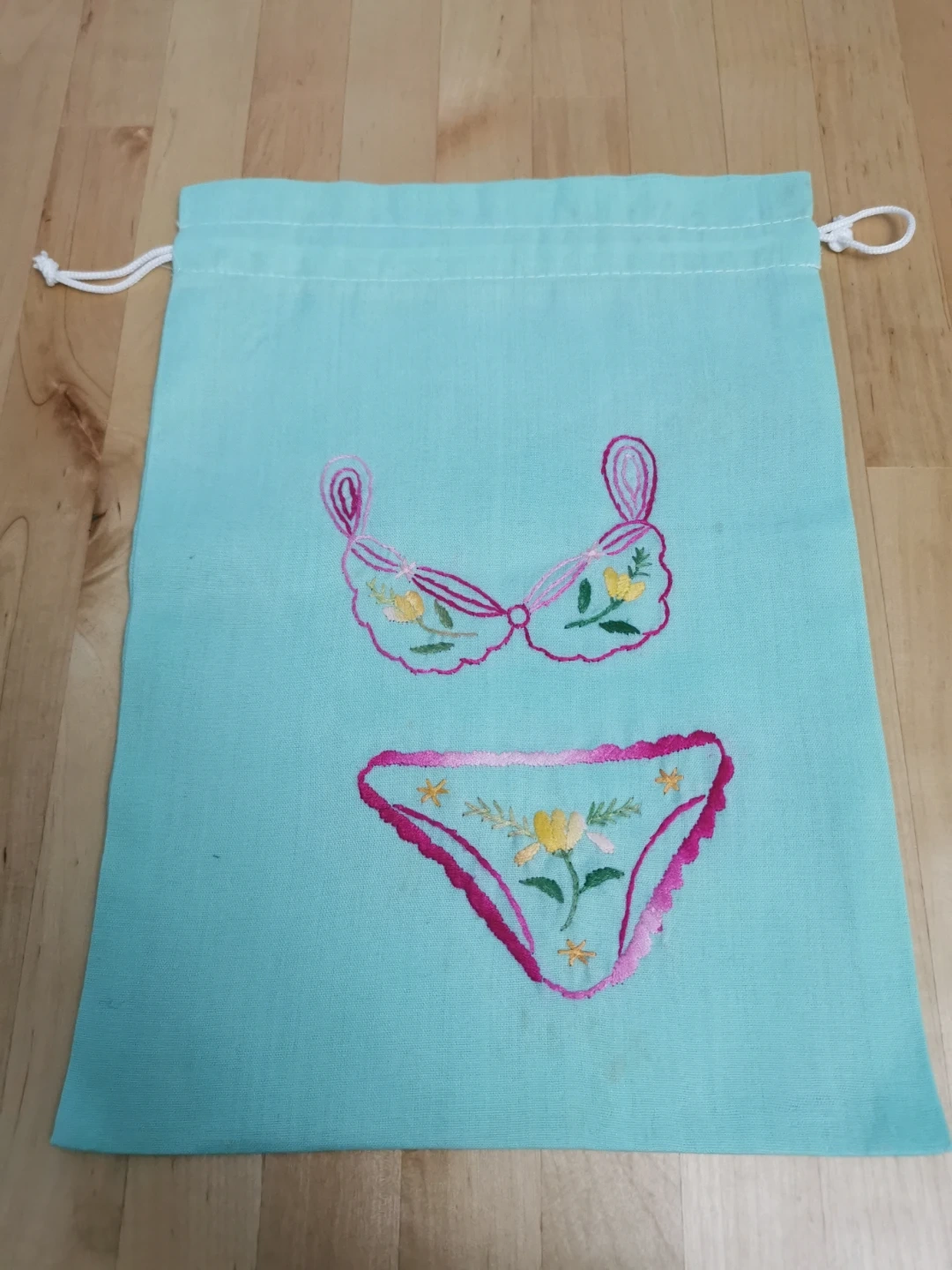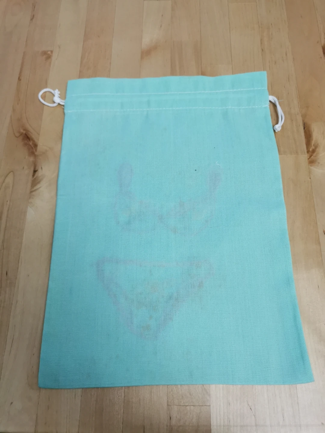 Here's a cute aqua drawstring bag! It has some embroidery on the front. It's in good condition and ready for a new purpose!