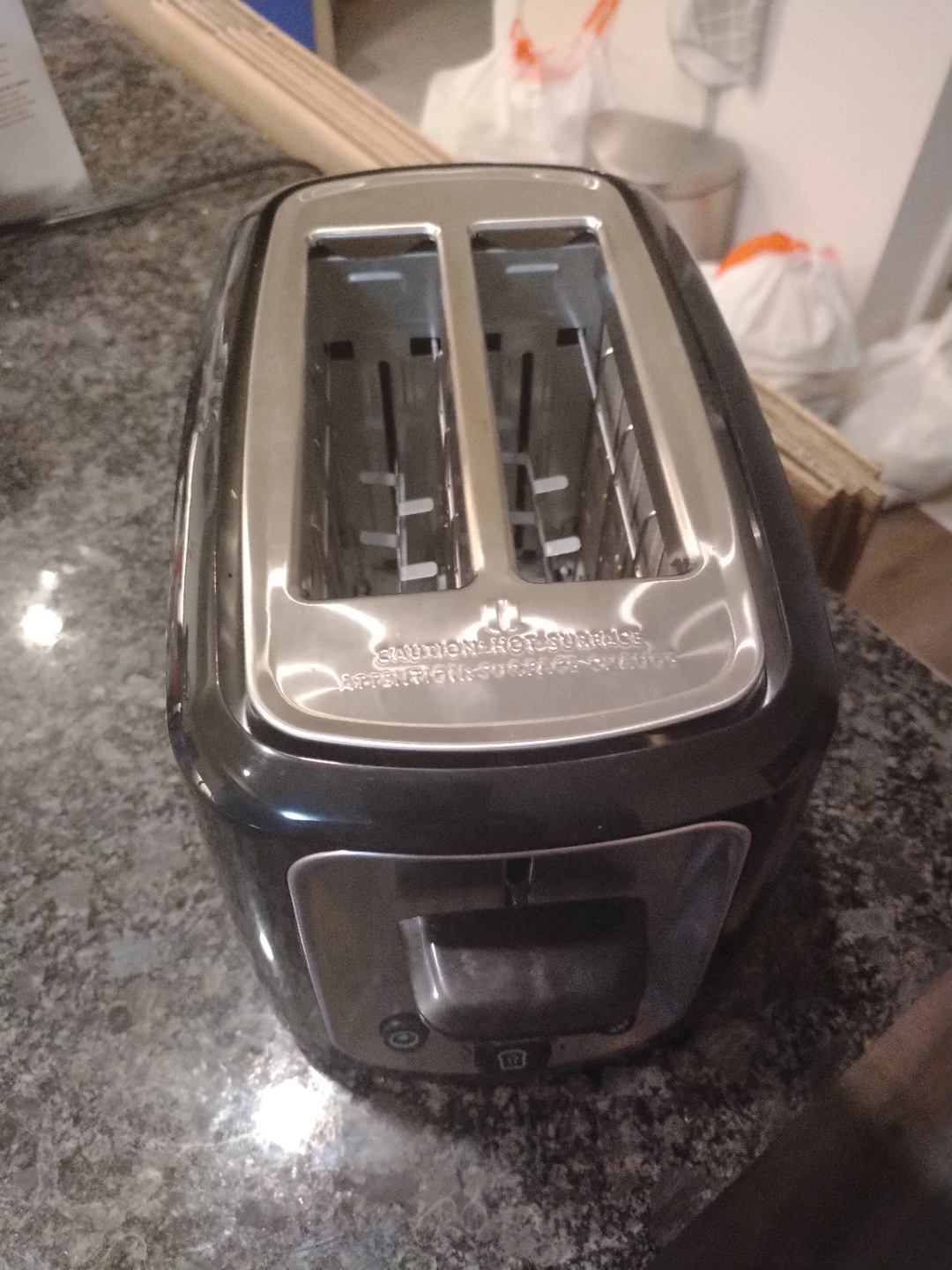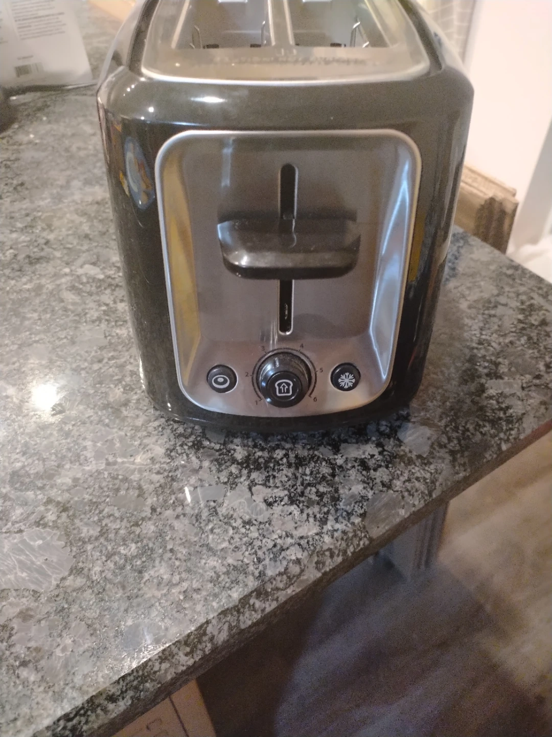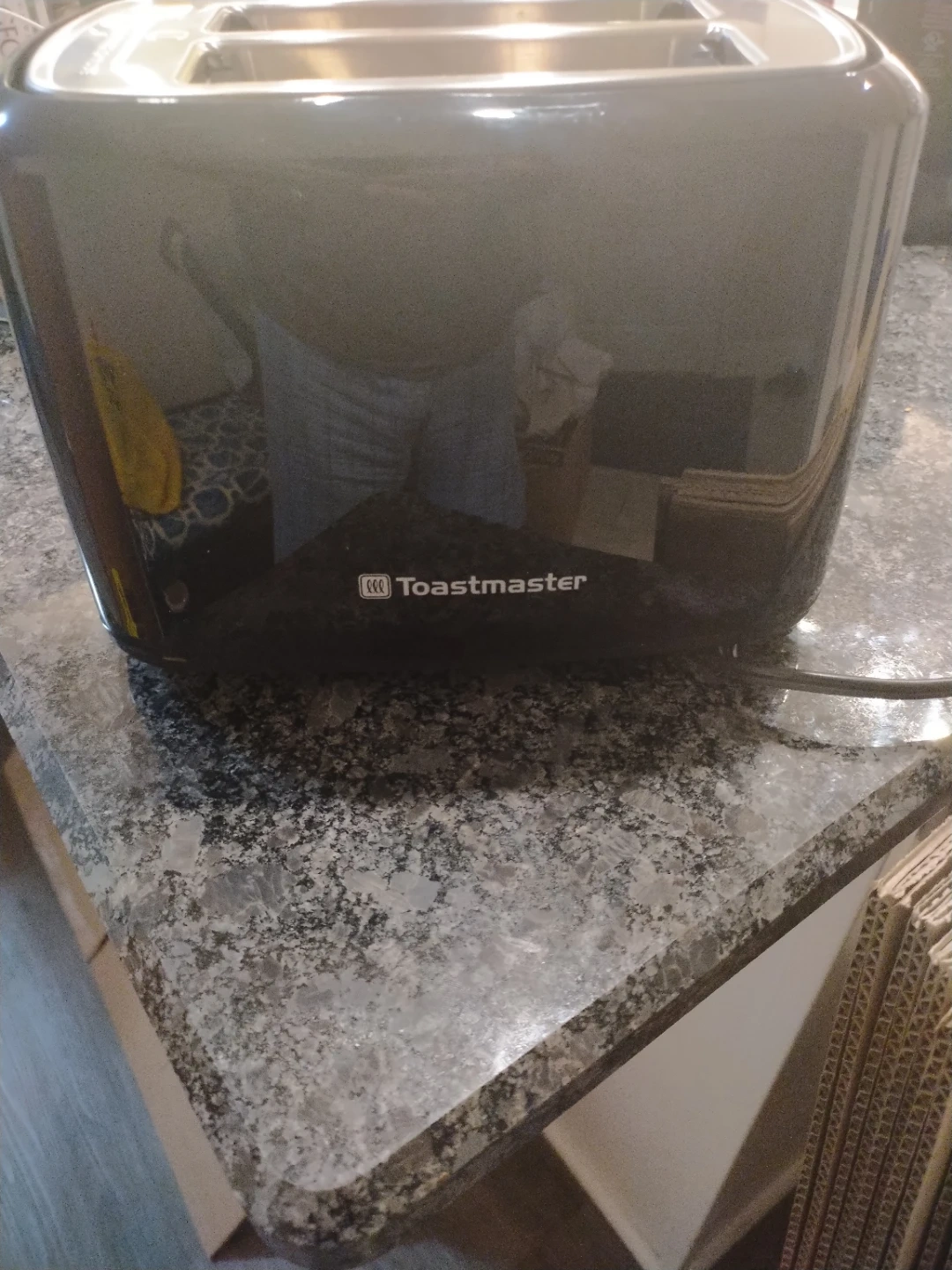 This is a Toastmaster 2-slice toaster. It's a dark grey, glossy finish with stainless steel accents. Features include a cancel button, browning control, and a bagel setting.