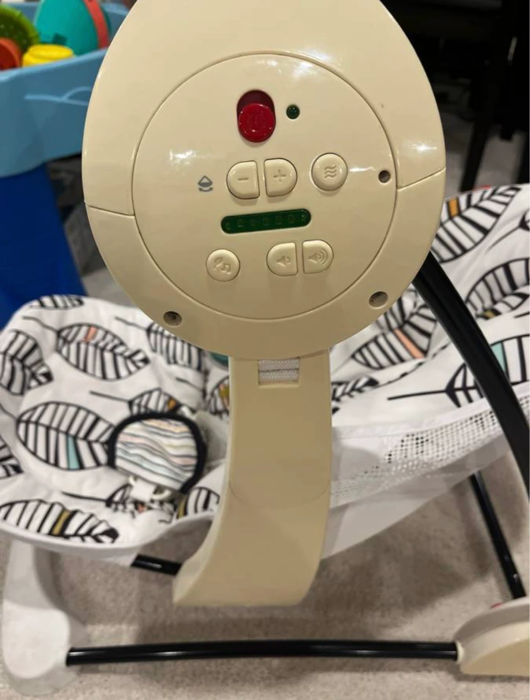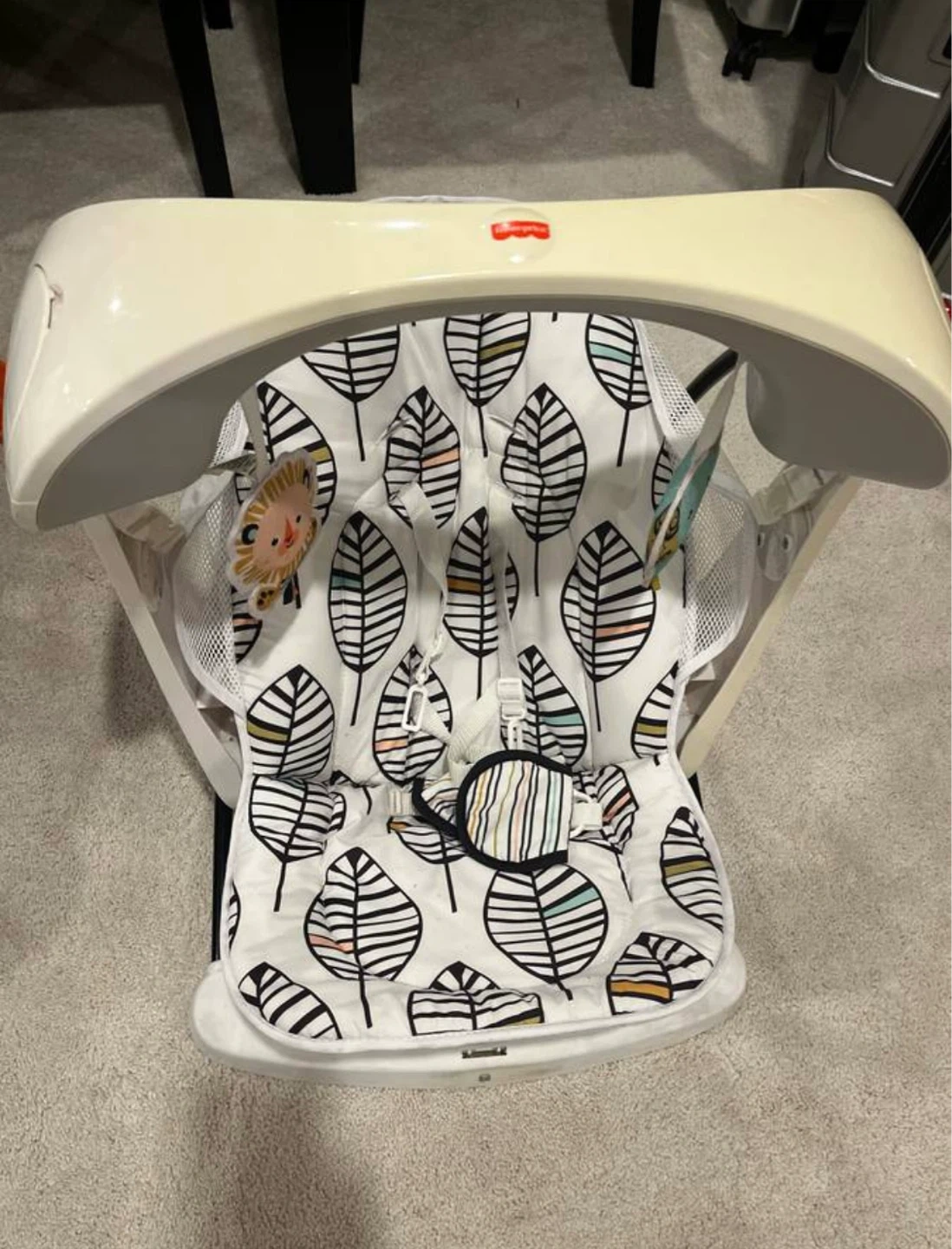 Fisher-Price baby swing with a cute leaf print. It has multiple swing speeds and soothing music options. Powered by batteries.
