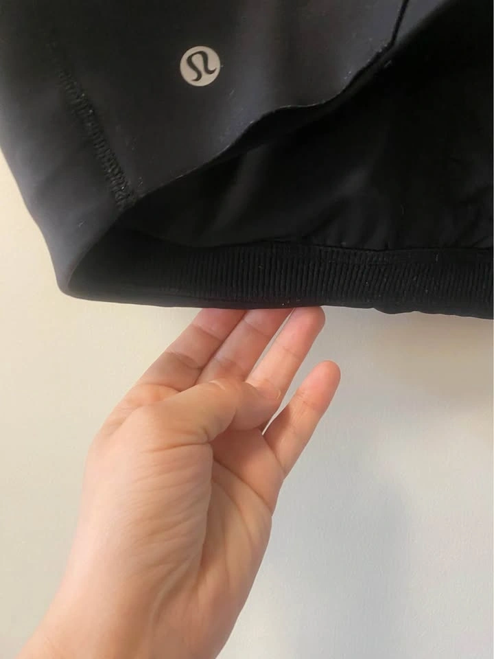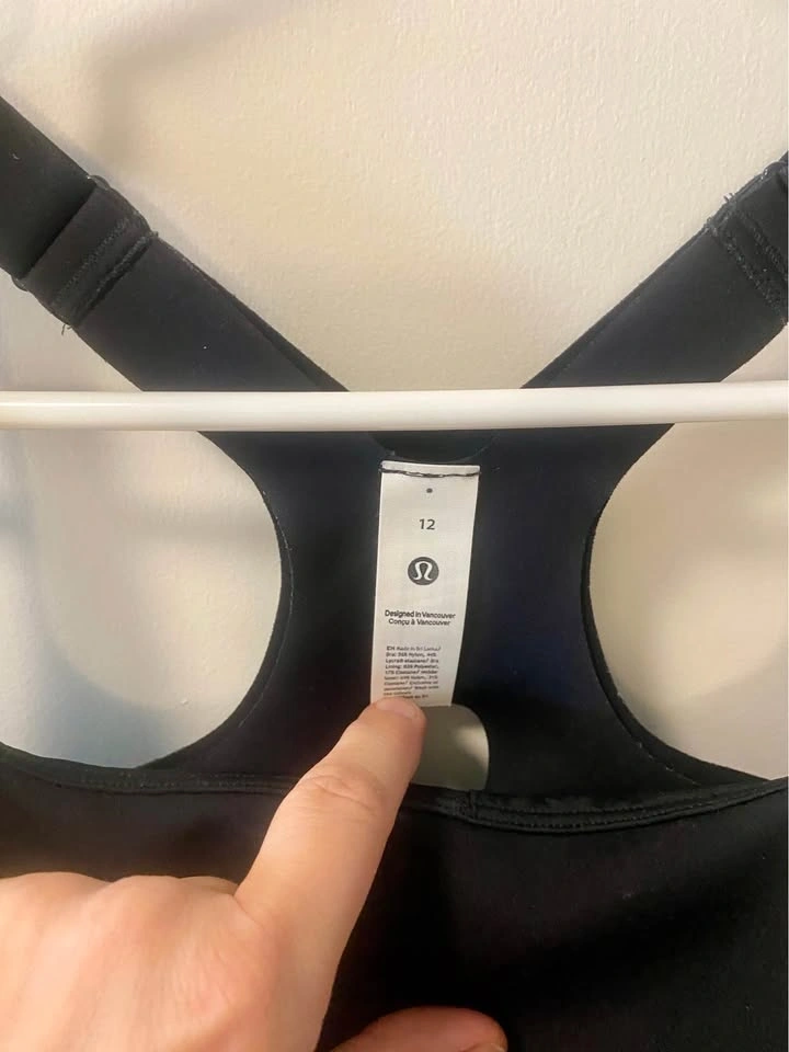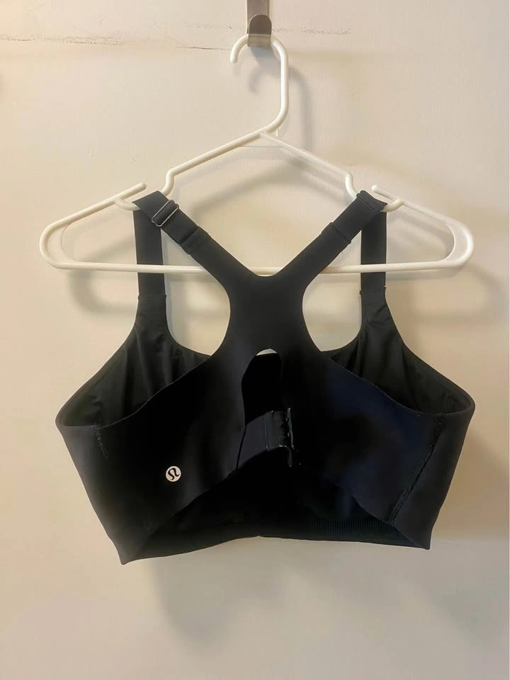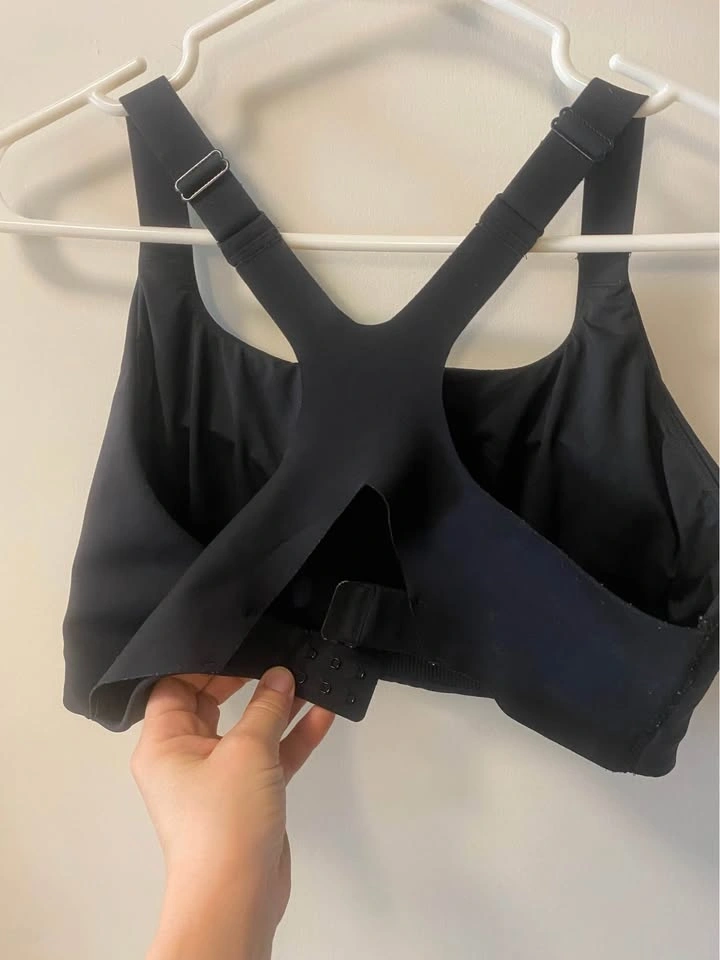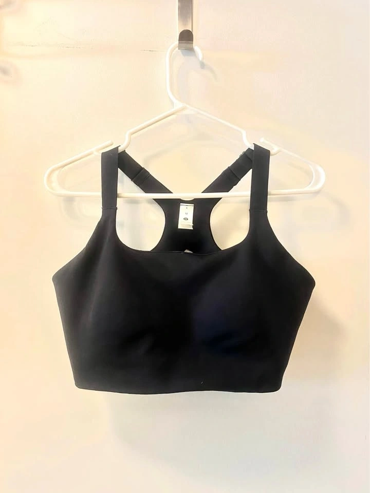 Very soft with removable cups. Hook-and-eye adjustable closure. Racerback style. Smooth support with four-way stretch fabric. Quick-drying, sweat-wicking, and breathable. Adjustable straps. Excellent overall condition, no flaws. Turned out too big for me.