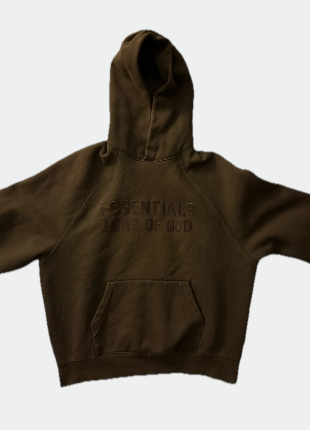 This is an authentic brown Fear of God Essentials hoodie. It has a pullover design with a front pouch pocket and a drawstring hood. The brand name is embossed on the chest.