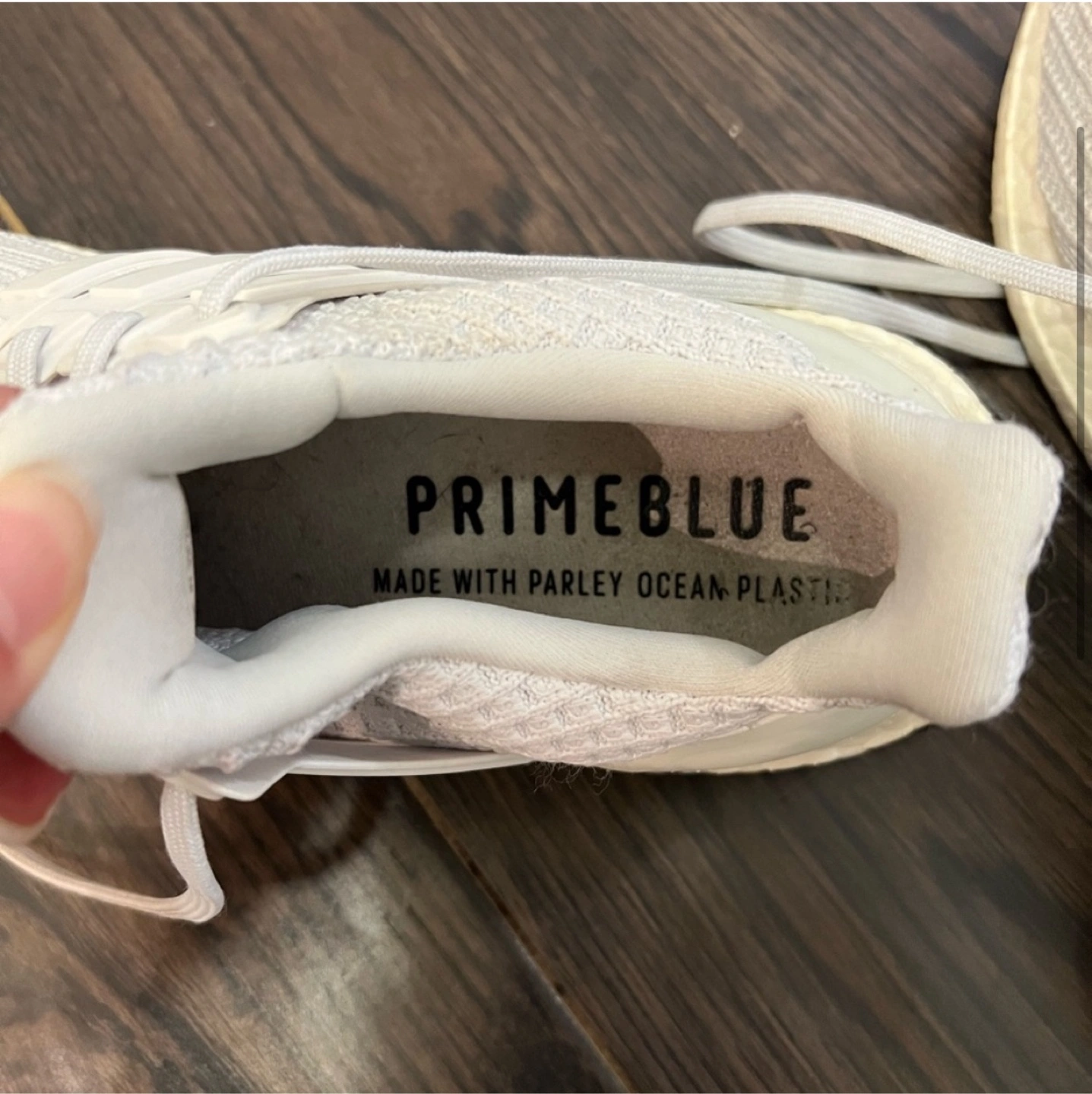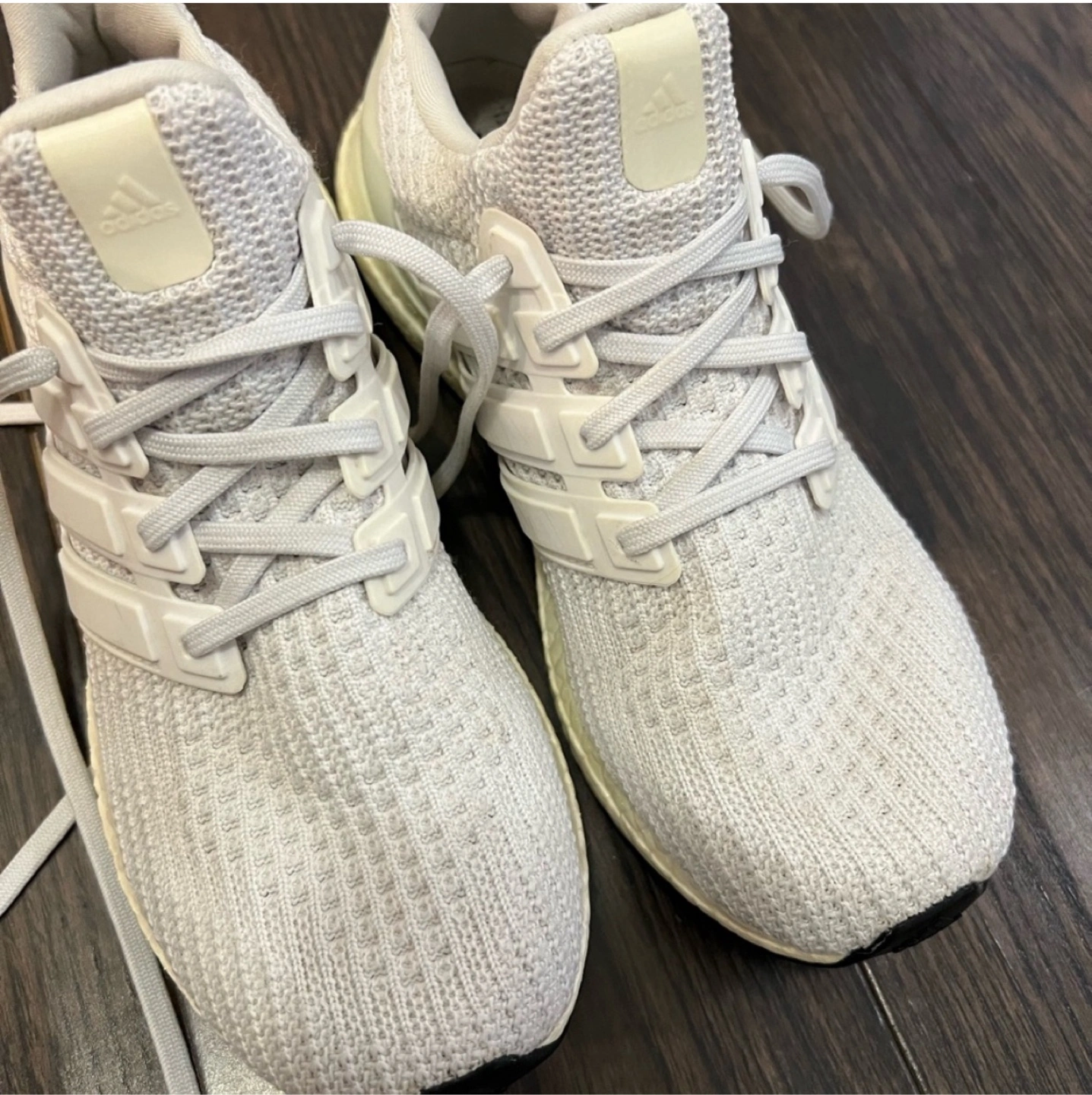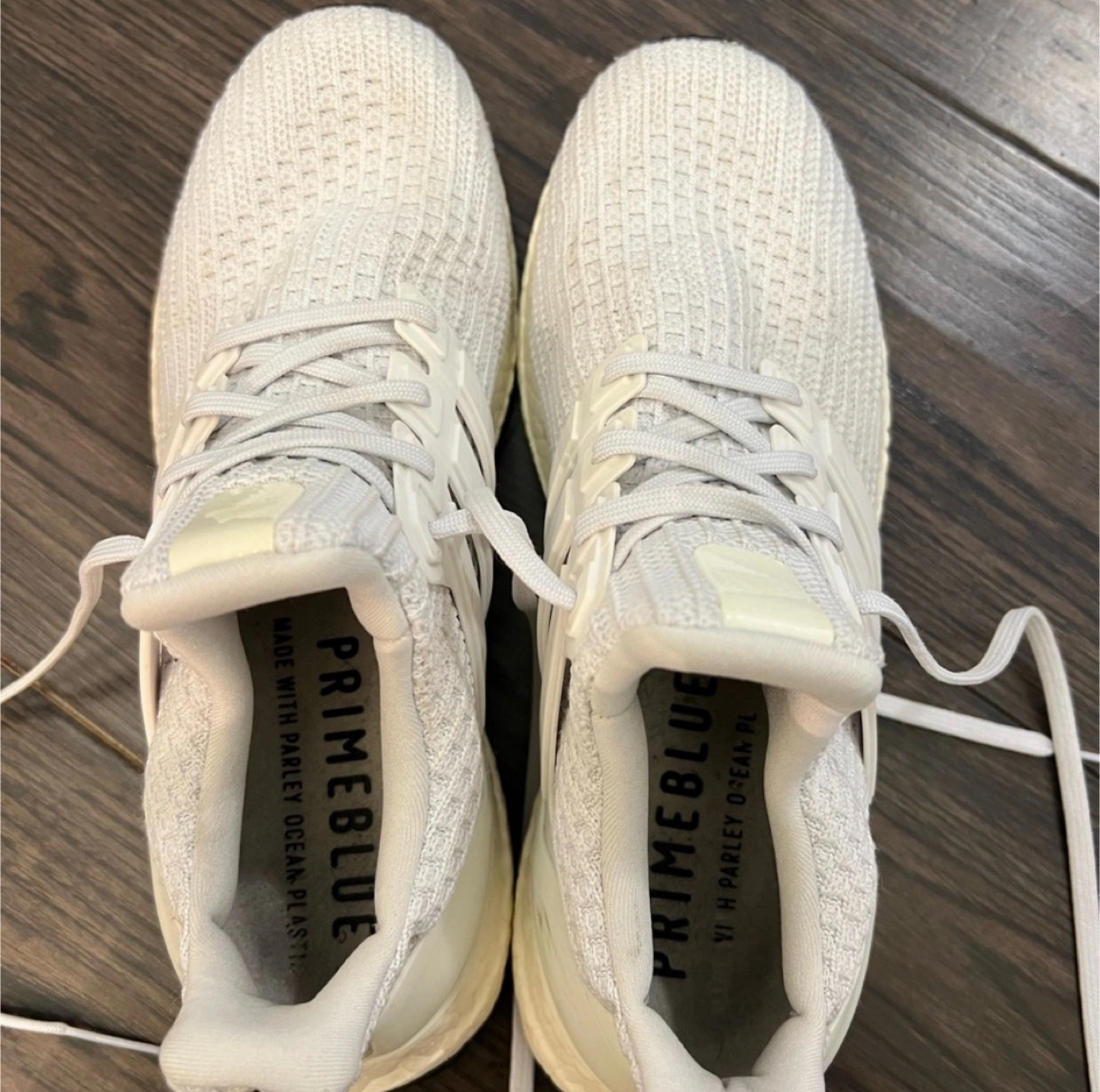 Selling a pair of Adidas Ultraboost sneakers in all white! They're made with Primeblue, a high-performance recycled material made in part with Parley Ocean Plastic