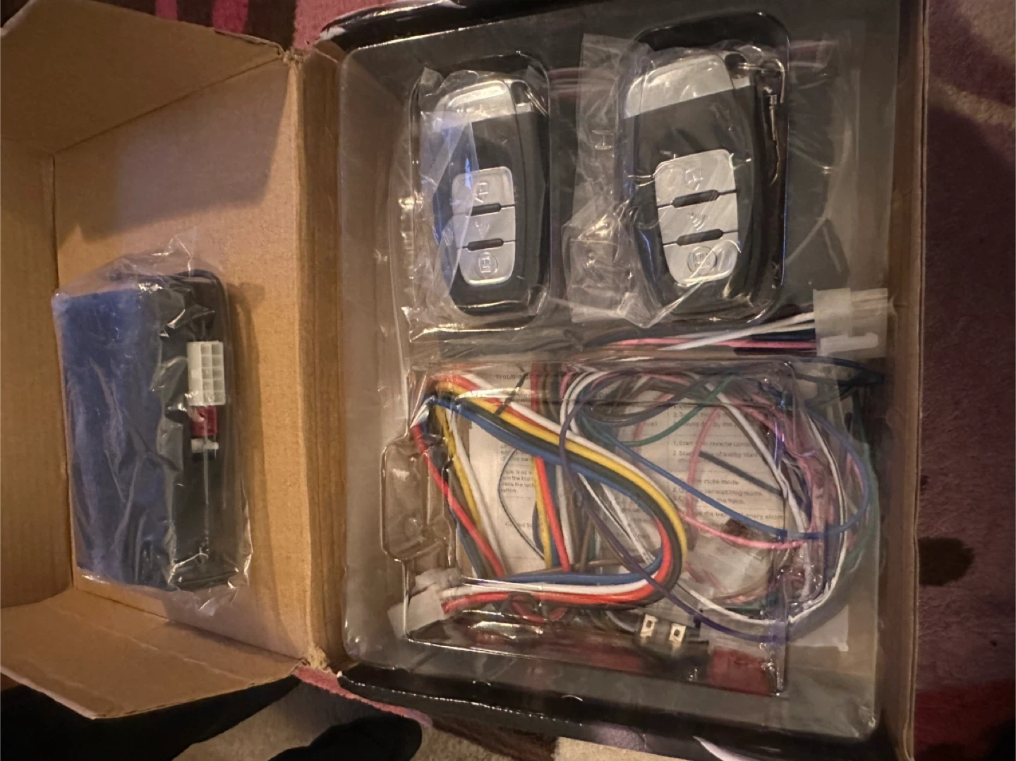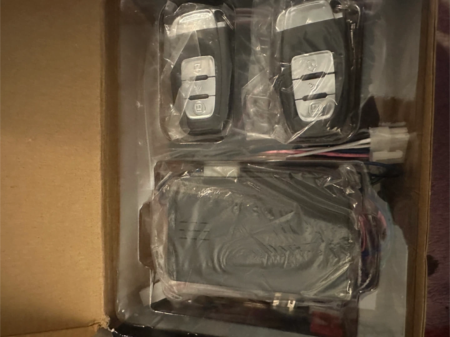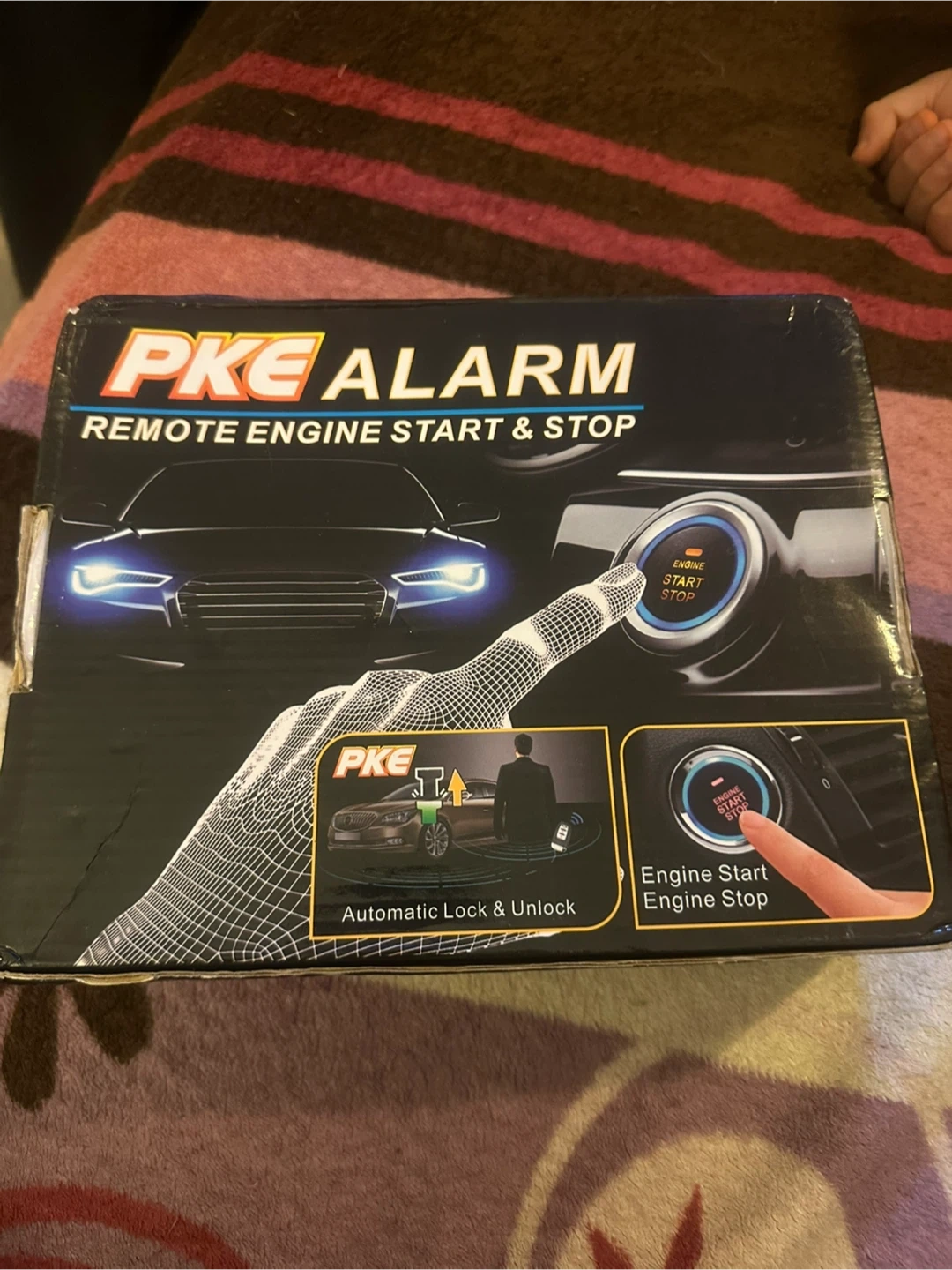 This is a PKE Alarm system with remote engine start and stop. It includes two key fobs, a control module, and a complete wiring harness. The system also features automatic lock and unlock functions.
