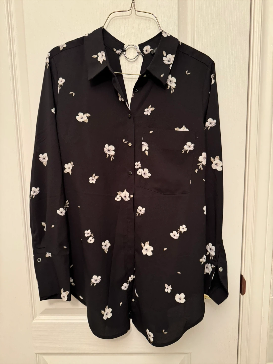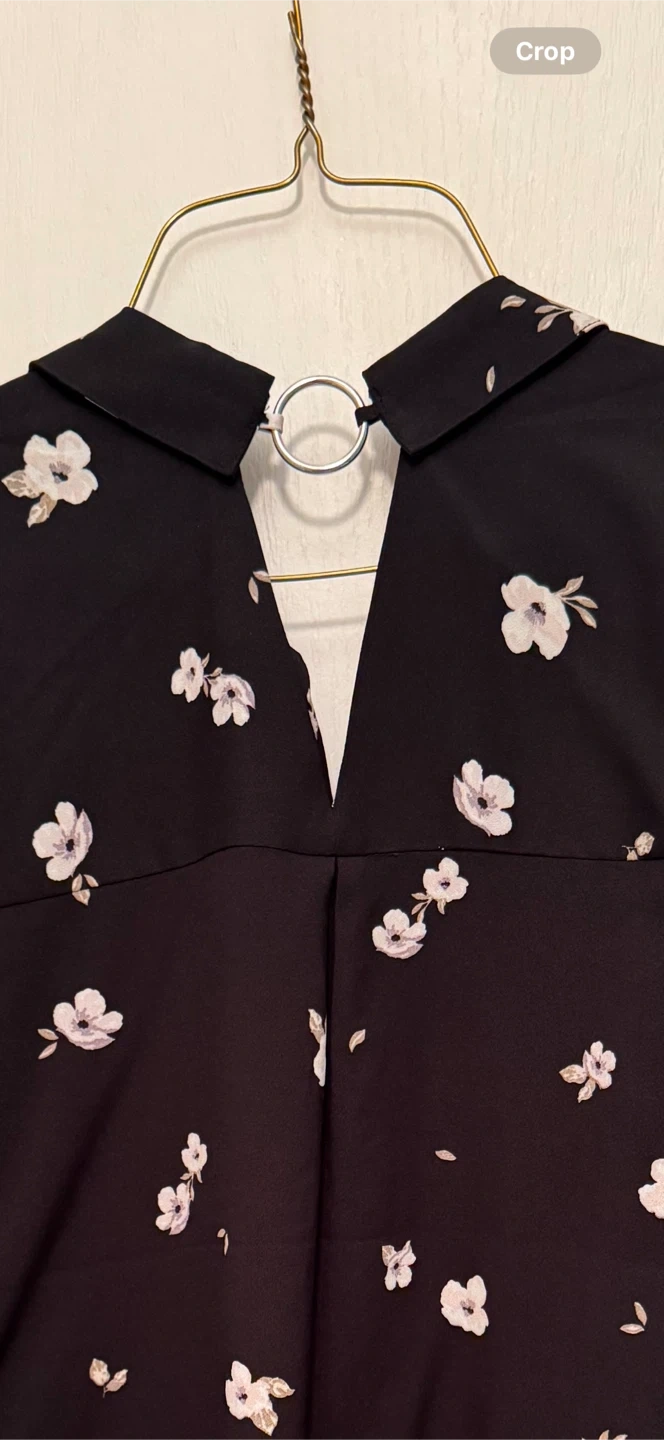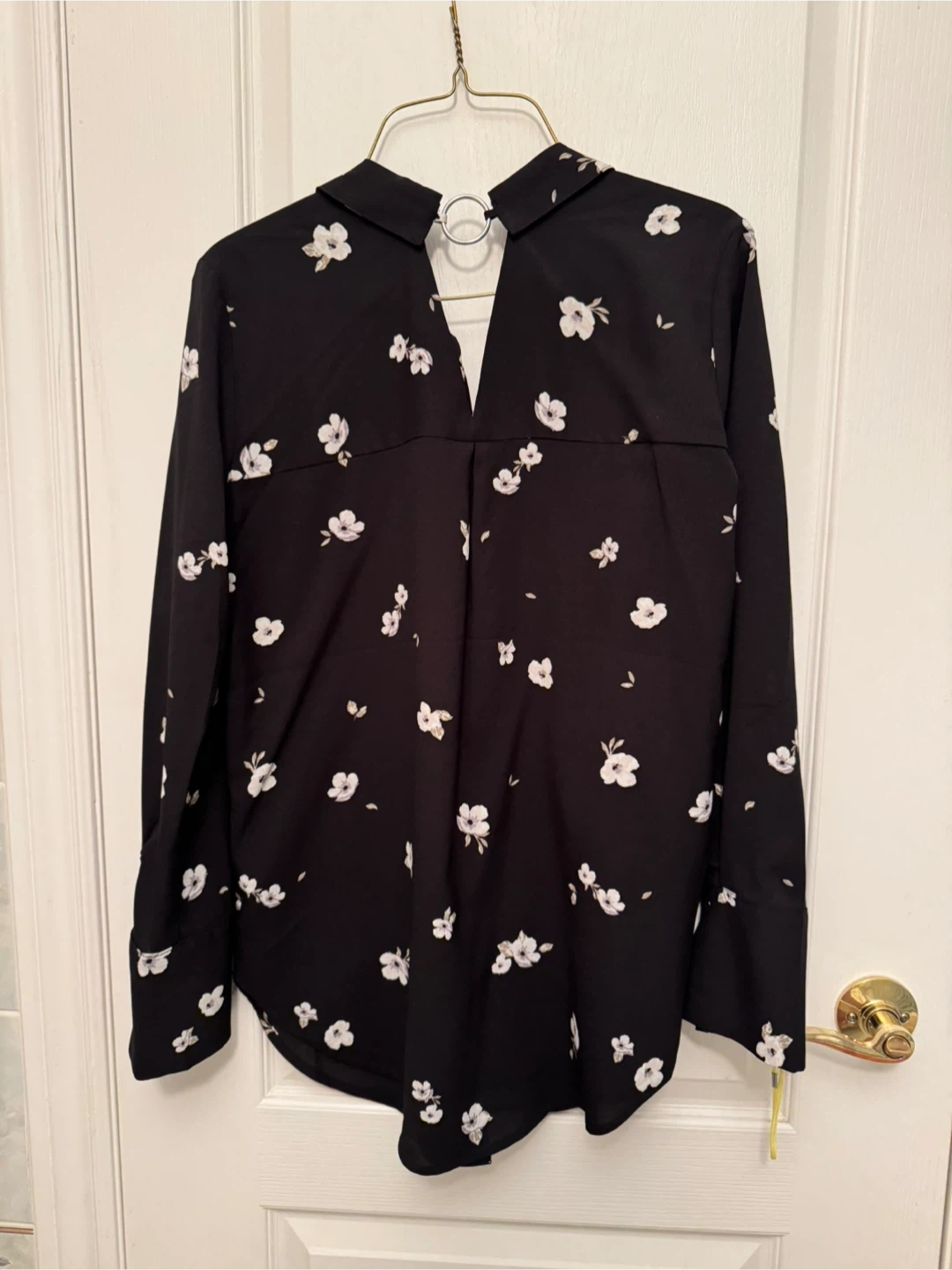 A cute button-down shirt with a floral print and a ring detal in the back! It's black with small white flowers all over. Perfect for dressing up or down