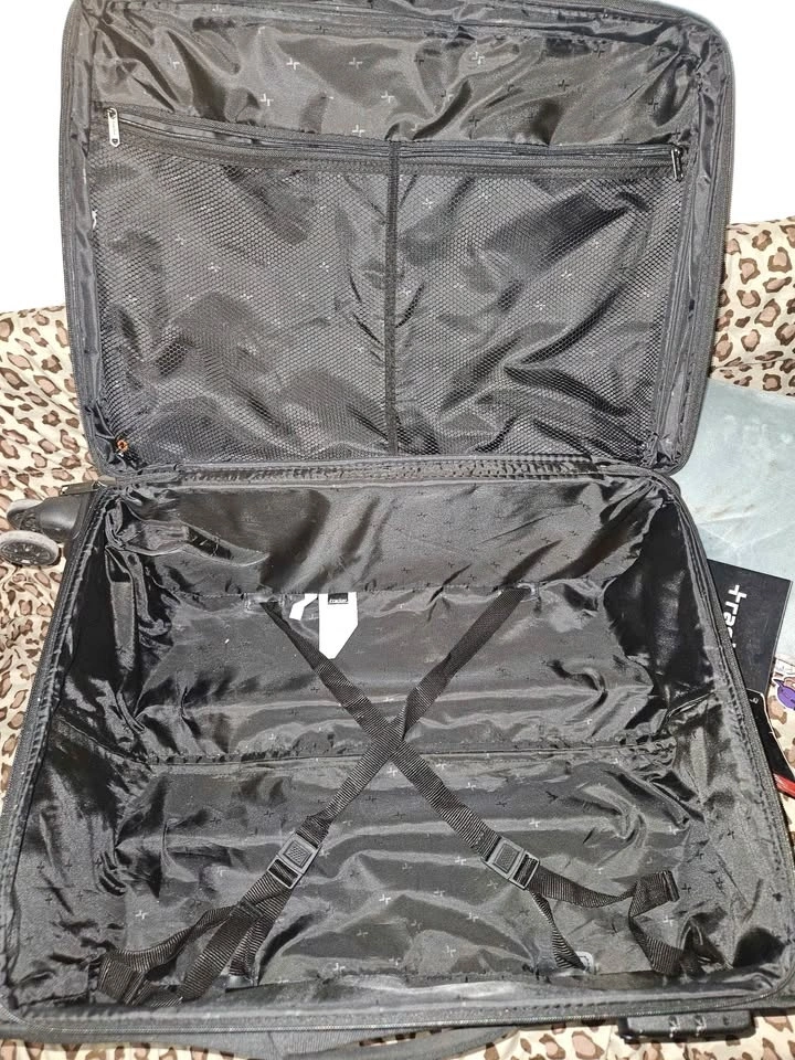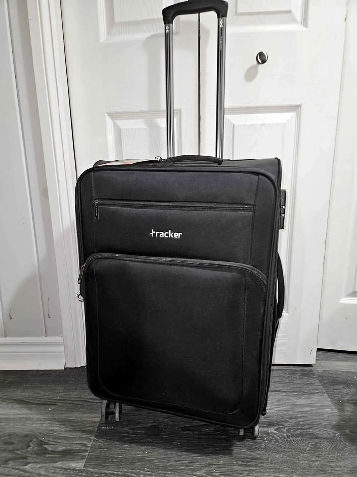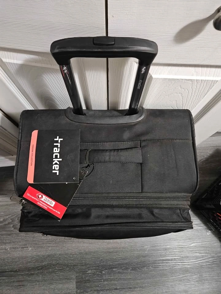 High-quality Tracker rolling suitcase in black. This bag is new with original tags, zips smoothly, and is fully functional.