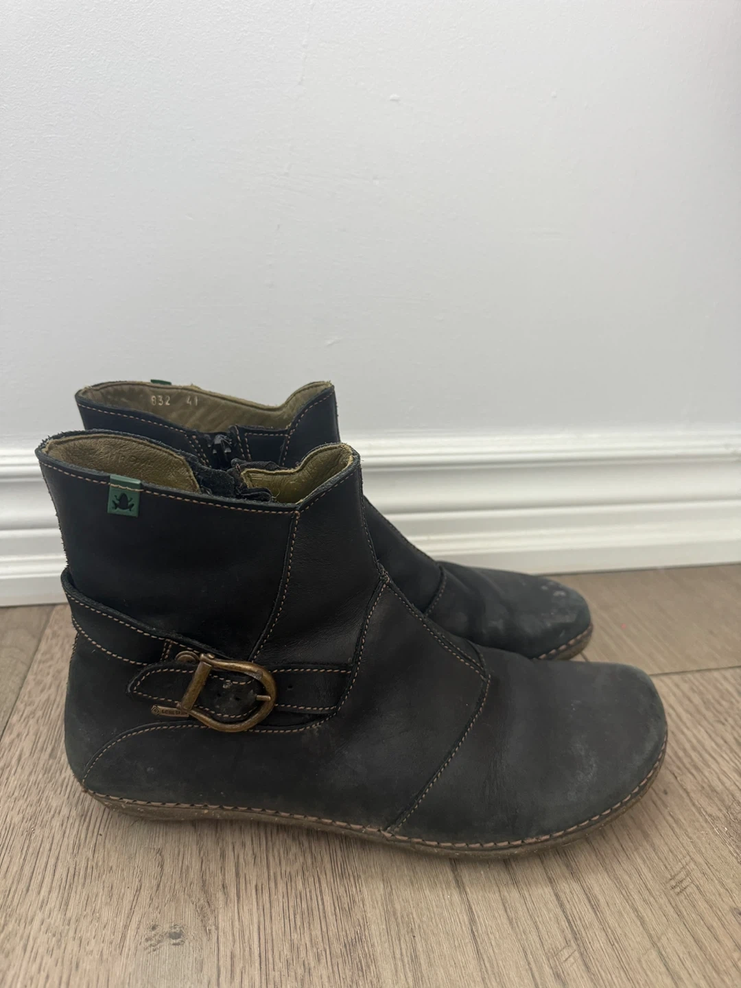 Josef Seibel women's black leather ankle boots. These boots feature a side zipper closure and a decorative buckle. Size 41.