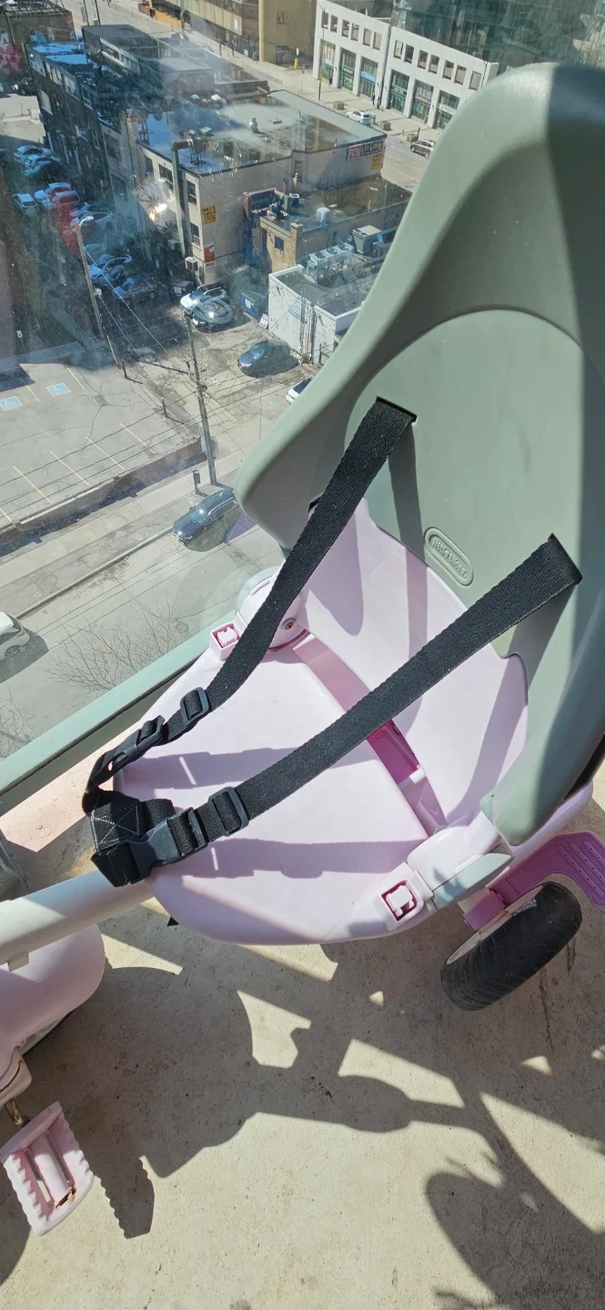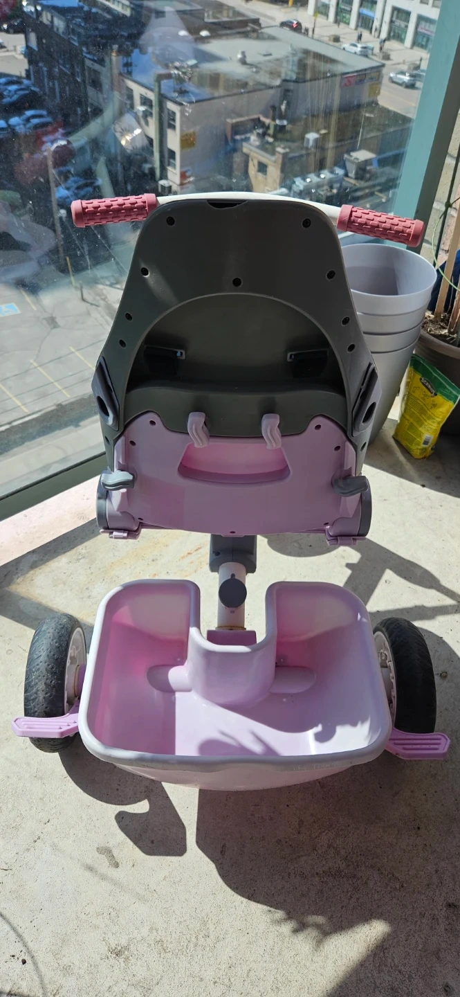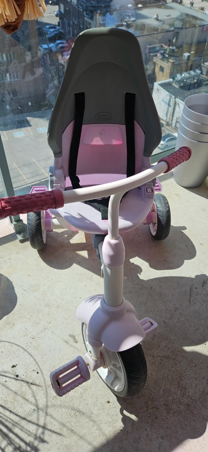 This pink Little Tikes tricycle is designed for younger riders. It comes with a parent handle for steering control and a safety harness. It also features a storage bucket at the back for toys.