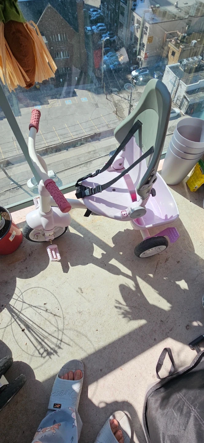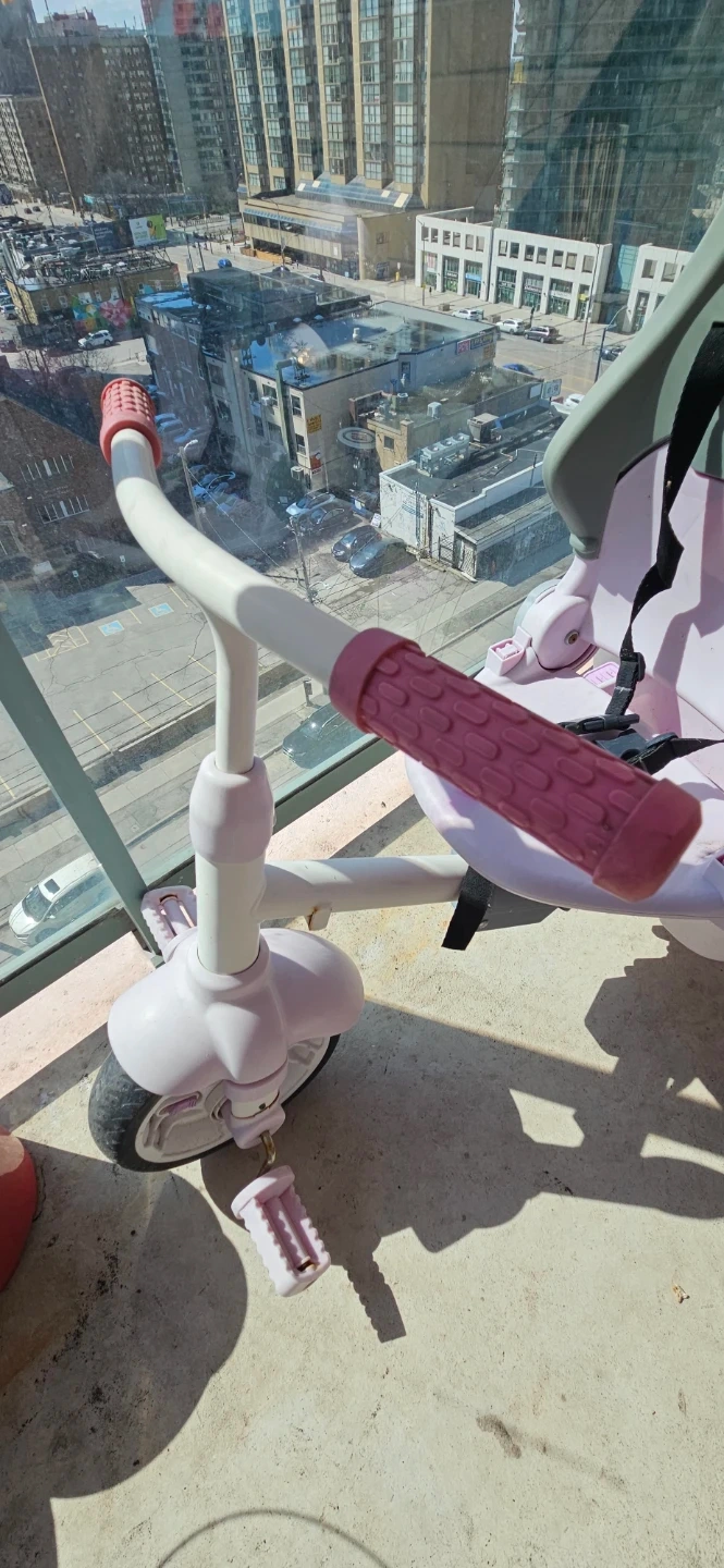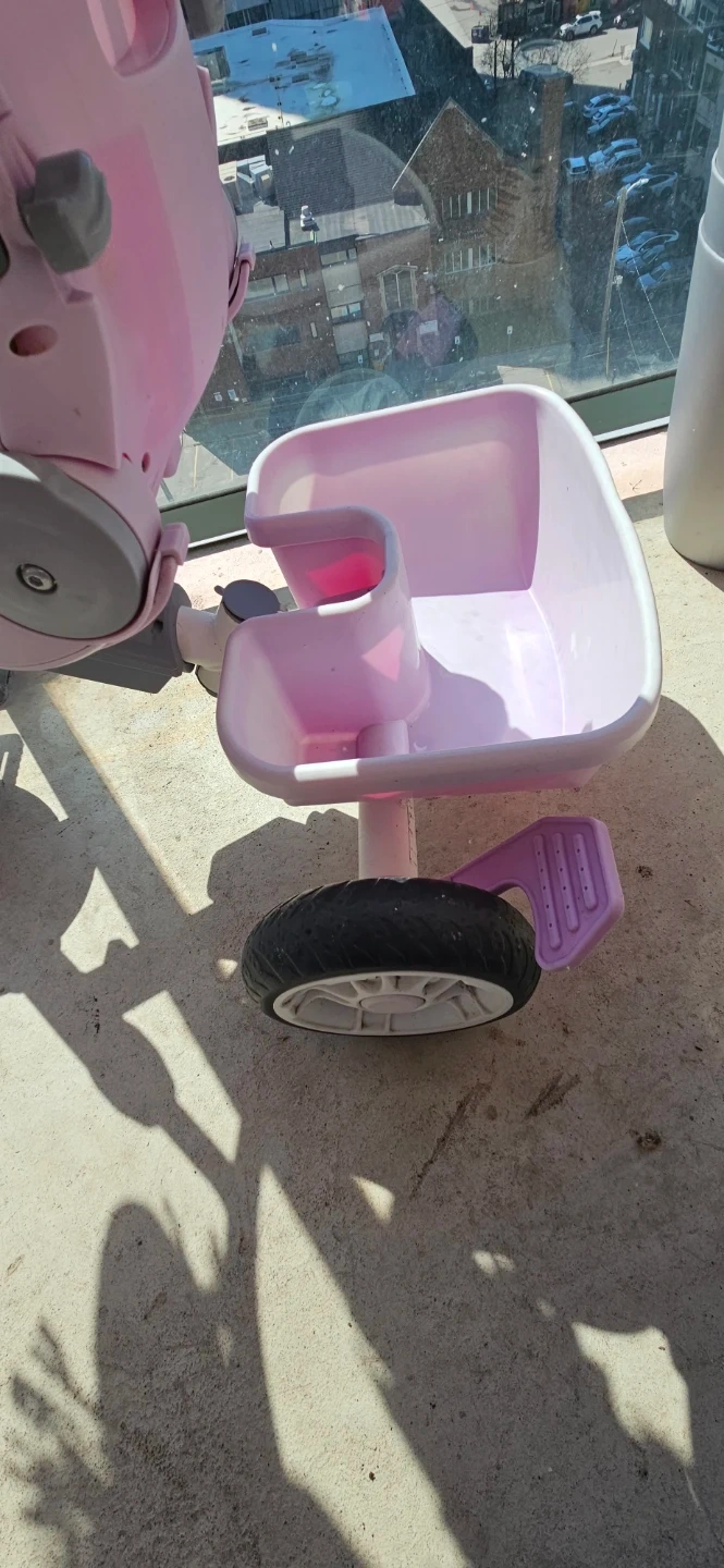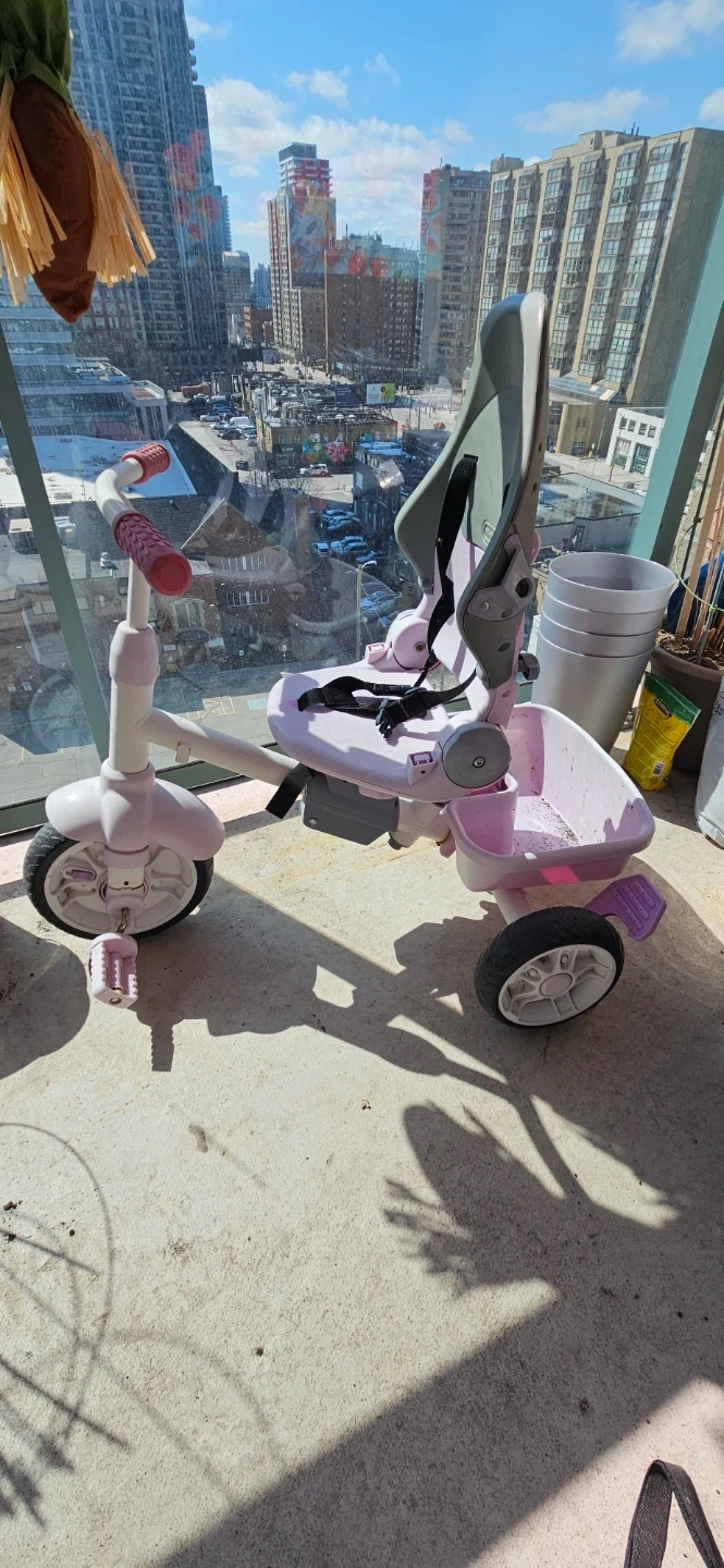 This pink Little Tikes tricycle is designed for younger riders. It comes with a parent handle for steering control and a safety harness. It also features a storage bucket at the back for toys.
