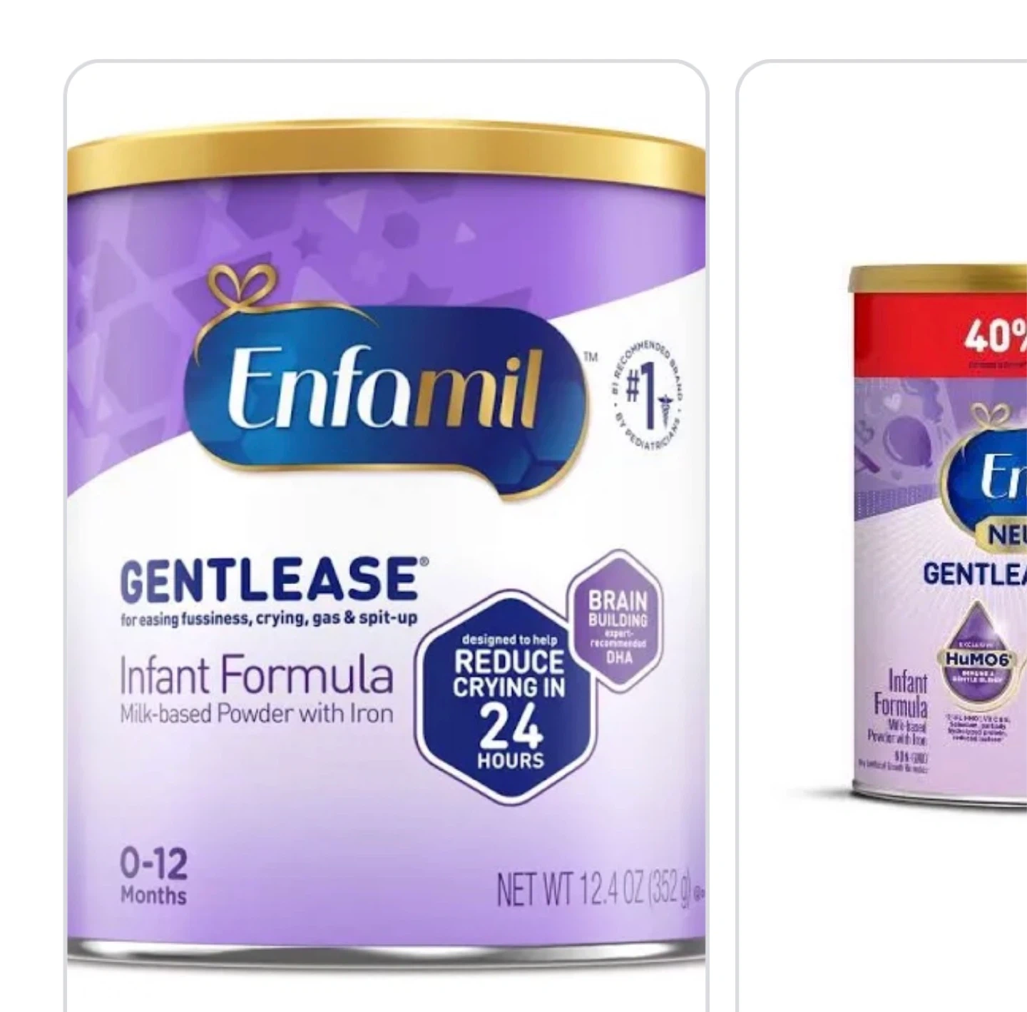 Enfamil Gentlease infant formula is milk-based powder with iron. It's designed to help reduce crying in 24 hours. This formula is for babies 0-12 months.