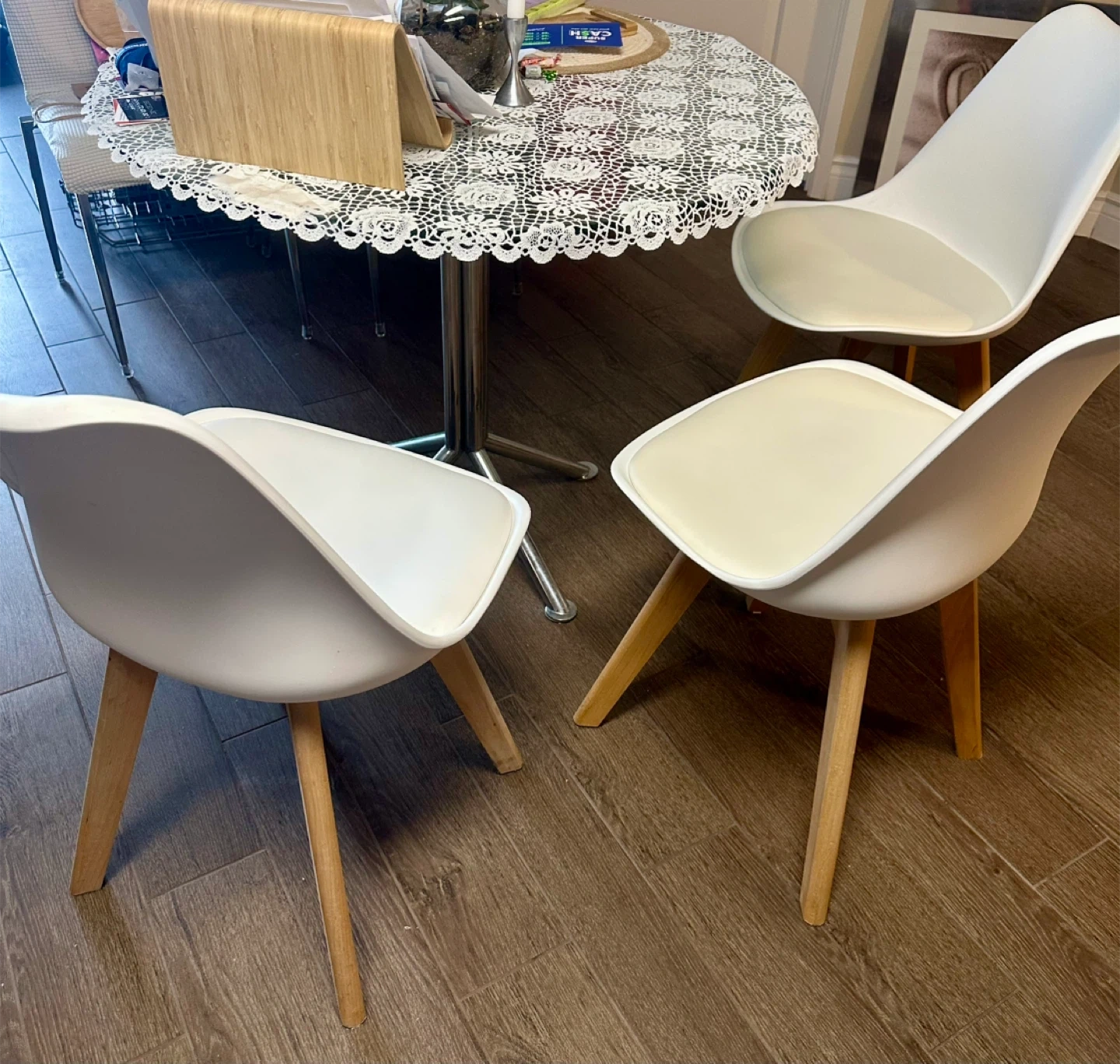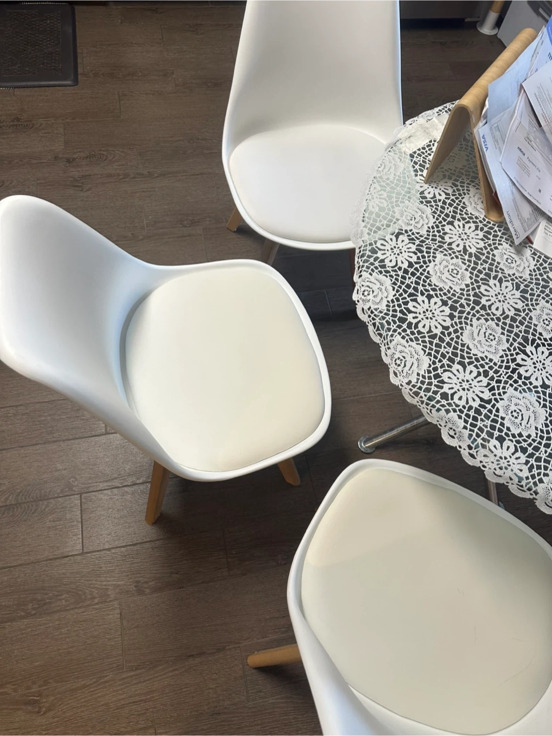 Selling a set of three white dining chairs. These chairs feature molded plastic seats with a light cream-coloured cushion. They have natural wood dowel legs. They're stylish and comfortable for any dining area.