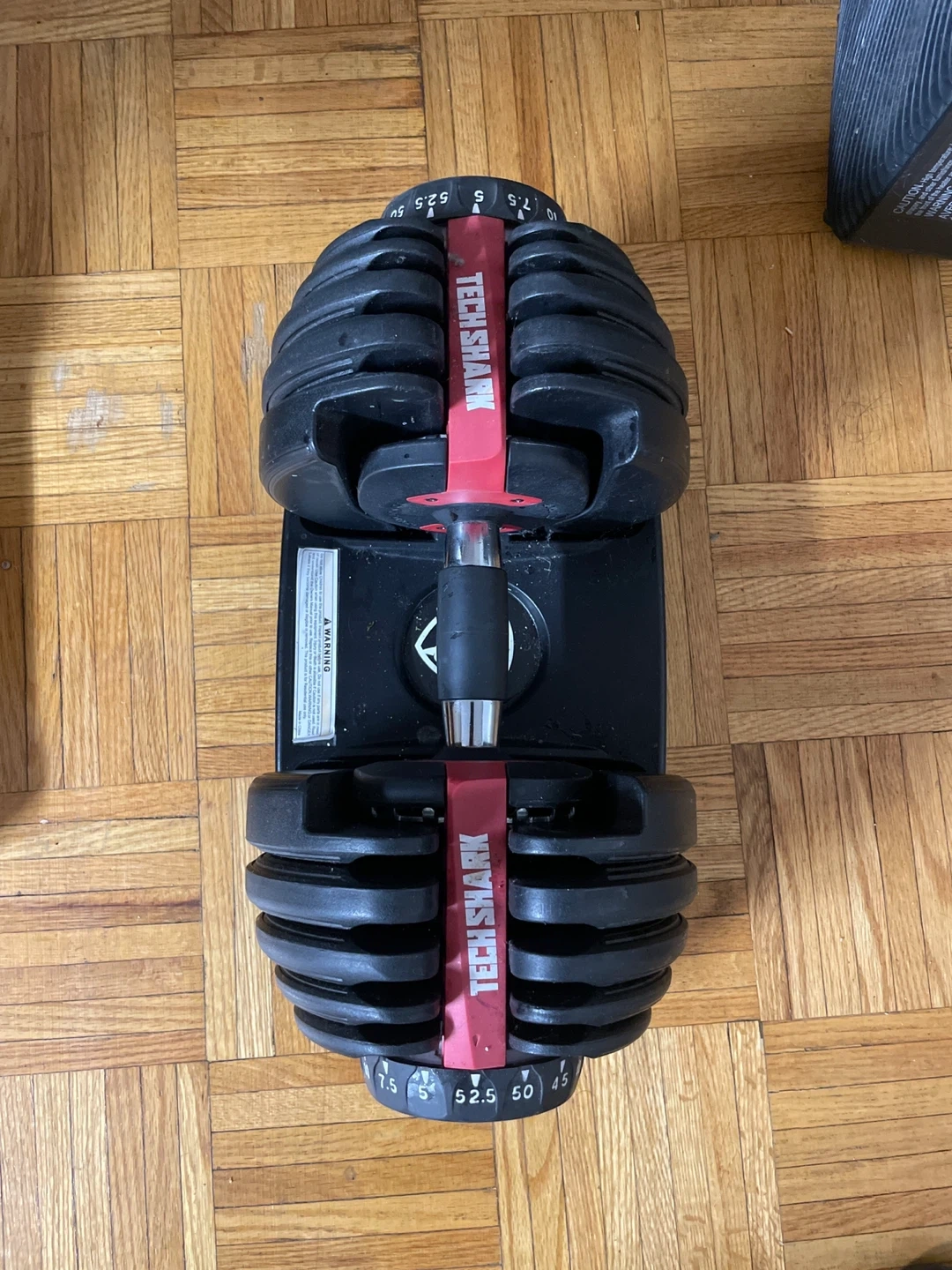 This Techshark adjustable dumbbell offers a range of weights. It's designed for efficient strength training. Maximum weight is 52.5 lbs.