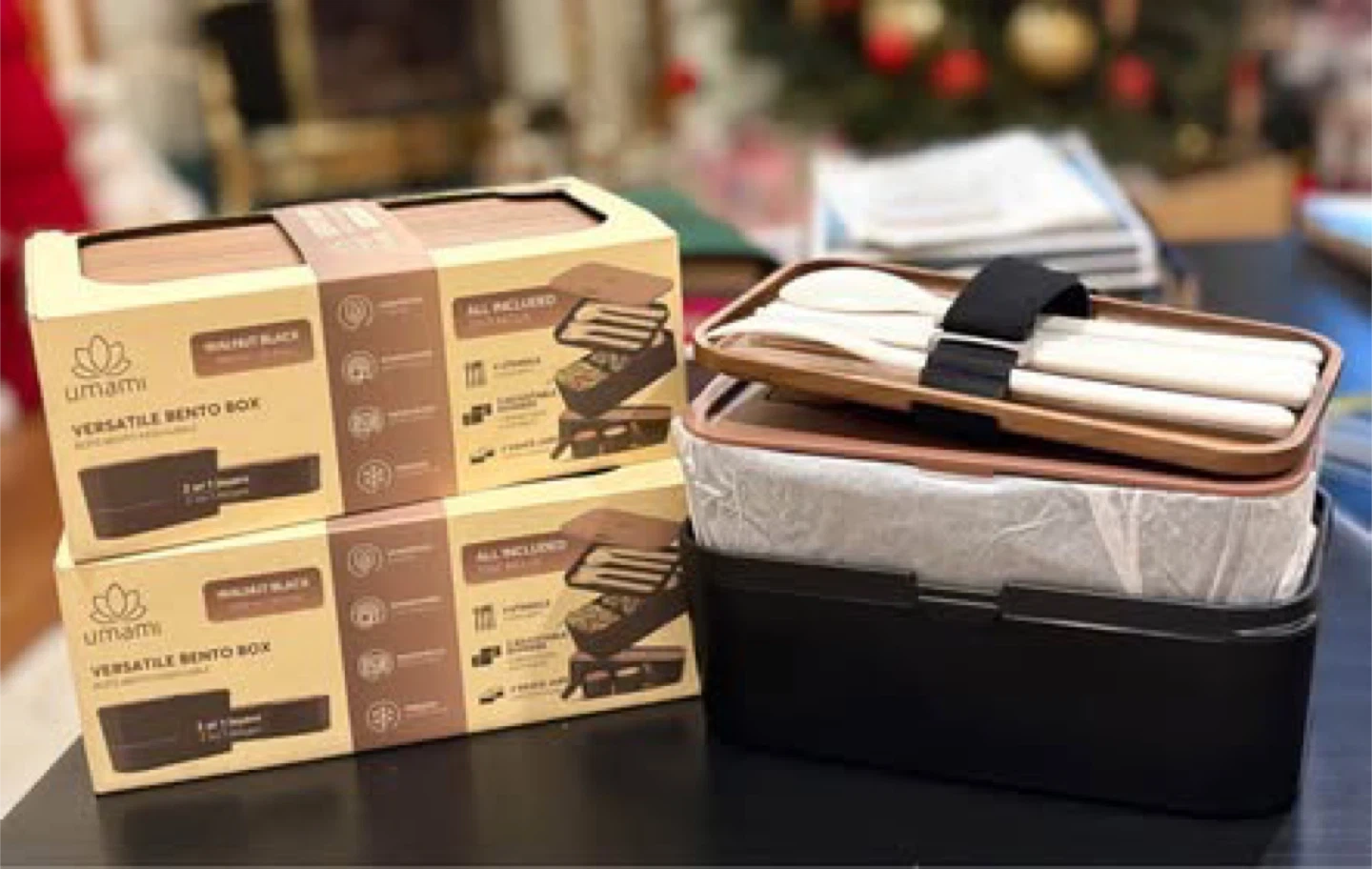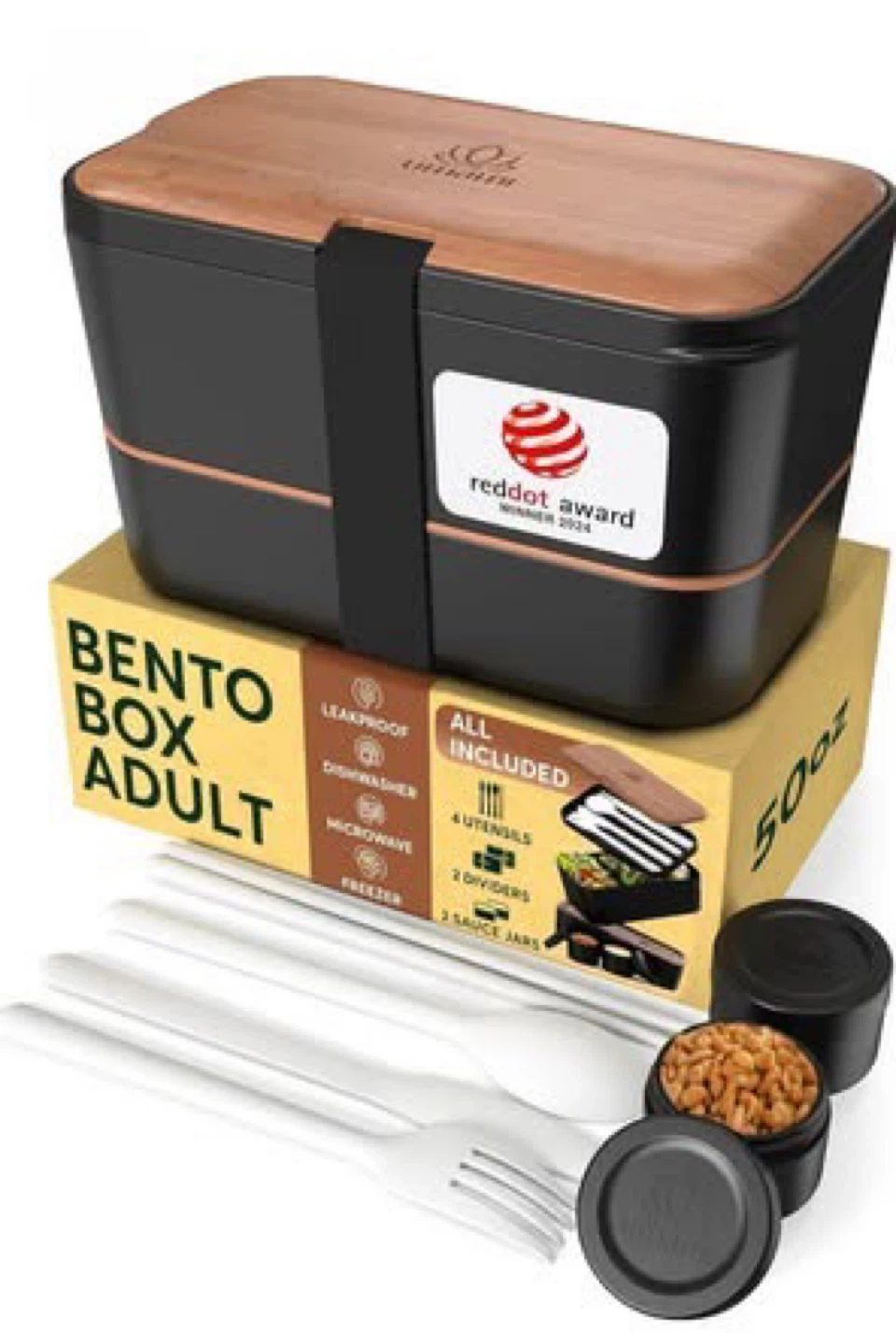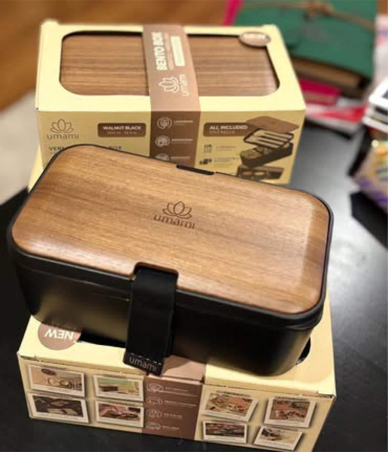 This Umami bento box is black with a walnut wood lid and comes with utensils, 2 dividers, and 2 sauce jars. It's leakproof, dishwasher, microwave, and freezer safe. The big container is 900ml and the small container is 600ml.