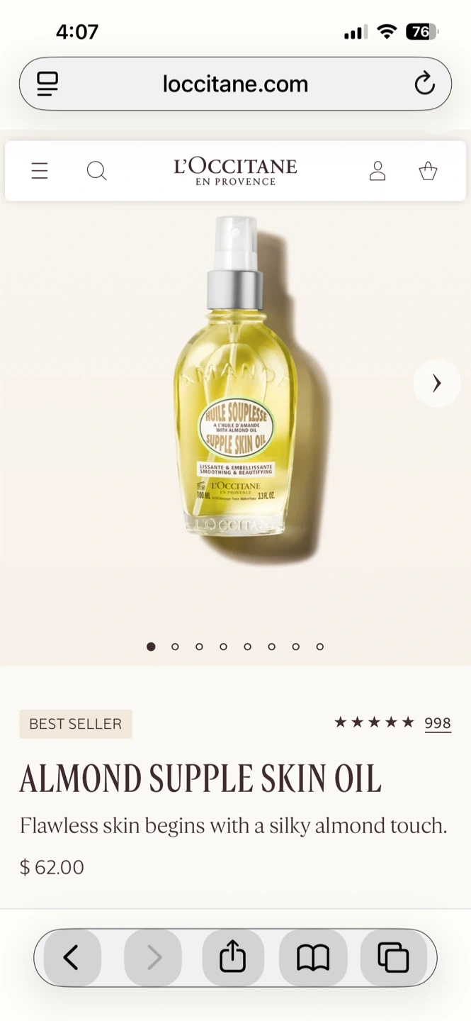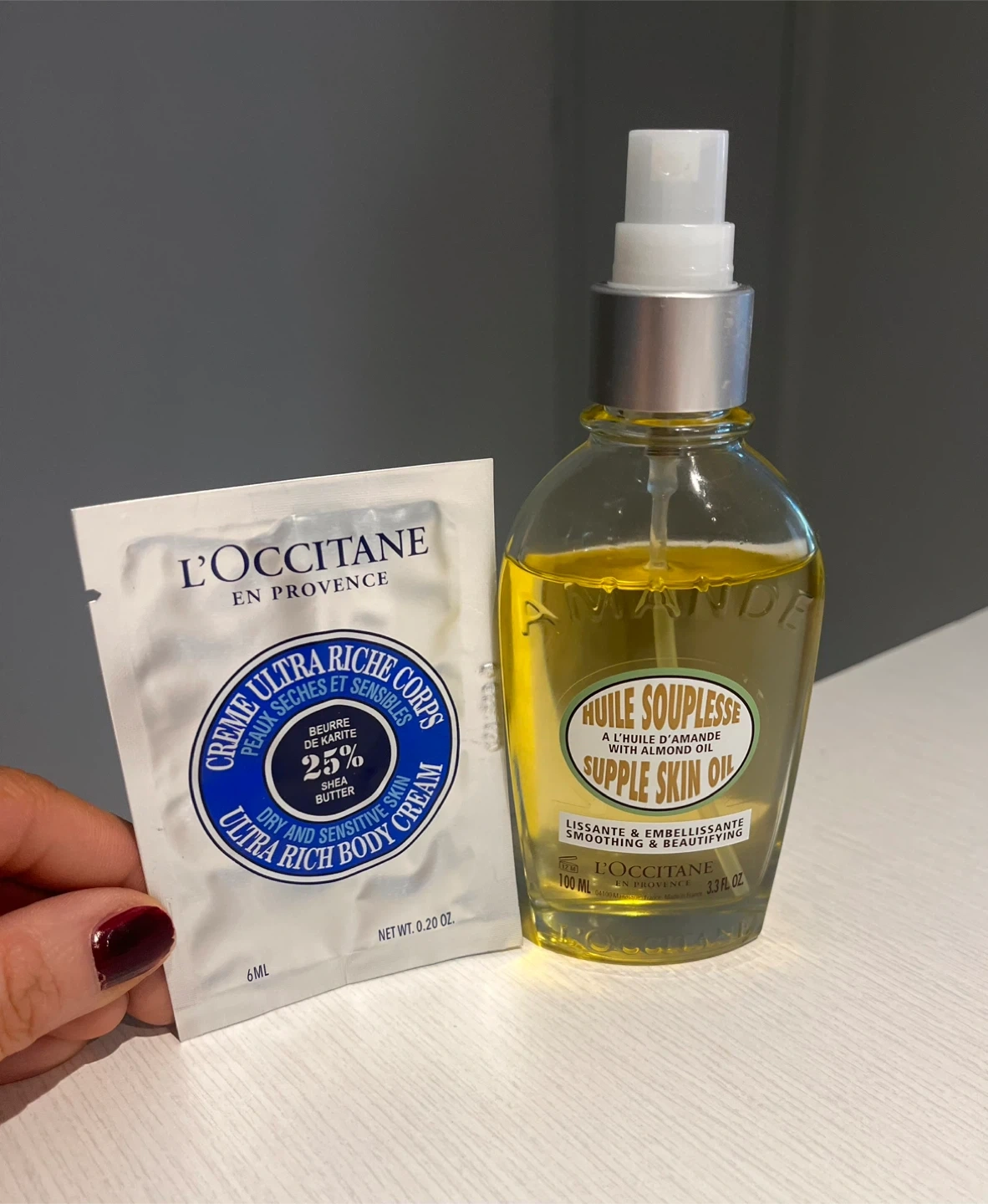 This L'Occitane Almond Supple Skin Oil is 100ml. It's a smoothing and beautifying dry oil for skin. Includes a bonus 6ml Ultra Rich Body Cream sample with 25% Shea Butter.