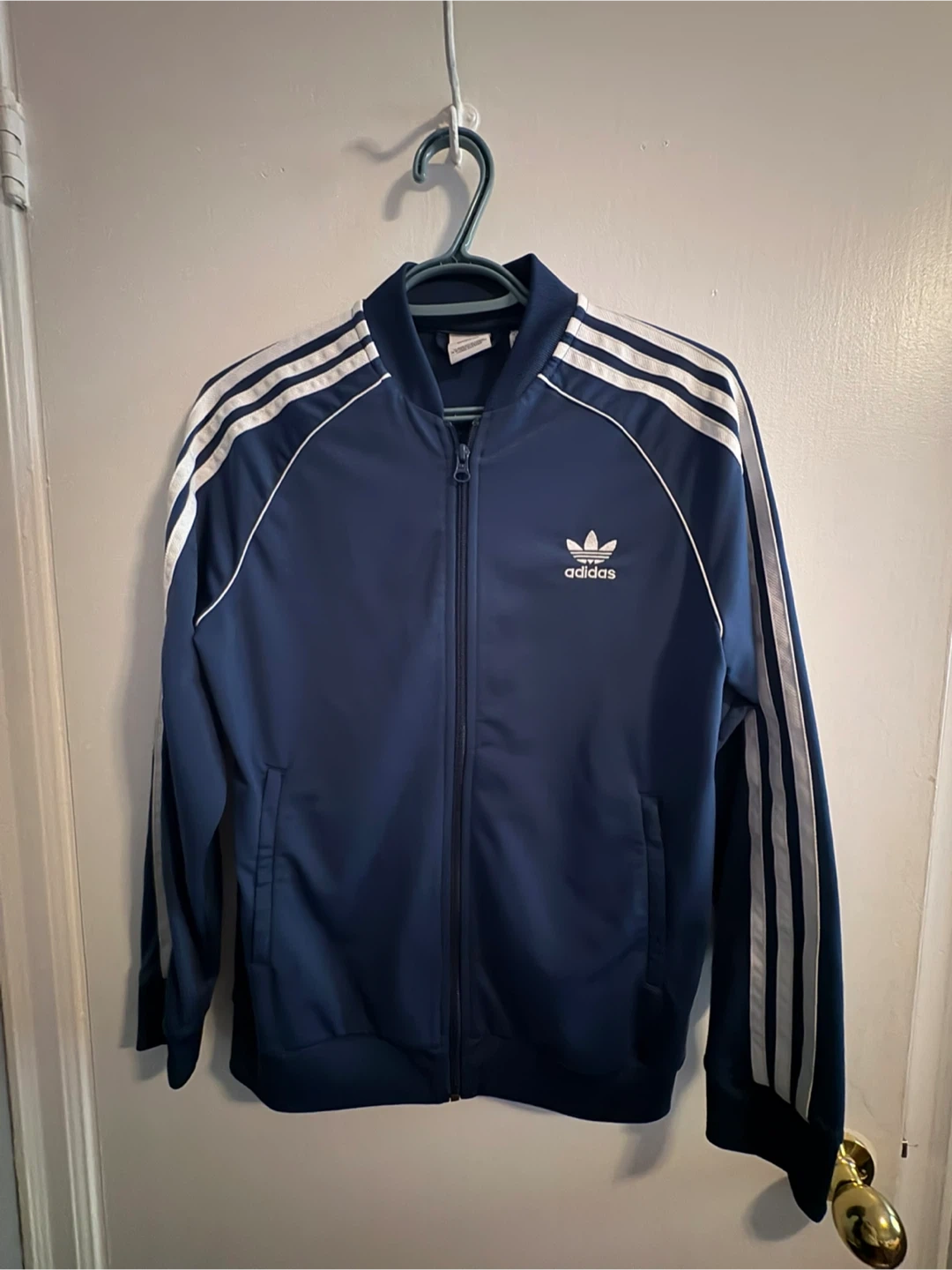 Classic Adidas track jacket in blue, youth size 12/13. Features the iconic three stripes down the sleeves and the Adidas logo.