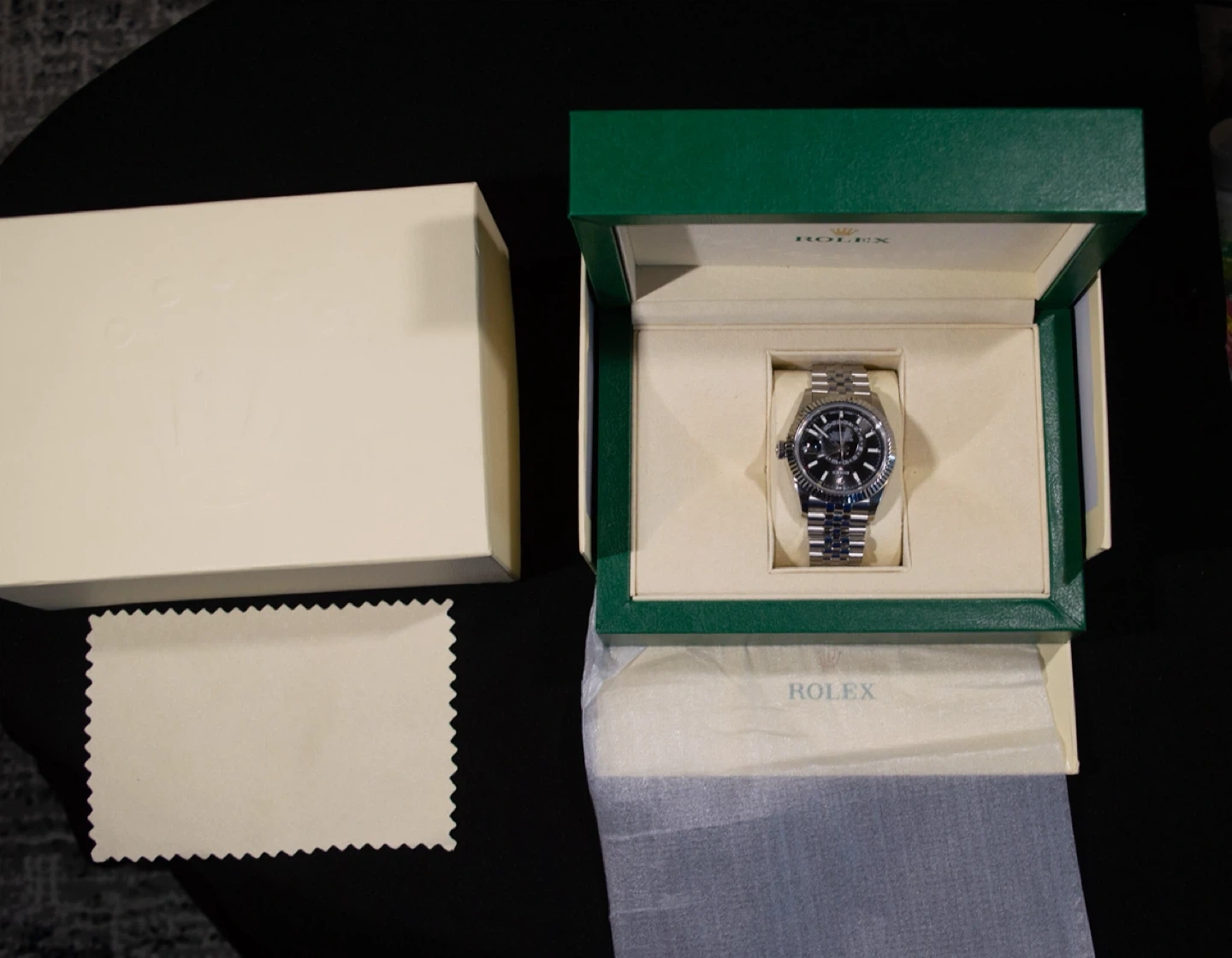 Selling a Rolex Oyster Perpetual GMT-Master II watch. It comes complete with the original box, warranty booklet, and polishing cloth. This timepiece features a stainless steel band and a black dial.