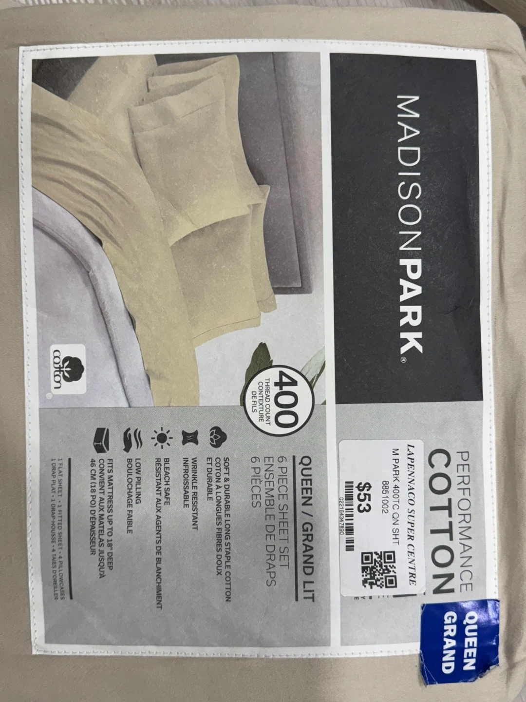 This Madison Park performance cotton sheet set comes with a 400 thread count. The set includes one flat sheet, one fitted sheet, and four pillowcases.