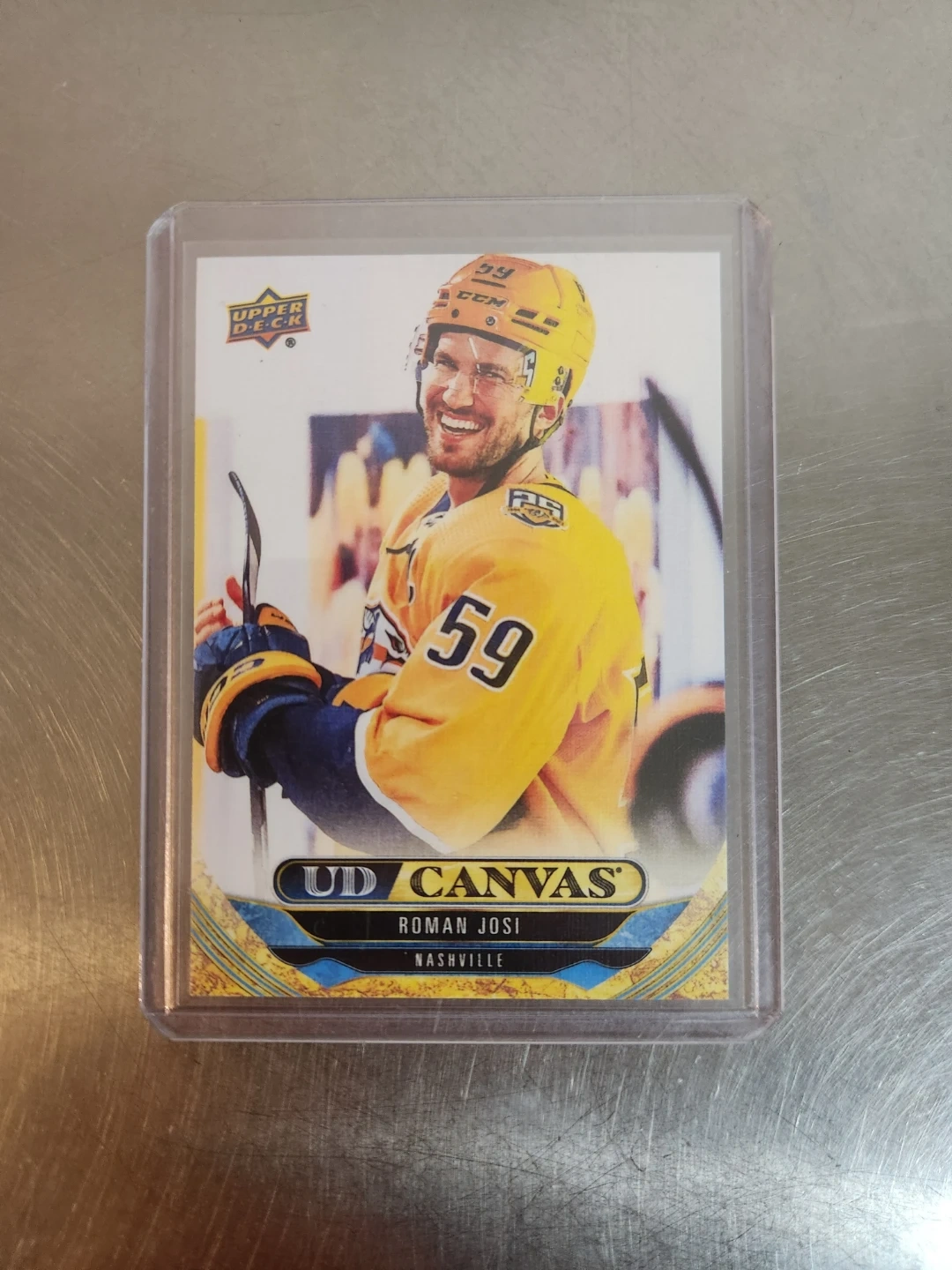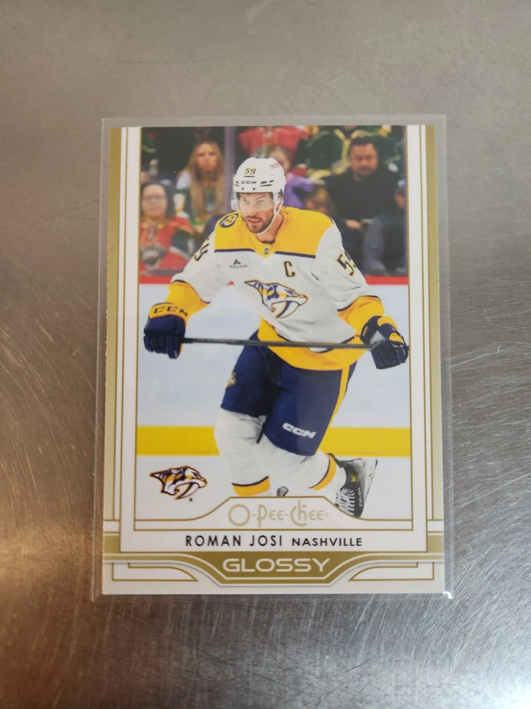 Collection of three Roman Josi hockey cards, featuring one UD Canvas card and two O-Pee-Chee Glossy cards. Perfect for any Nashville Predators fan looking to add to their collection. These cards showcase Roman Josi in his iconic Predators uniform.