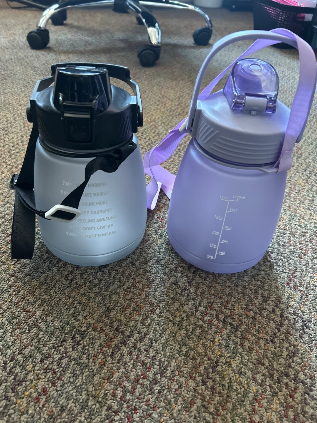 Two large water bottles, one light blue and one lavender, with motivational time markers. The lavender bottle holds up to 1300ml and the blue bottle also has volume markings. Both come with attached straps for easy carrying. They're great for staying hydrated throughout the day!