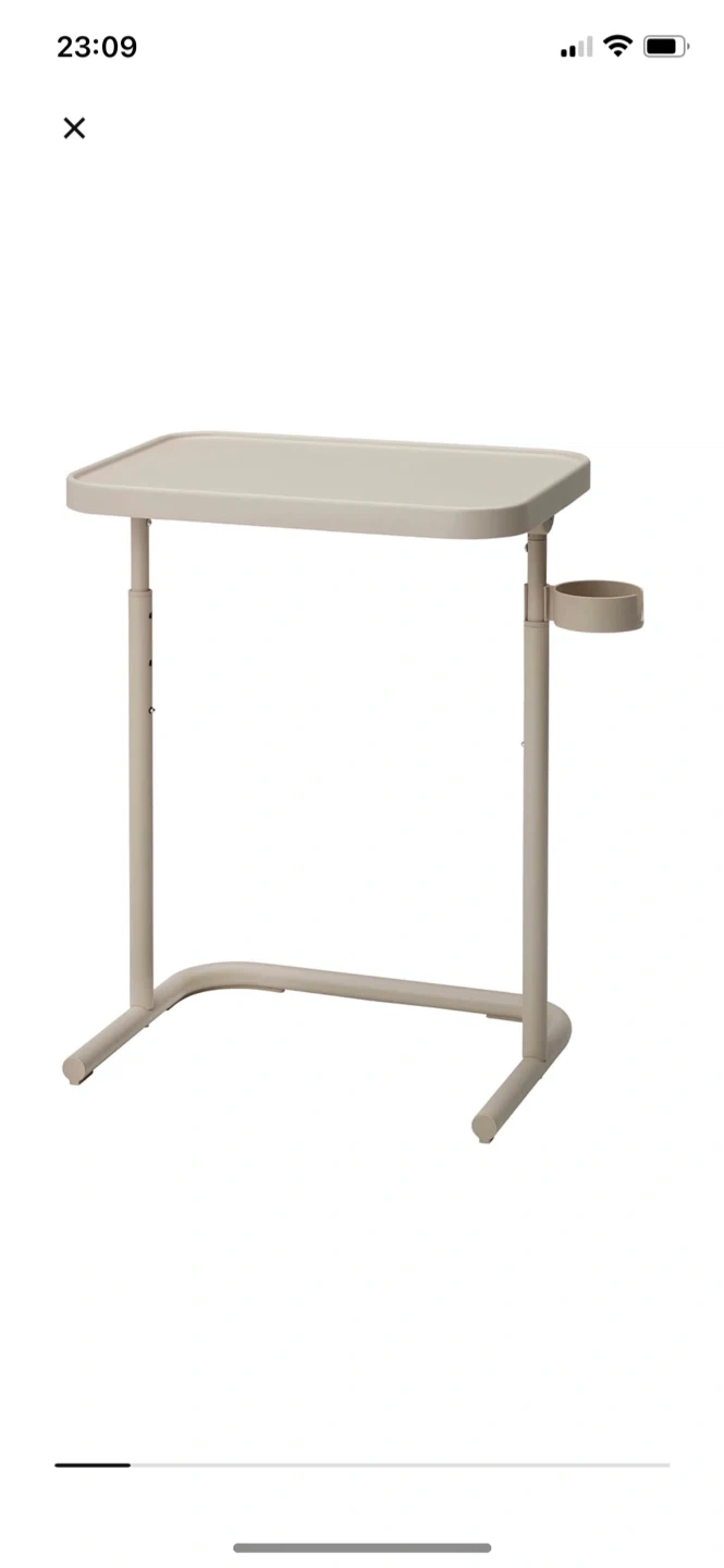 This beige bedside table is adjustable and includes a convenient cup holder. It's made of sturdy metal. This table is perfect for keeping essentials close by when you're in bed or relaxing on the couch.