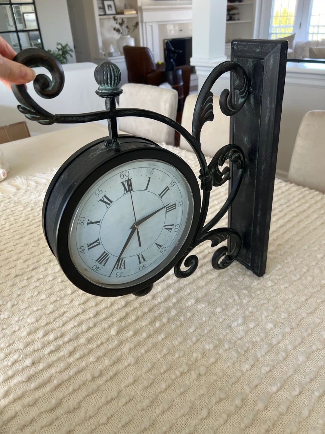 This is a black double-sided station clock with Roman numerals. It's made of metal with an antique finish. Mounts to a wall for a classic look.