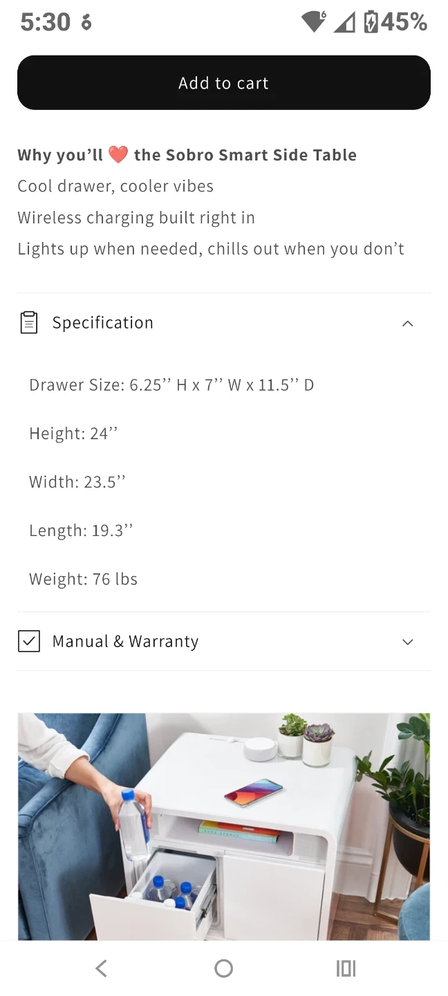 Sobro Smart Side Table - Cool Drawer & Wireless Charging