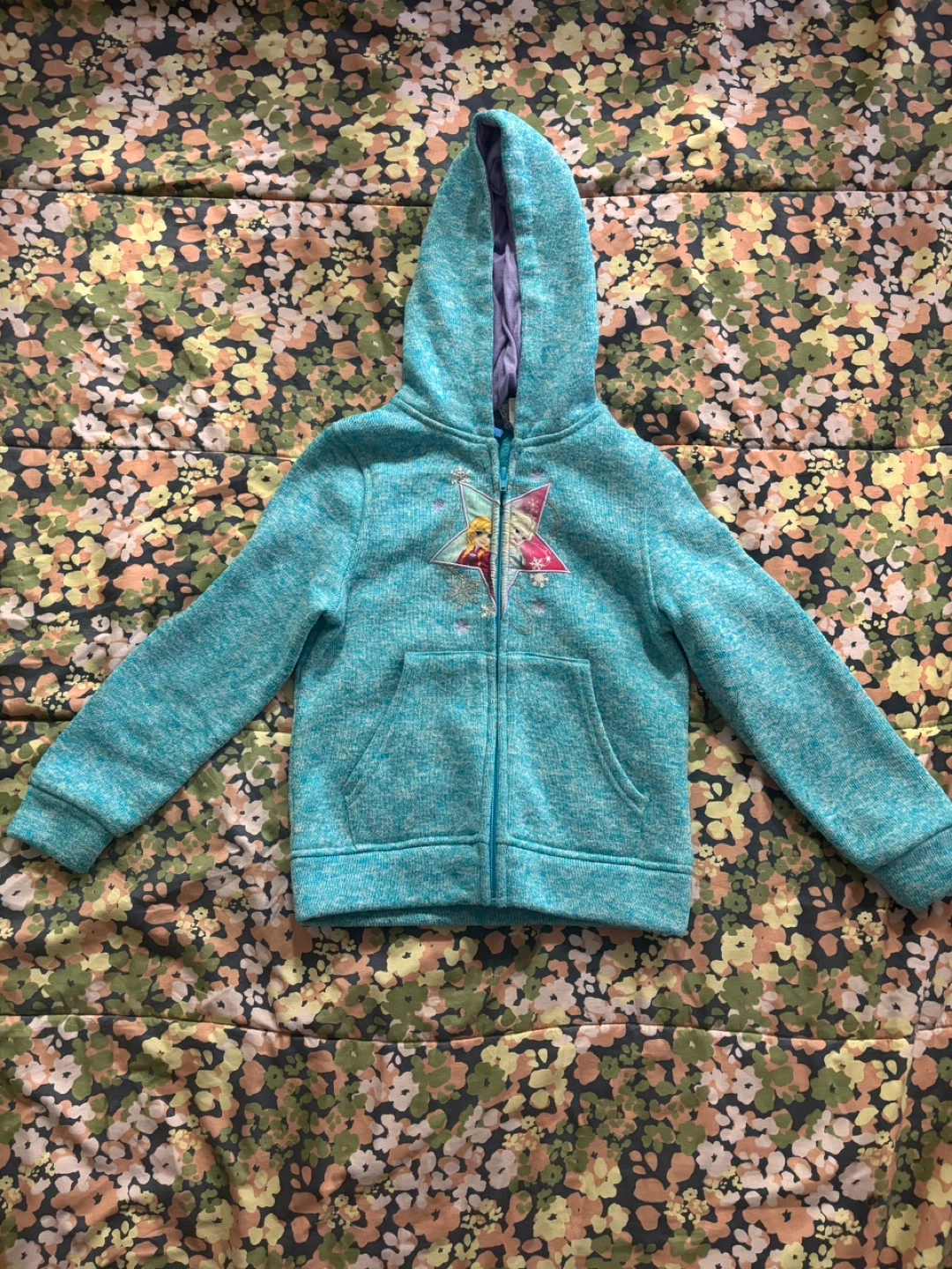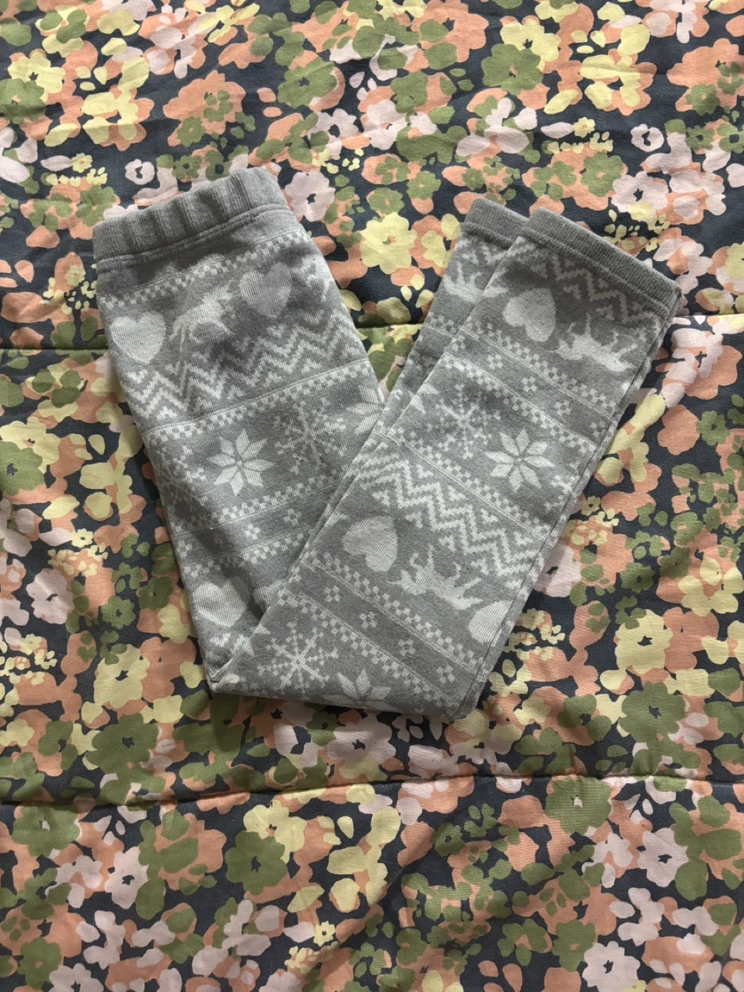 Selling a bundle of girls' clothing! Includes a cute tank top with a unicorn design, a pair of beige leggings, a pair of grey patterned leggings, and a blue zip-up hoodie. All in great condition and ready for a new home