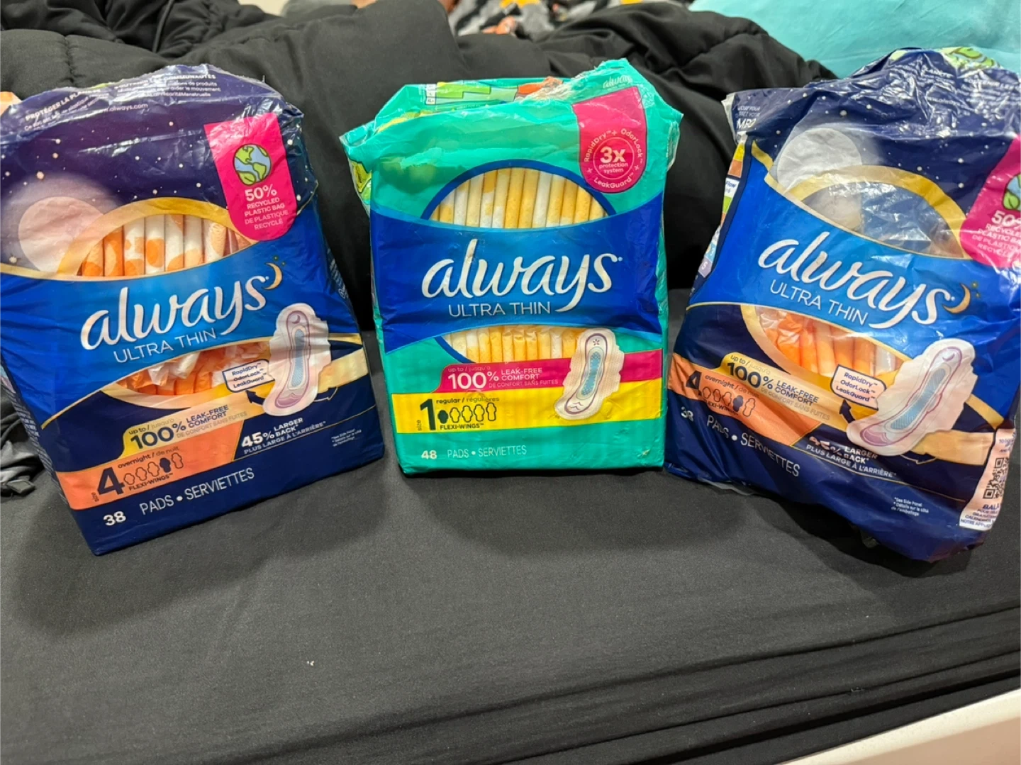 Selling 2 and a half packs of Always pads. 1 pack is regular and 1.5 are super nighttime pads. Over 100 pads. No longer need them.
