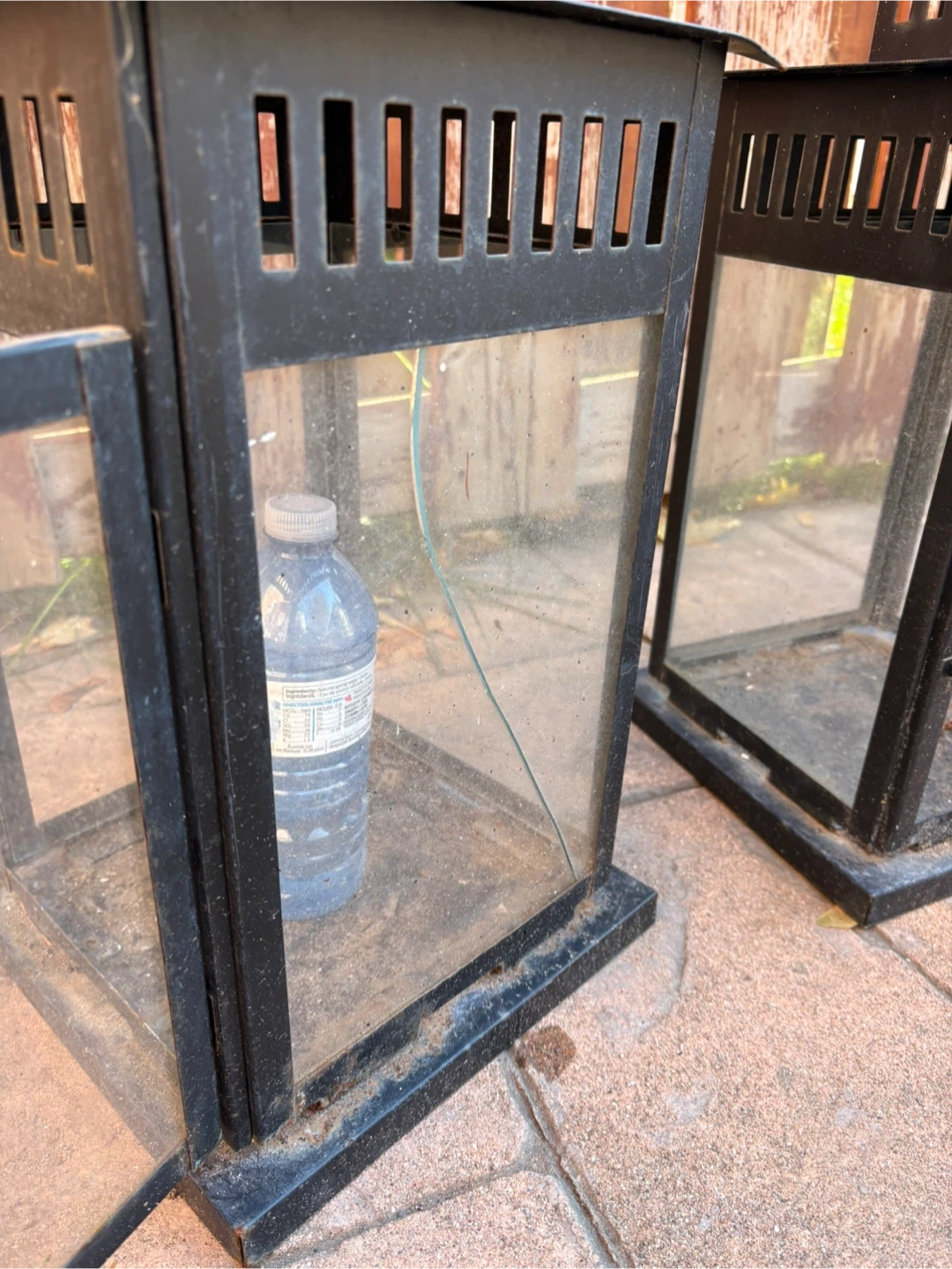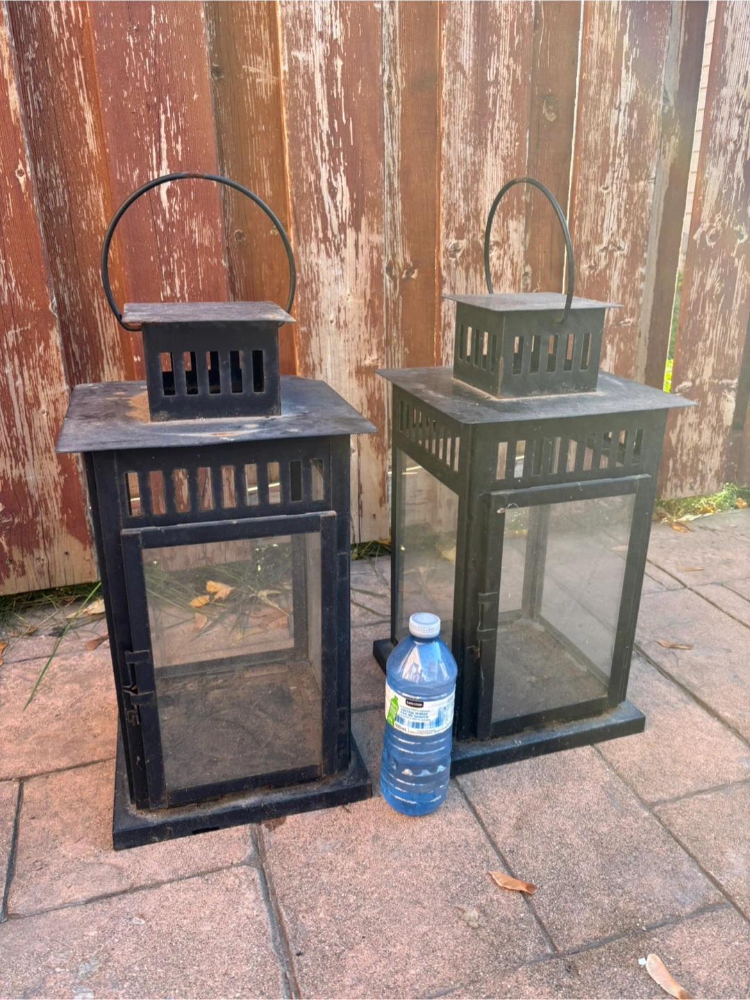 951Selling a set of two decorative lanterns! They're made of black metal and glass, perfect for adding a cozy touch to your space. One of the lanterns has a crack in the glass, but it doesn't affect its overall charm or functionality.