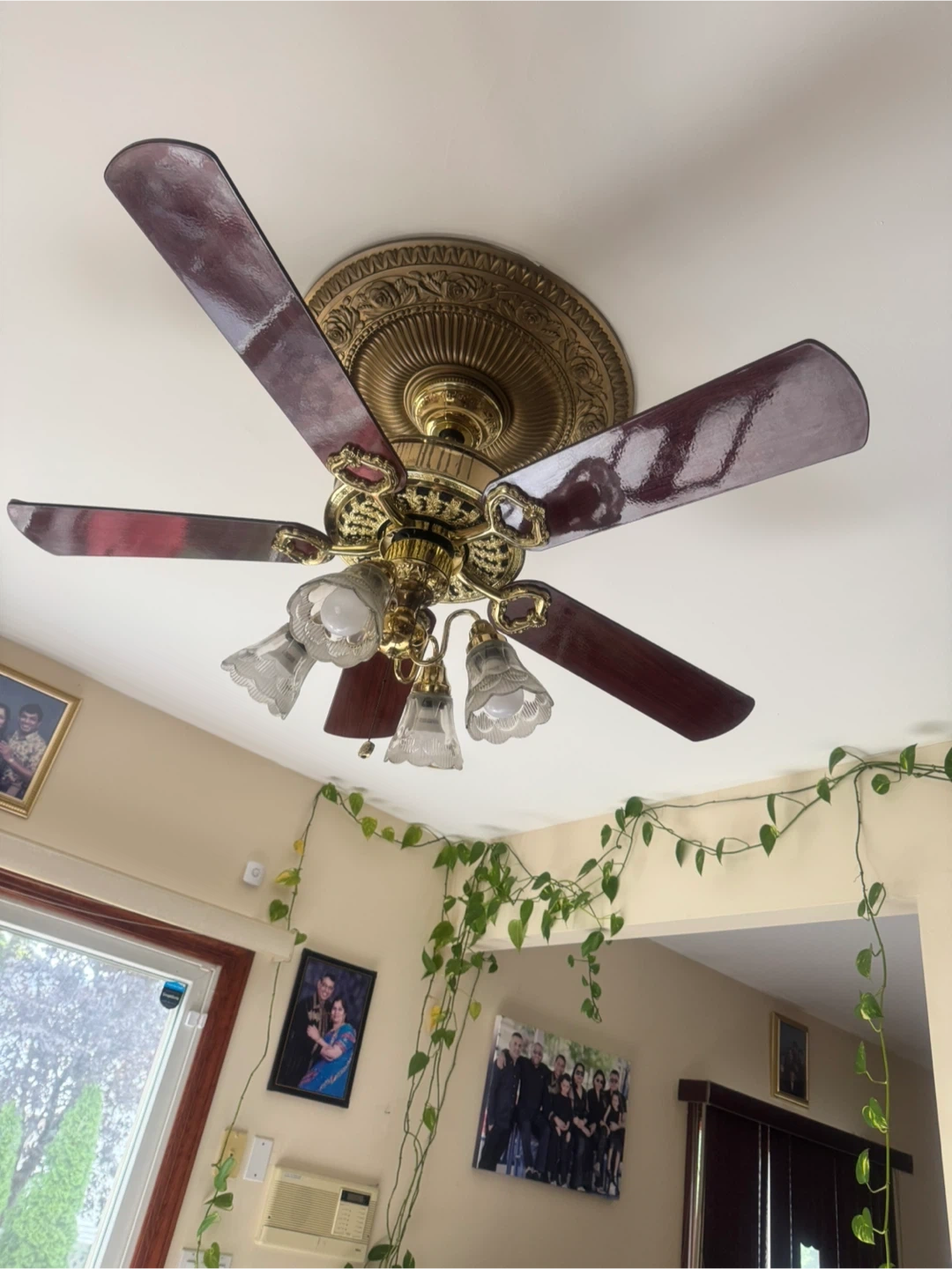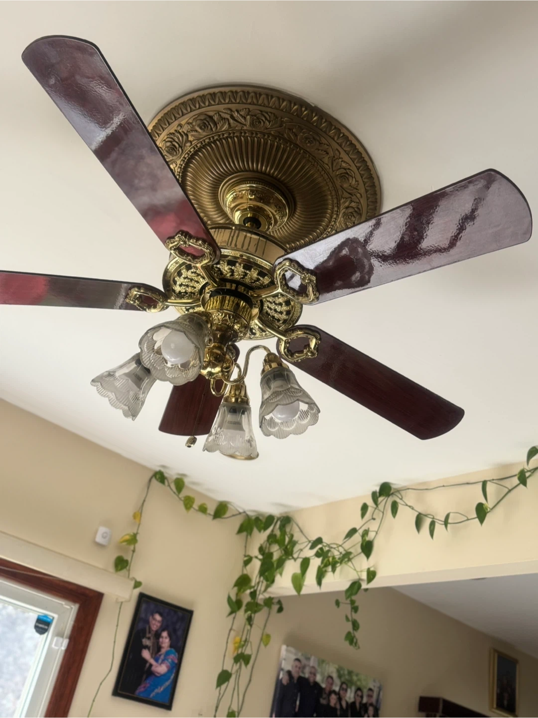 Selling a ceiling fan with attached lights. It has a gold-colored base and dark wood-colored fan blades. The light fixtures are clear glass.