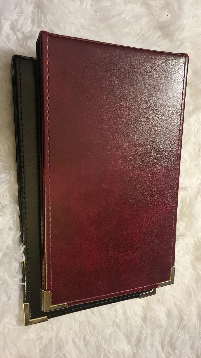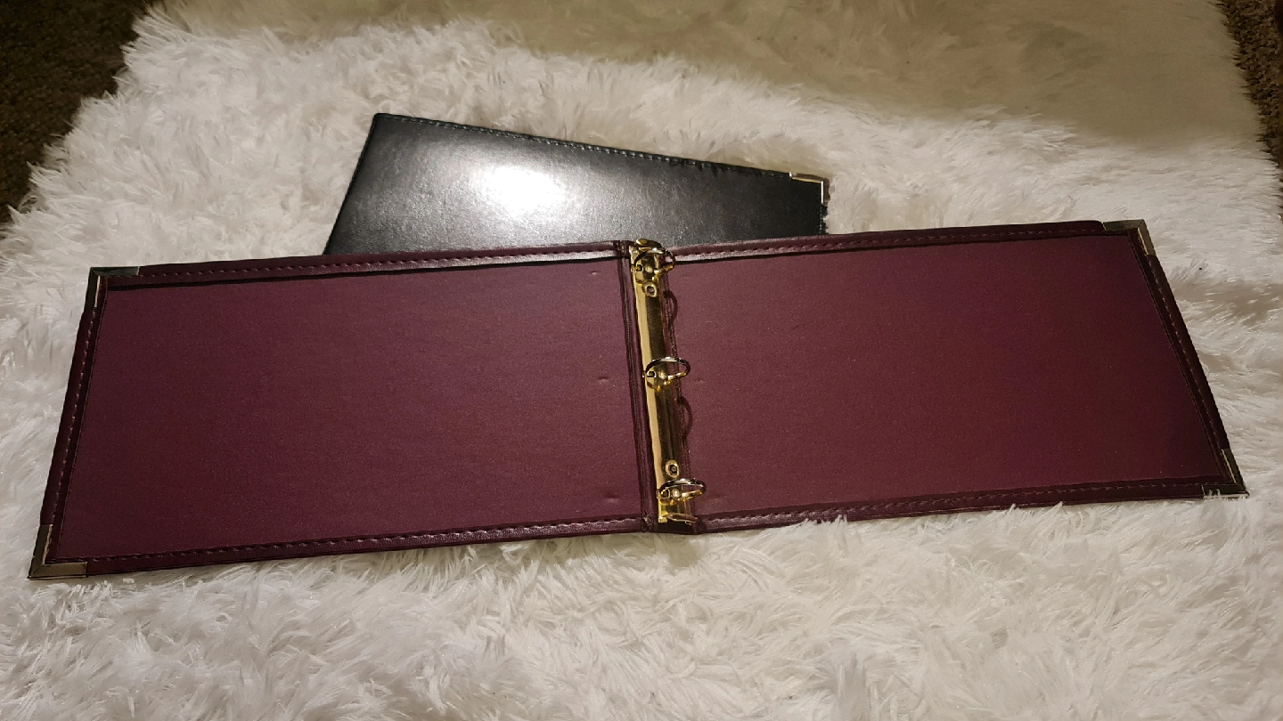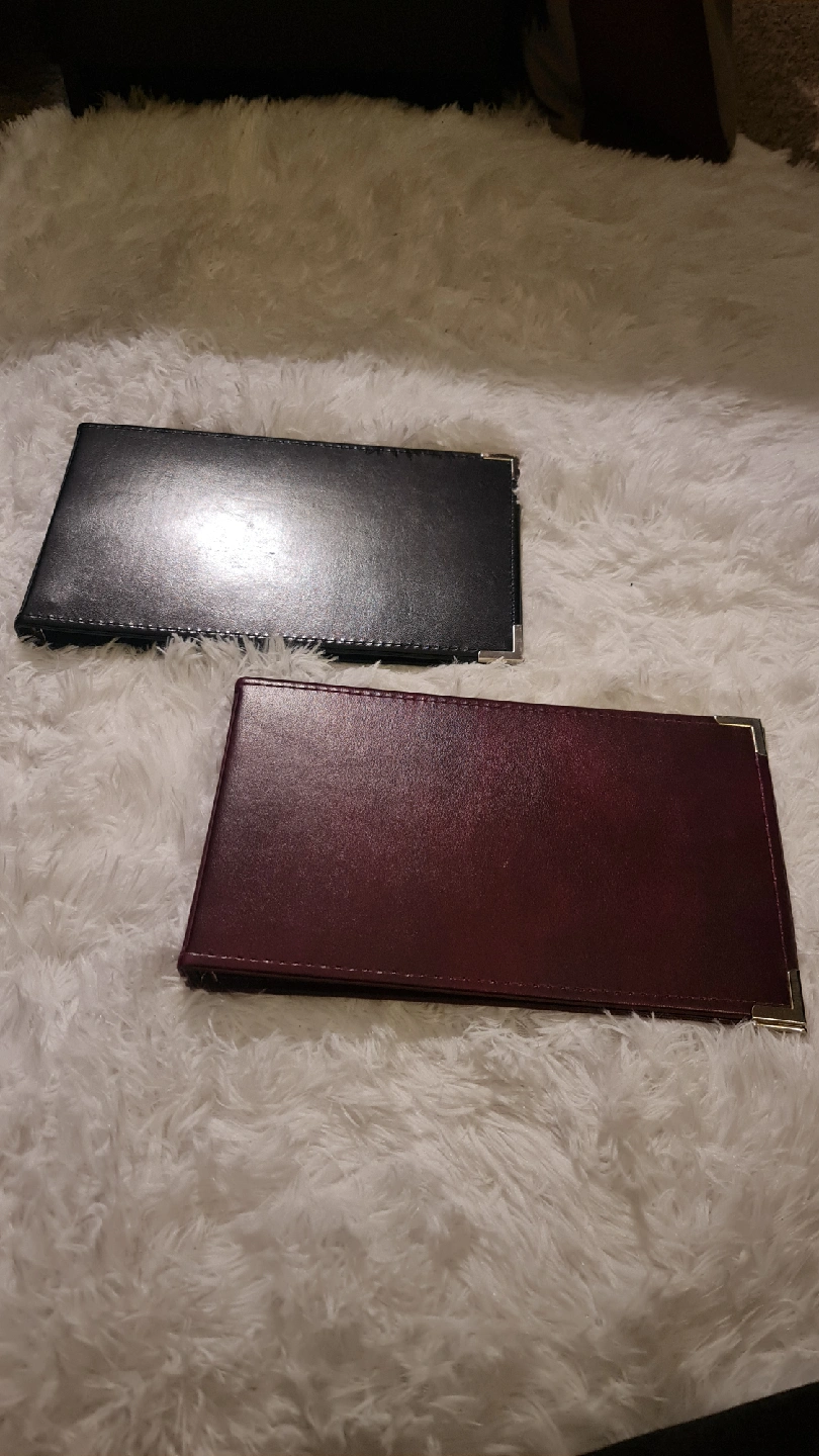 86Selling two check presenters - One is burgundy and the other is black. They both have gold corner accents and are in good condition. Black one has inner plastic pocket for paper or writing tools such as pens. All in all, they are slim-designed binders and can be used for whatever you like nowadays (e.g Scrap booking, photo albums, ect.) $5 FOR BOTH BINDERS