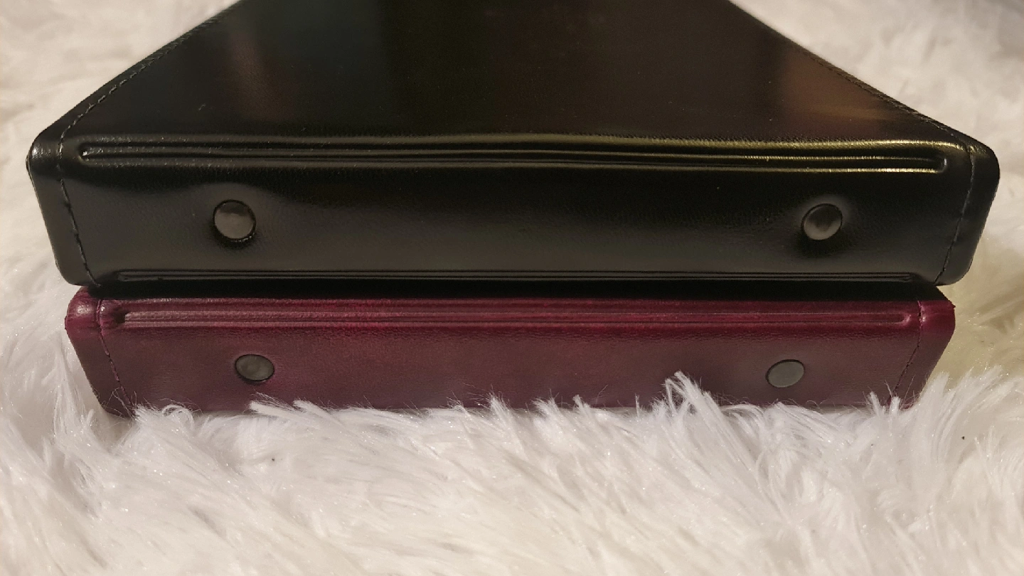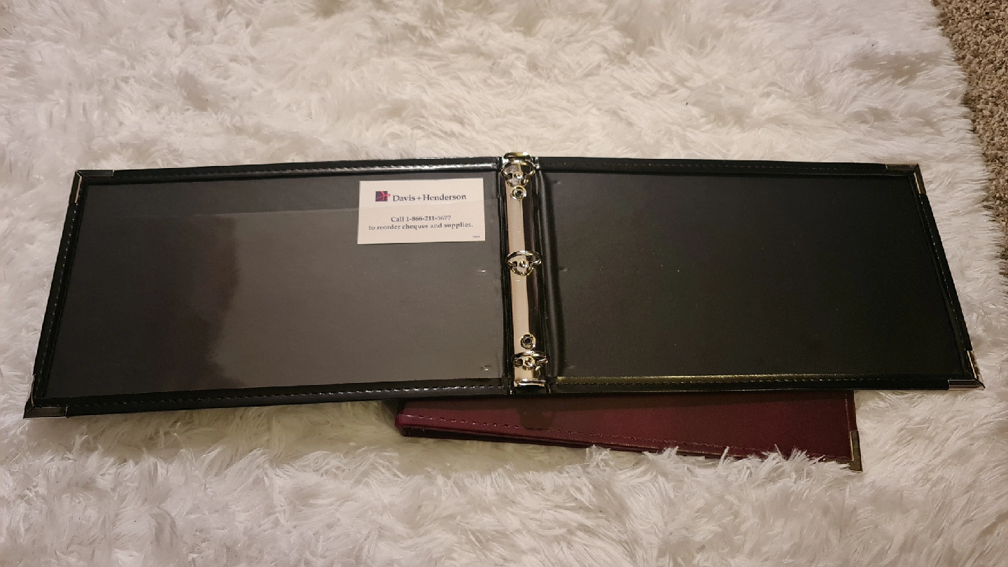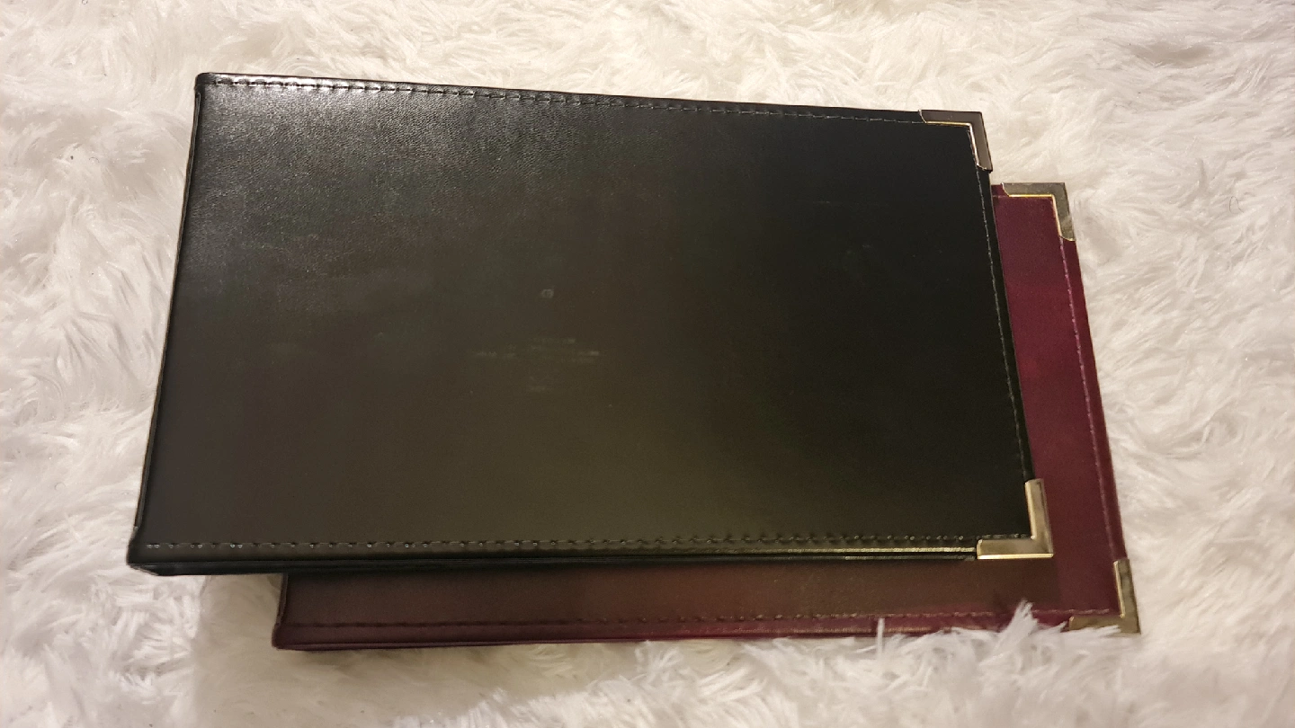 86Selling two check presenters - One is burgundy and the other is black. They both have gold corner accents and are in good condition. Black one has inner plastic pocket for paper or writing tools such as pens. All in all, they are slim-designed binders and can be used for whatever you like nowadays (e.g Scrap booking, photo albums, ect.) $5 FOR BOTH BINDERS